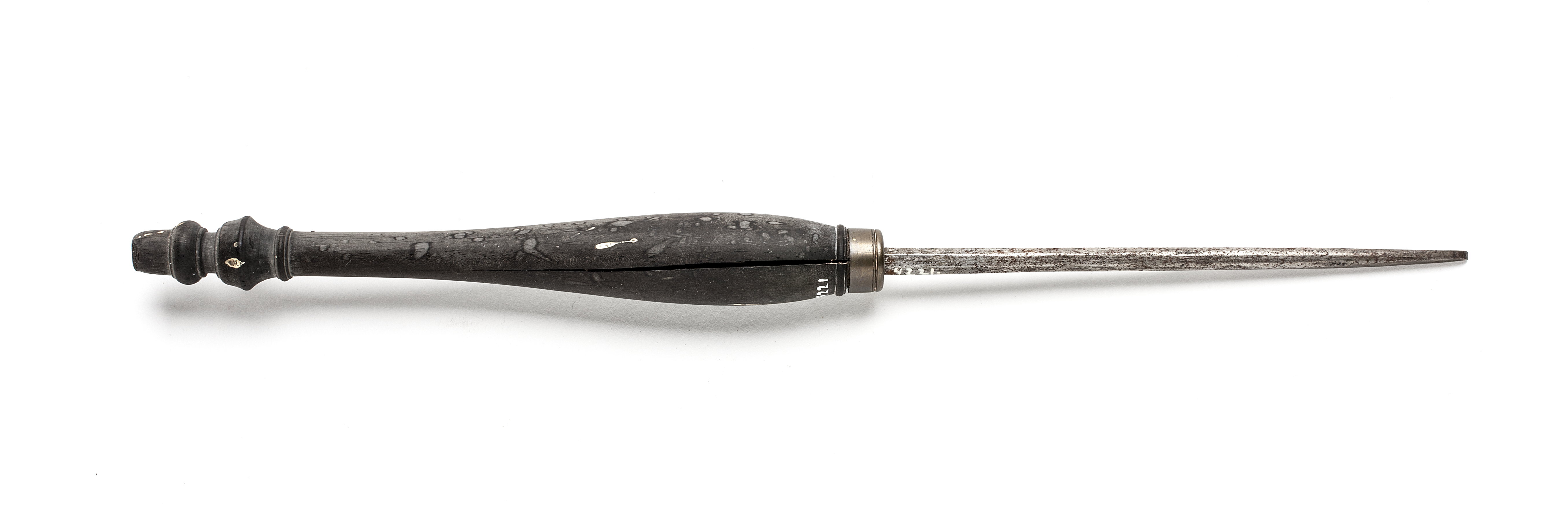 Åttkantig klinga. Eggen något slipad på ovansidan, rundad på undersidan. Svarvat skaft av ebenholts med profilerad ände, mässingsring.