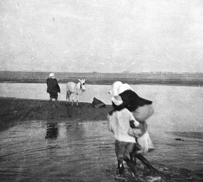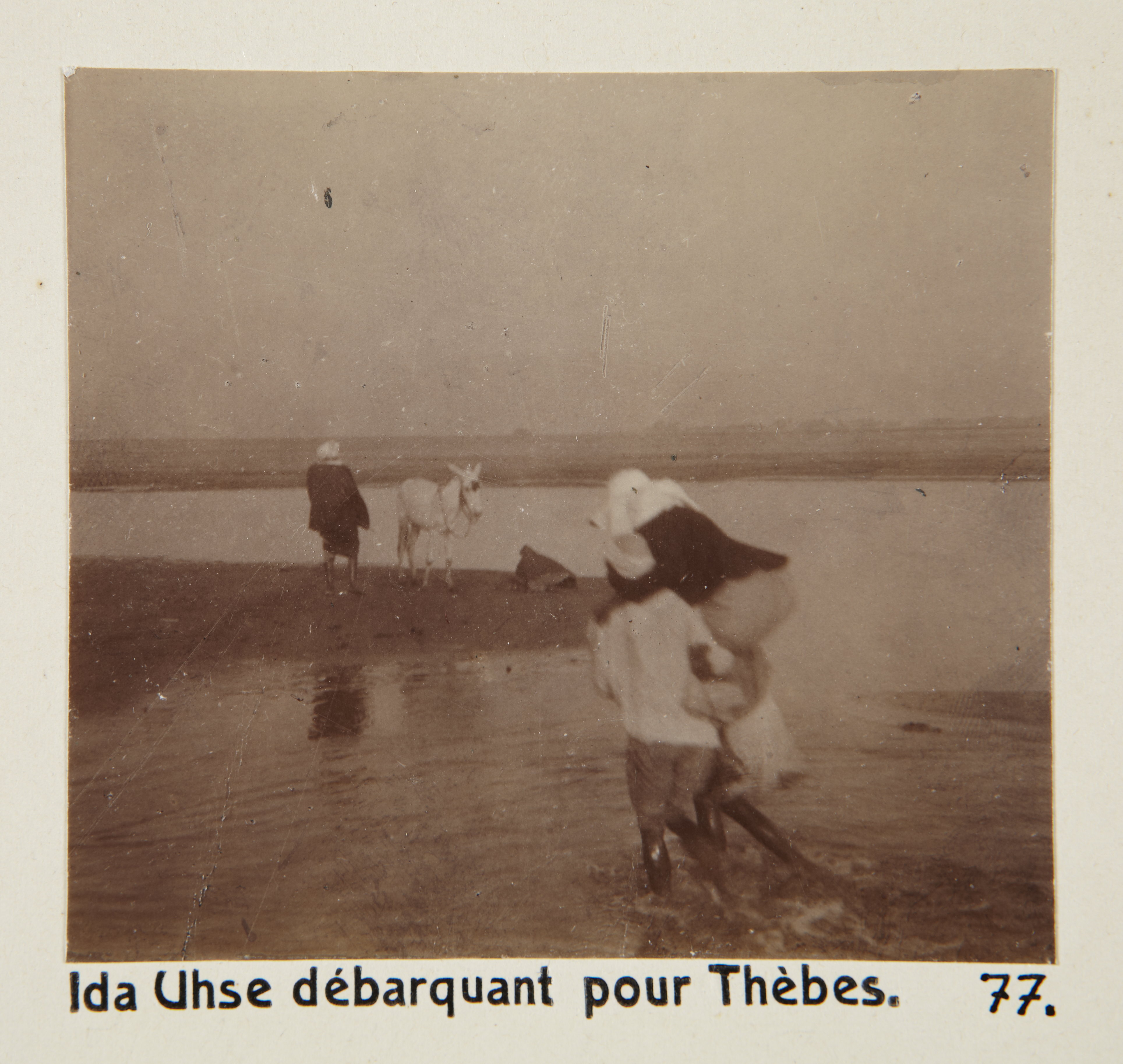 Ida Uhse går iland på väg mot Thebe, Egypten. Text på fotografiet: Ida Uhse débarquant pour Thèbes. Fotografierna LXVI:M.01.- 201. kommer från resan till Egypten och Sudan som Wilhelmina och Walther von Hallwyl gjorde vintern 1900-1901. De lämnade Sverige den 5 november 1900 och fortsatte från Egypten till Palestina den 28 mars 1901. Med på resan var döttrarna Ellen med maken Henric de Maré och Irma med maken Wilhelm von Geijer. Wilhelminas sällskapsdam, fröken Ida Uhse reste också med. Under en del av resan anslöt sig ledamoten av Internationella domstolen i Kairo, assessorn Otto Conrad Waldemar Cedercrantz med makan Anna Elisabeth. Vid resan uppför Nilen hade Walther von Hallwyl hyrt ångfartyget Columbia med besättning. Båtresan startade i Kairo 27 december 1900, gick ända till Wadi Halfa varifrån man reste vidare med tåg till Khartum och tillbaka till Wadi Halfa. Båten vände åter i riktning mot Kairo, men det verkar som att sällskapet tog tåg sista biten, från Luxor. Henric och Ellen de Maré samt fru Cedercrantz lämnade båten redan då de passerade Luxor första gången. Resten av sällskapet återvände till Kairo den 1 mars. Fotografierna LXVI:M.01.-120. togs av resenärerna själva, de största av Ellen de Maré, de mellersta av Wilhelmina von Hallwyl och de minsta av Wilhelm von Geijer. Resten köptes av professionella fotografer i Kairo, de flesta från Studio Photogr. Artistique G. Lekegian & Cie. Alla uppgifter kommer från Ida Uhses reseanteckningar.