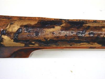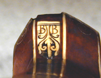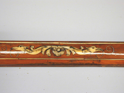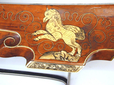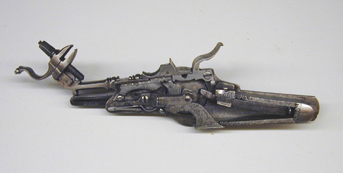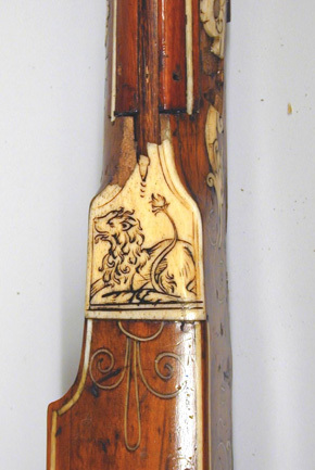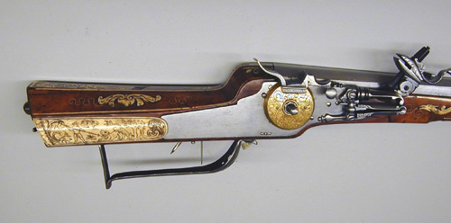 Åttsidig, nioräfflad pipa med trumf. Kort, baktill tvärt avskuret svansskruvblad. Riktmedel: Klaffsikte med en klaff, stolpkorn, båda inlaxade. Fästning: Bakre häftet saknas. Pipan fäst med krysskruv underifrån (främre varbygelskruven) samt ett pipstift av stål, bakre pipstiftet av ben bevarat till hälften. Hjullås med plant låsbleck, rundad bakände. Utvändigt hjul. Svagt välvd hjulkapsel av mässing med punsad rankdekor, fasad kant med räfflad kantring närmast låsblecket. Fängpanna med svagt svängd gavel, s-formigt svängd krutskärm. Fängpannelock med rörlig arm, graverad rankdekor på locket, plattan framtill med konturerad överkant, genombruten av ett runt hål, skålat fingergrepp med ihoptryckt, urneformigt löv. Tryckknapp med svagt välvt huvud, punsad dekor, balusterformig kropp. Hane med kropp med kraftigt profilerad bakre del i fem filade ringar, åsad främre del med liten stödvolut. Hals i form av skiva med fasad kant, stämplad mittdekor (skivan möjligen ej ursprunglig, lödd med mässingslod. Underkäken slät utan dekor. Överkäke med graverad streckdekor, liten skärm graverad som fågel. S-formigt svängd arm med fasad kanter, tvär avslutning med två kulor, den inre större. Hanfjäder med fasade kanter, skålning i vinkeln, baktill bladdekor, långt, välvt löv med avslutning i form av kula på sockel. Balusterformig hanstudel. Invändiga låsdelar med graverad, filad och punsad dekor, avtryckarstången blånerad. Fästning: Två låsskruvar. Avtryckare med snälltryck, den bakre avtryckaren böjd i vinkel, genombruten av ett runt hål och avslutad med liten kula. Rektangulärt avtryckarbleck. Helstock av ljust brunt trä, kolv av tysk typ med kolvlåda och vinge med volut. Kolvkappa och stötkula av horn. Kantlister och inläggningar av graverat ben i form av plattor och tunna slingor. Graverad signering B B på plattan bakom svansskruvbladet. Kolvlådelock helt täckt av benplatta med graverad jaktscen i naivistiskt utförande (ursprunglig), jägare med spjut riktat mot lejon vars bakkropp attackeras av hund?, antytt landskap, i båda ändar akantusdekor. Plan kolvrygg med tre skålade nedskärningar, ifrån svansskruv och kolvände utskjutande spjut med två ringar på skaftet, vid kolvänden ett fyrfota djur. På anslaget en bevingad (?) häst med griphuvud. På vingen en rektangulär platt med rankdekor och ansikte i mitten. Låsskruvbrickor i form av rankverk, den främre avslutade framåt, den bakre bakåt med groteska djurhuvuden. Vid kolvens framände över laddstocksnotens bakre ände en platta med ett liggande lejon. Pipstiftbrickor i form av rankverk avslutade framåt och bakåt av de groteska djurhuvudena. På v sida däremellan en springande hund och en räv, på h sida en hund och en hare. Näsband och överrörka av vitare ben med akantusdekor. Skålformig varbygel framtill utvidgad till en droppformig skål genombruten med fyra större och fem mindre runda hål, ett av de stora lansettformigt. Tillbehör: Laddstock av mörkare brunt trä, l: 757 mm, framtill skodd med ben, l: 25 mm, enkel akantusdekor. Anmärkning: De två bakre rörkorna saknas, även laxningen för det mellersta. Hanhalsen möjligen reparerad, underkäken slät utan dekor. Benplattan på vingens kant ersatt. Ett stycke av benlisten till v om svansskruvpladet saknas. Spetsrörkans främre del saknas. Framstocken limmad och förstärkt med väv invändigt. Kant och benlist saknas baktill på pipnotens v sida. Delar av bakre pipstiftplattan på v sida saknas liksom inskjutande trä. Flera nya träbitar tillfogade längs pip- och laddstocksnotens kanter. Näsband och överrörka möjligen ej ursprungliga, framstocken slutar 15 mm från mynningen.