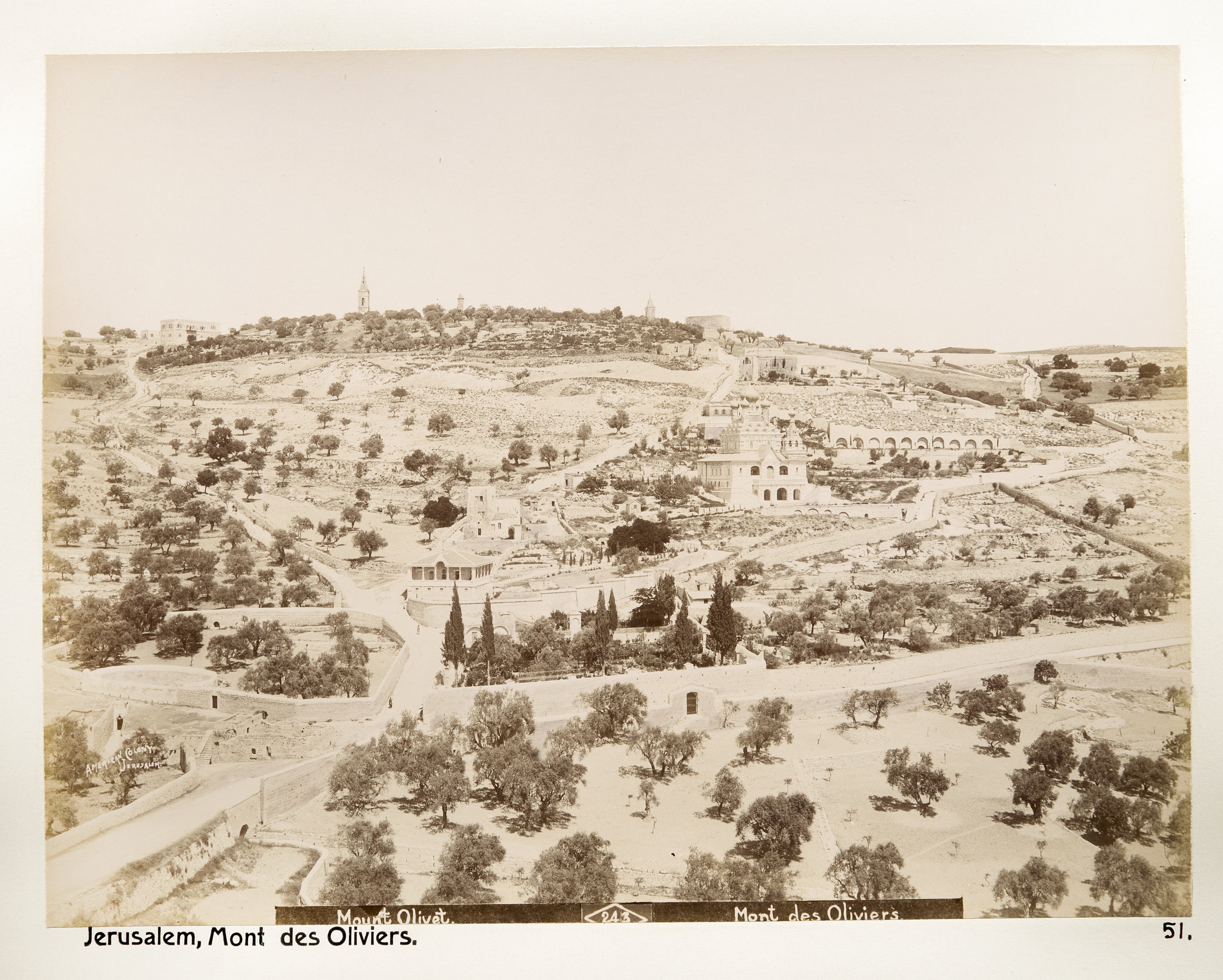Olivberget, Jerusalem. Text på originalet: "Mount Olivet/Mont des Olivier". Fotografierna LXVI:N.01.-180. kommer från resan till Palestina och Syrien som Wilhelmina och Walther von Hallwyl gjorde den 30 mars-27 april 1901. De lämnade Sverige den 5 november 1900 för Egypten, där de stannade till den 28 mars 1901, då de fortsatte till Palestina. Med på resan var Wilhelminas sällskapsdam, fröken Ida Uhse. Den 27 april fortsatte de till Turkiet och Mindre Asien. De mindre fotografierna (utom de från Samos) LXVI:N.90.-100. är tagna av Wilhelmina själv, under en resa till häst från Jerusalem till Damaskus 8-20 april 1901. Övriga fotografier är inköpta av Wilhelmina i Jerusalem, Damaskus och Beirut. Alla uppgifter kommer från Ida Uhses reseanteckningar.