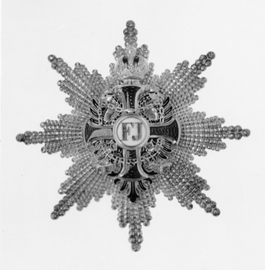 Åttauddig flinkerad välvd strålstjärna av silver med uppböjda spetsar. Därpå fäst ordenskorset, ett rödemaljerat kors av guld med breddade spetsar. Därbakom den österrikiska krönta dubbelörnen av guld och svart emalj, i näbbarna en kedja hängande över de vertikala korsarmarna och bakom de horisontella. På kedjan nertill: "VIRIBUS UNITIS". Rund vitemaljerad, guldkantad medaljong, därpå fäst: F J av guld. Korset krönt med den österrikiska kejsarkronan av guld och röd emalj med nedhängande fladdrande band. På frånsidan runt firmamärke av silver. Österrikiska lilla riksvapnet, omskrift:"VINC. MAYERS SÖHNE.WIEN". Vertikalt placerad säkerhetsnål, på nålen stämplat 2 ggr: "A".Till vänster om firmamärket stämplat: G, på den övre spetsen: 2 manshuvud A, på den nedre:VM.