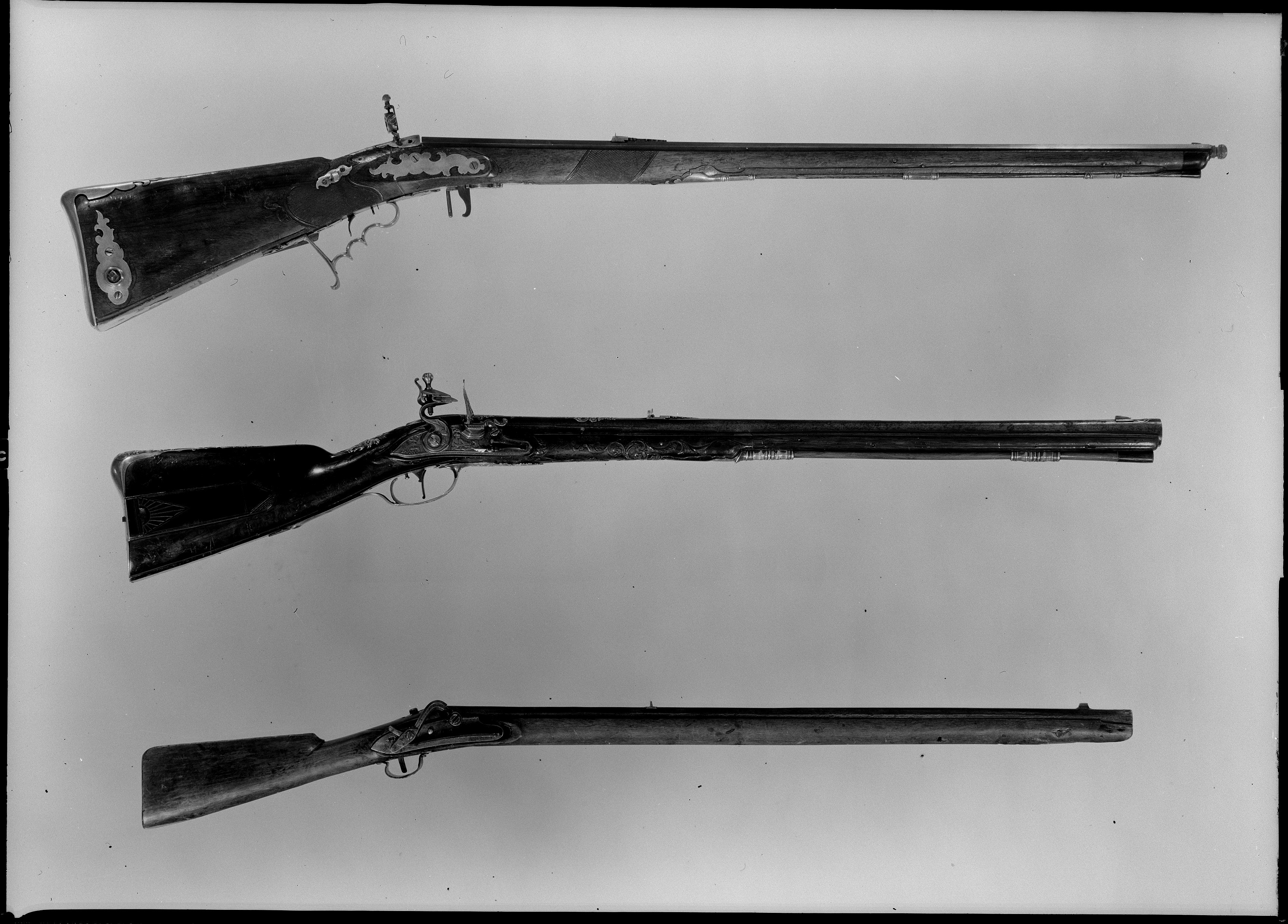 Åttsidig, blånerad pipa. Löst svansskruvblad av mässing. Luftkanal av mässing till blåsbälgen. Riktmedel: Centrerbart sikte av blånerat stål på svansskruvbladet, centrering med tre skruvar. Korn av mässing. Blåsbälg av dubbla lager pergament. Spänning med kedja om en axel, uppdragning med nyckel på h. sida (nyckeln saknas). Slagfjäder under bälgen. Avtryckare: Avtryckare med snälltryck. Kraftig helstock av valnöt, kolv med plan undersida och kraftig kindstöd, nätskuren på halsen och framstockens bakre del, snidad blomma på anslaget. Beslag av mässing. Bakplåt fäst med tre skruvar, separat tåbeslag. Runt uppdragningsaxeln ett konturerat, platt beslag, motsvarande beslag på anslagssidan. På anslaget dessutom ytterligare ett beslag, två skruvar, den bakre skruvens huvud med kryss och dekor i stålsnitt. Konturerat sidbleck och "låsbleck" av samma form. Avtryckarbleck av mässing, kraftigt profilerad varbygel med trefingerlägen. Framför varbygeln en (falsk?) avtryckare med säkring av stål, bleck av mässing. Trekantiga rörkor, spetsrörka med lång, konturerarad, slät spets. Näsband av horn. Tillbehör: Laddstock med hornskoning, l: 510 mm (jakaranda?). Pipskydd, l: 822 mm, av ek, lindad med svart sammetsband i bakre änden, svarvad knopp i den främre.