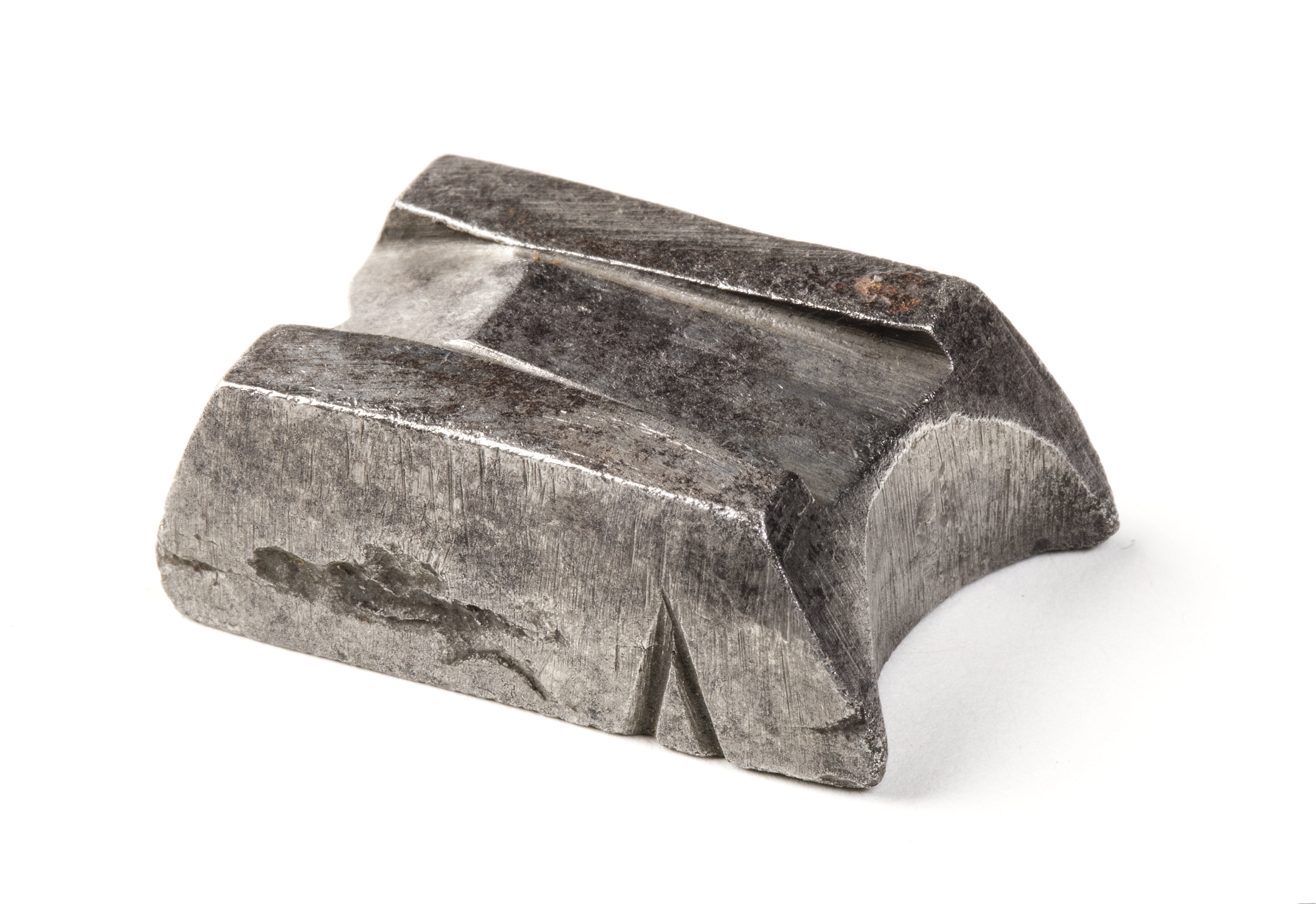 Profileringsstål, bråde, till en maskin för dragning av blylister till fönster. Prismaform. V-formigt urtag i ena änden, bågformigt i den andra. Undersidan är märkt med en punkt och ena långsidan med V. På ovansidan prismaformigt urtag från båda kortsidan mot en ås--år. Ett spår på var sida av profilen.