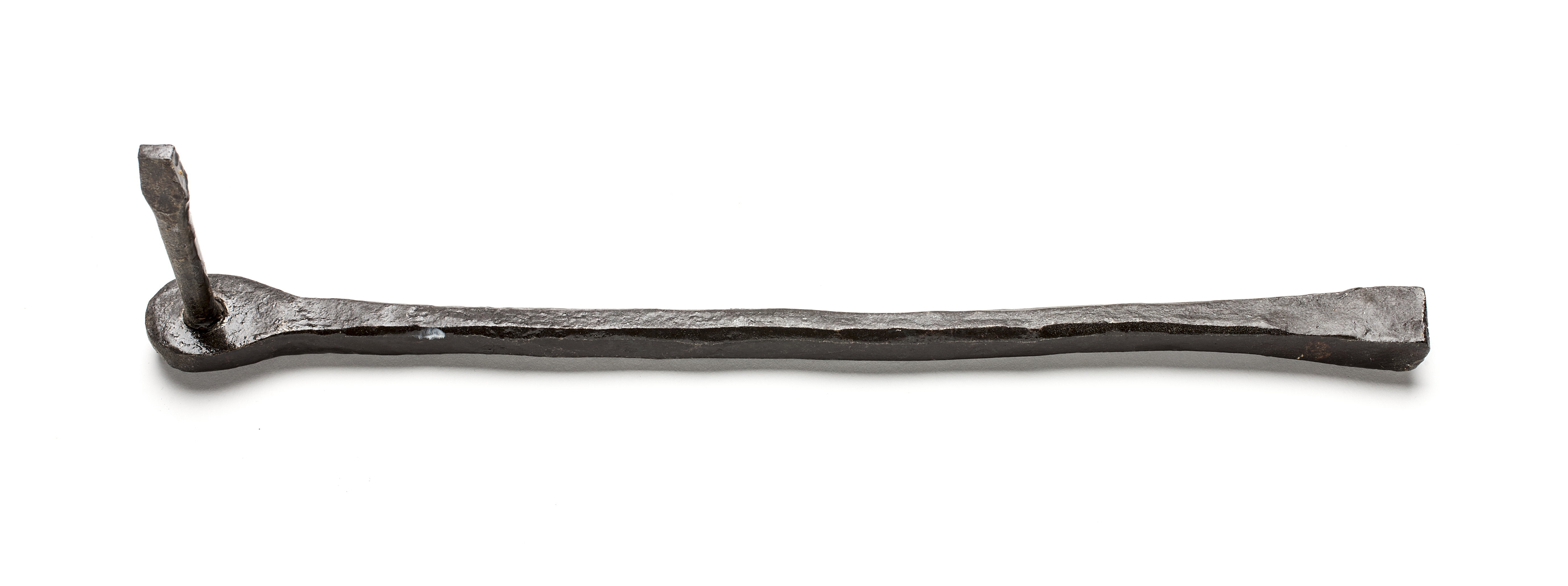 Oval platta, ca 40 mm långt, fyrsidigt skaft, breddat i övre änden. Gänghål med 10 mm diam och kvarsittande gängtapp, 80 mm lång.