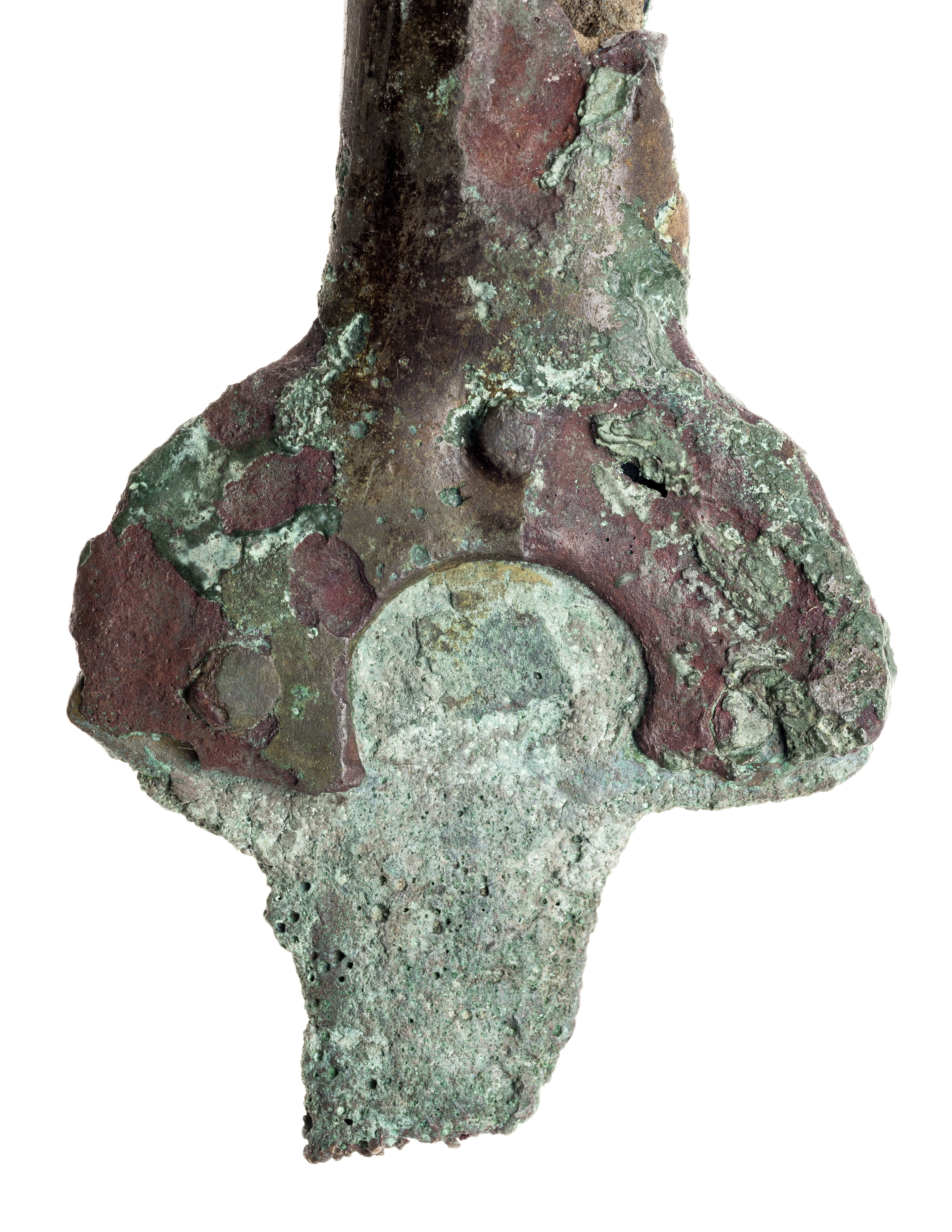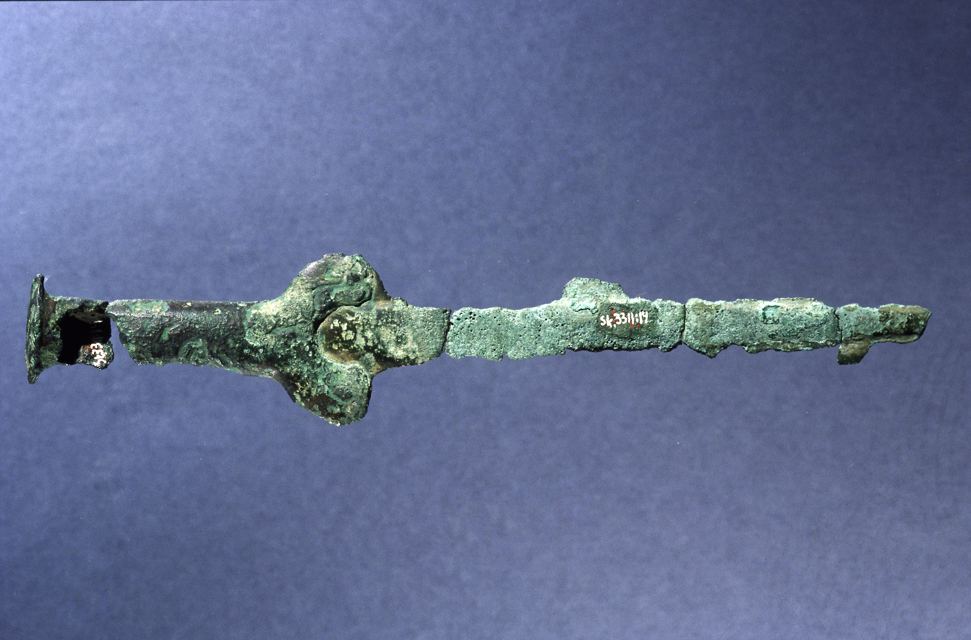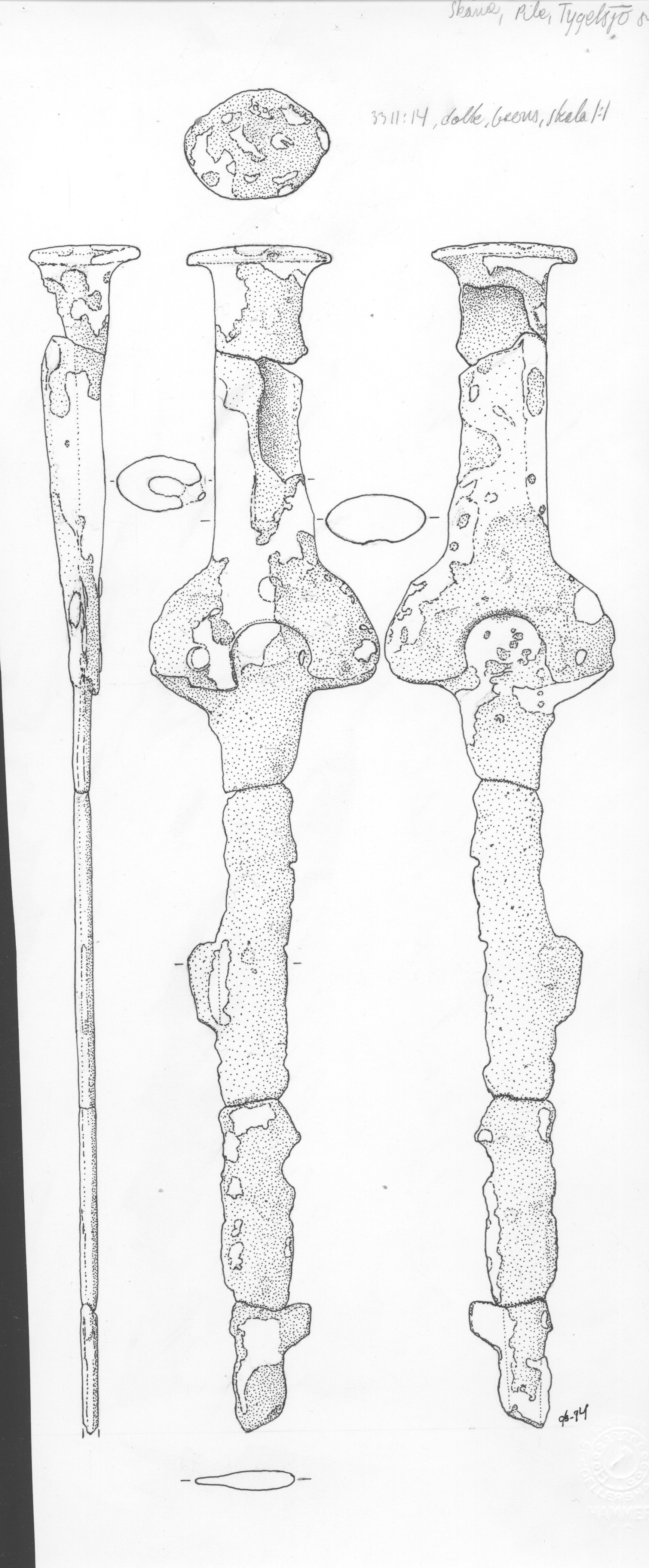 Fullgreppsdolk av brons i fem delar. Är synbarligen gjuten i ett med klingan.