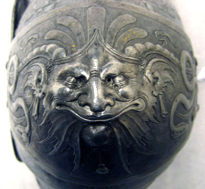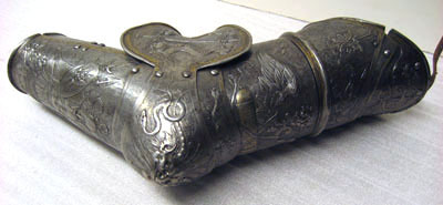 Av driven stålplåt, sammanlagt nio delar. Övre del av två rörformiga skenor i mitten sammanfogade med drivna koniska åsar löpande i varandra och bildandes en i sidled rörlig led. Mot insidan urtagningar för armen. I övre skenan två välvda skenor placerade omlott, med mot insidan urtagning uppåt ökande i bredd. Armbuckla av tre delar. Bucklan välvd i utåt riktad spets. Mot utsidan övergående i välvd skena med V-formigt tvärsnintt över armvecket, mot utsidan en större mussla och mot insidan en mindre. Skenan nitad i bucklans insda. Musslans maxbredd 135 mm. Över och under musslan en mindre skena med den synliga kanten utdragen till tre spetsar. Nedre del av två välvda avlånga skenor bildandes ett rör. Sammanfogade och öppningsbara genom mot utsidan gångjärn och insidan tapp genom hål. Inre skenan något kortare med övre kanten snett lutande inåt. Alla ytrre kanter omvikta och rundsmidda.