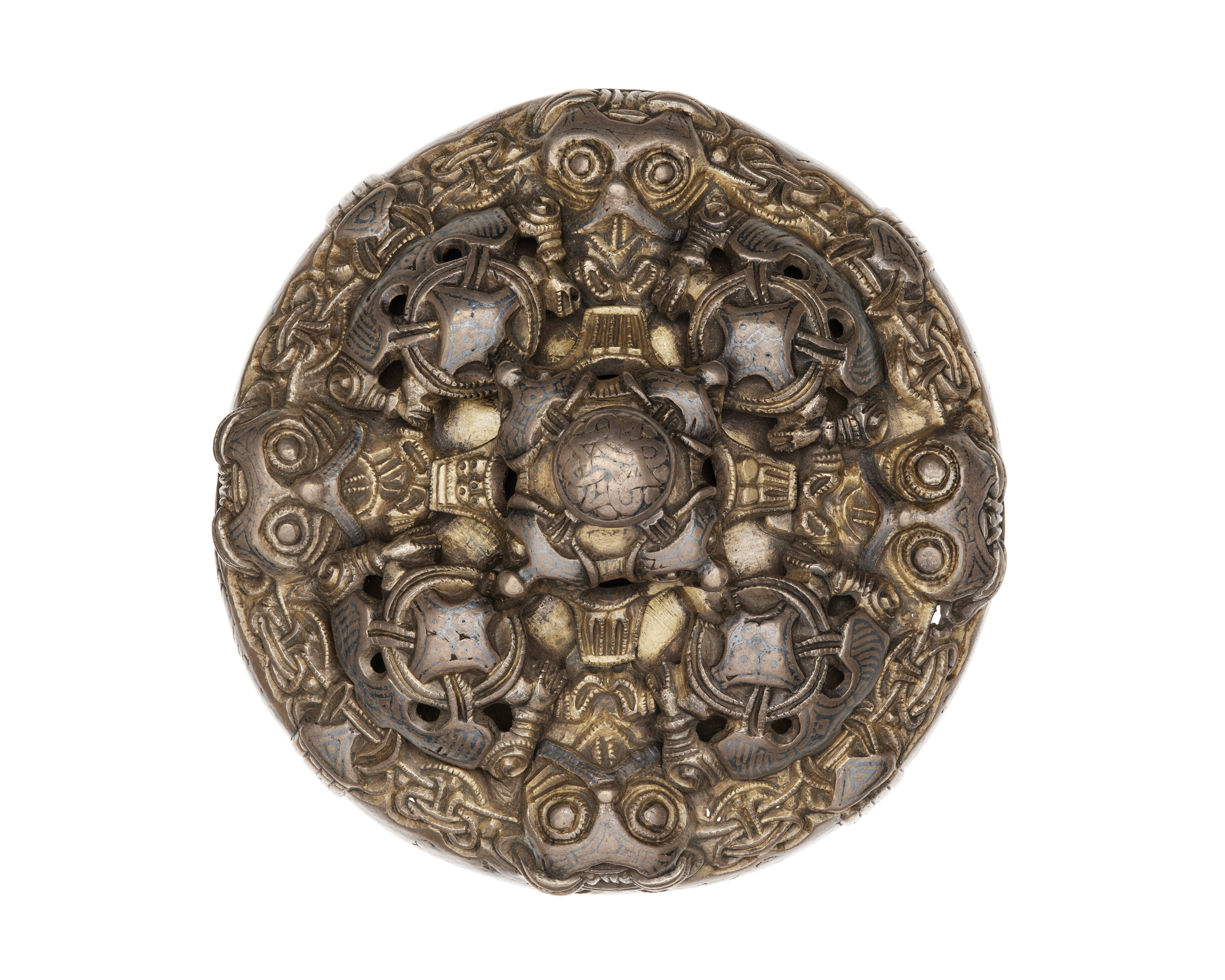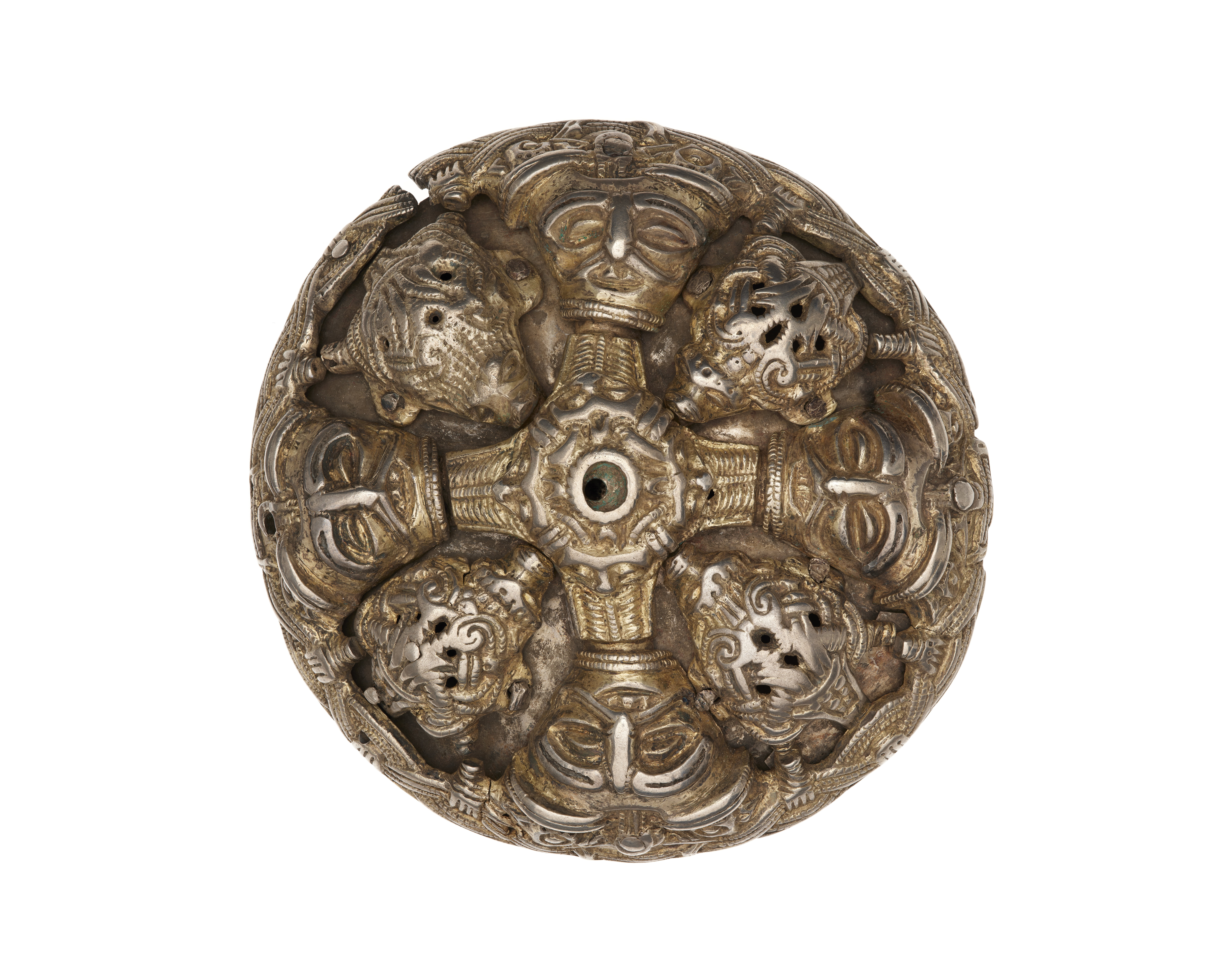 Delvis förgyllda. Spännet utan mittknopp väger 217,5 gram.