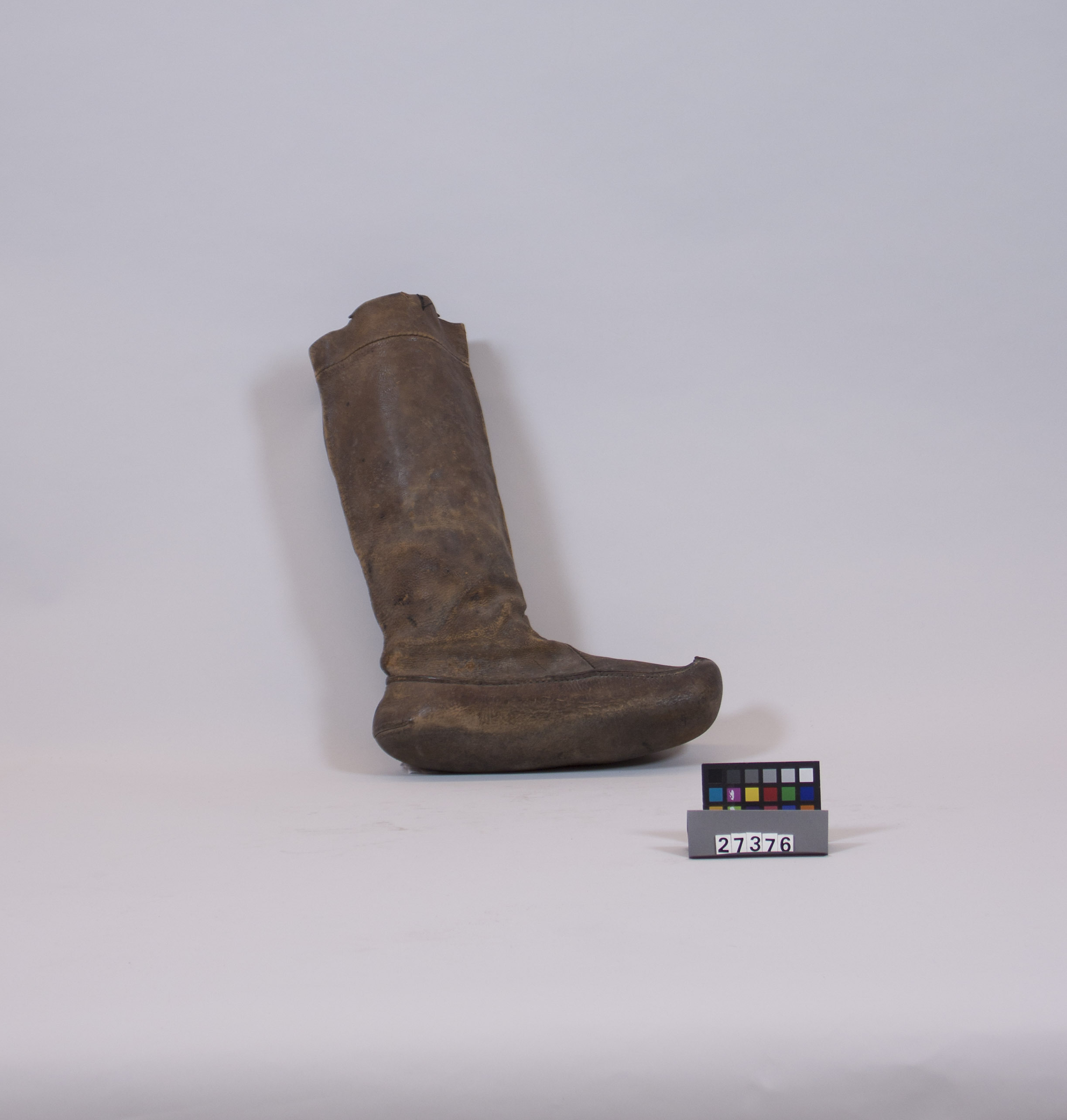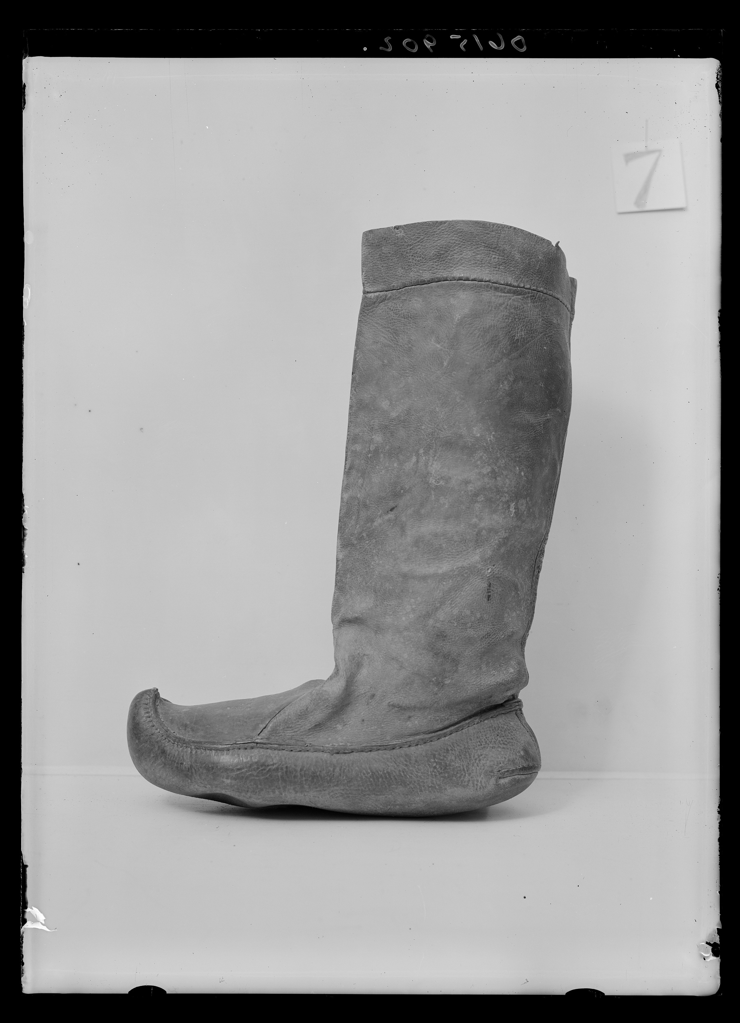 Av brunt (?), naturfärgat, tjockt läder med narven utåt. av rak modell, men spåren av slitning ger intryck av att vara v-pjäxa. Skuren i sulparti, som omsluter hela foten och går upp i en inåtböjd spets mitt fram, över fotens översida går ett ovanläder, som slutar i en tunga över vristen, Skaftet är från insidan fastspannat vid denna tunga och är hopspannat baktill, likaså från insidan med en passpoal av en sned läderremsa. Den horisontella sömmen mellan sul- och eller fotparti och skaft däremot hopspannad från utsidan. Smala förstärkningsremsor av läder har lagts intill sömmen där RESEFT och sula och baksöm och hälsöm stöter samman. Hälpartiet bildas genom sulans tillskärning, så att en rundad söm följer hälens kontur och har sytts av från insidan, medan den vertikala hälsömmen har sytts av från utsidan. Sulpartiet i tån har rynkats (spannats) samman mycket elegant för att ge god passform. Ovanlädret har dekorerats med sju stjärnformiga skomakarstämplar, som bildar en dekorativ triangel. Skaftet har upptill skarvats med ett smalt läderstycke, som spannats fast från insidan. Pjäxan är något högre fram än bak.