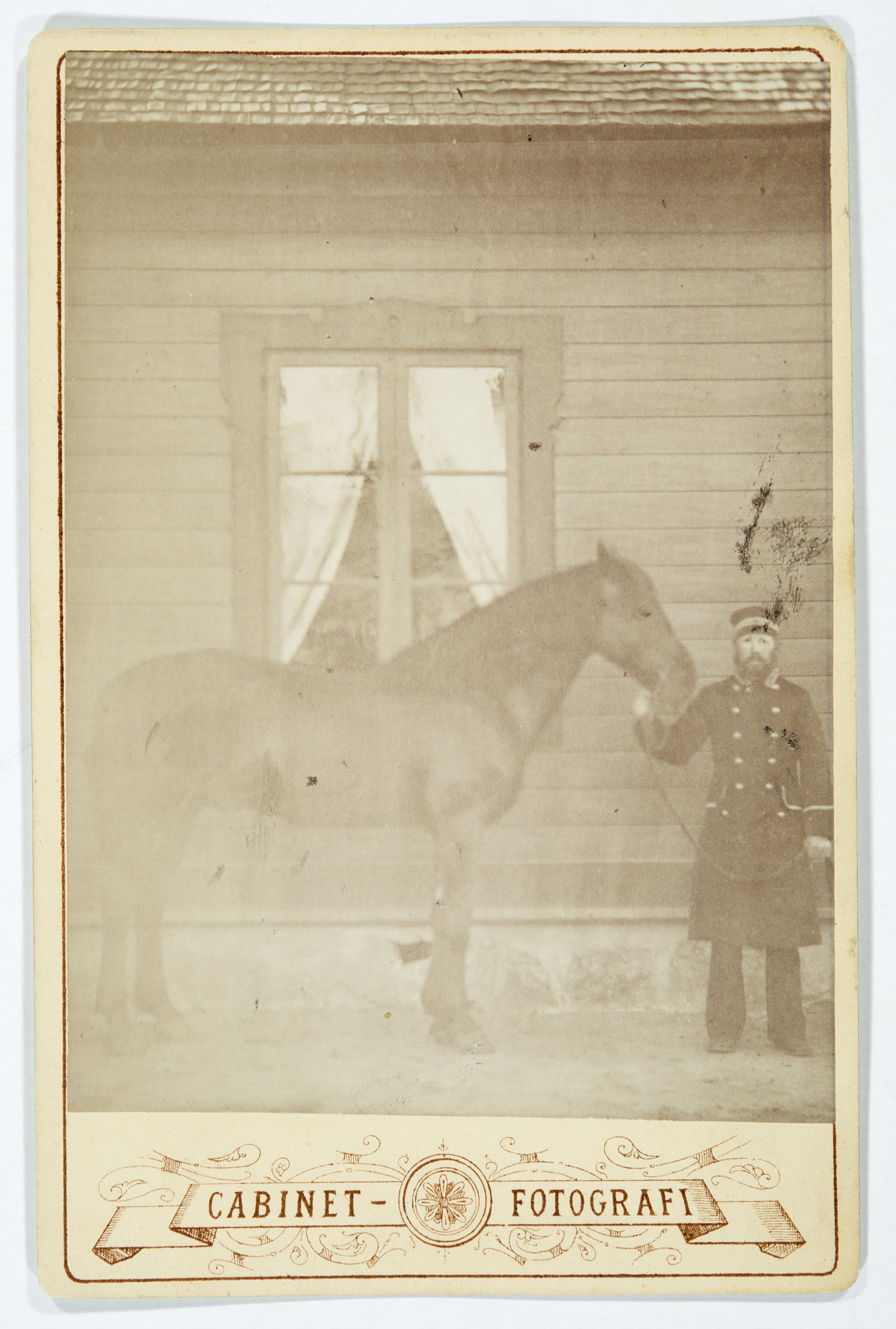 Fotografi på kusken Pettersson med häst.