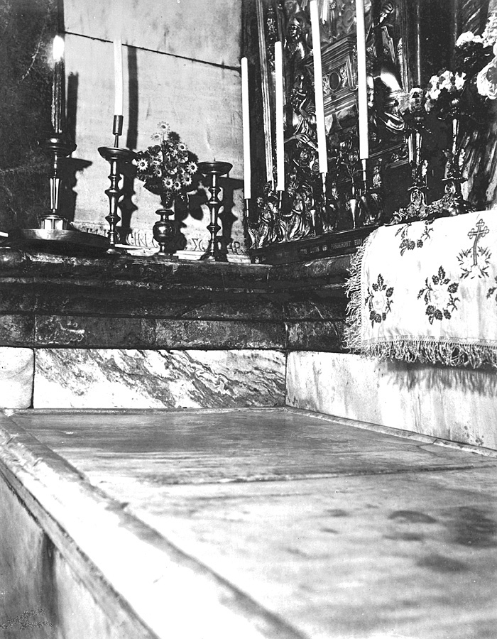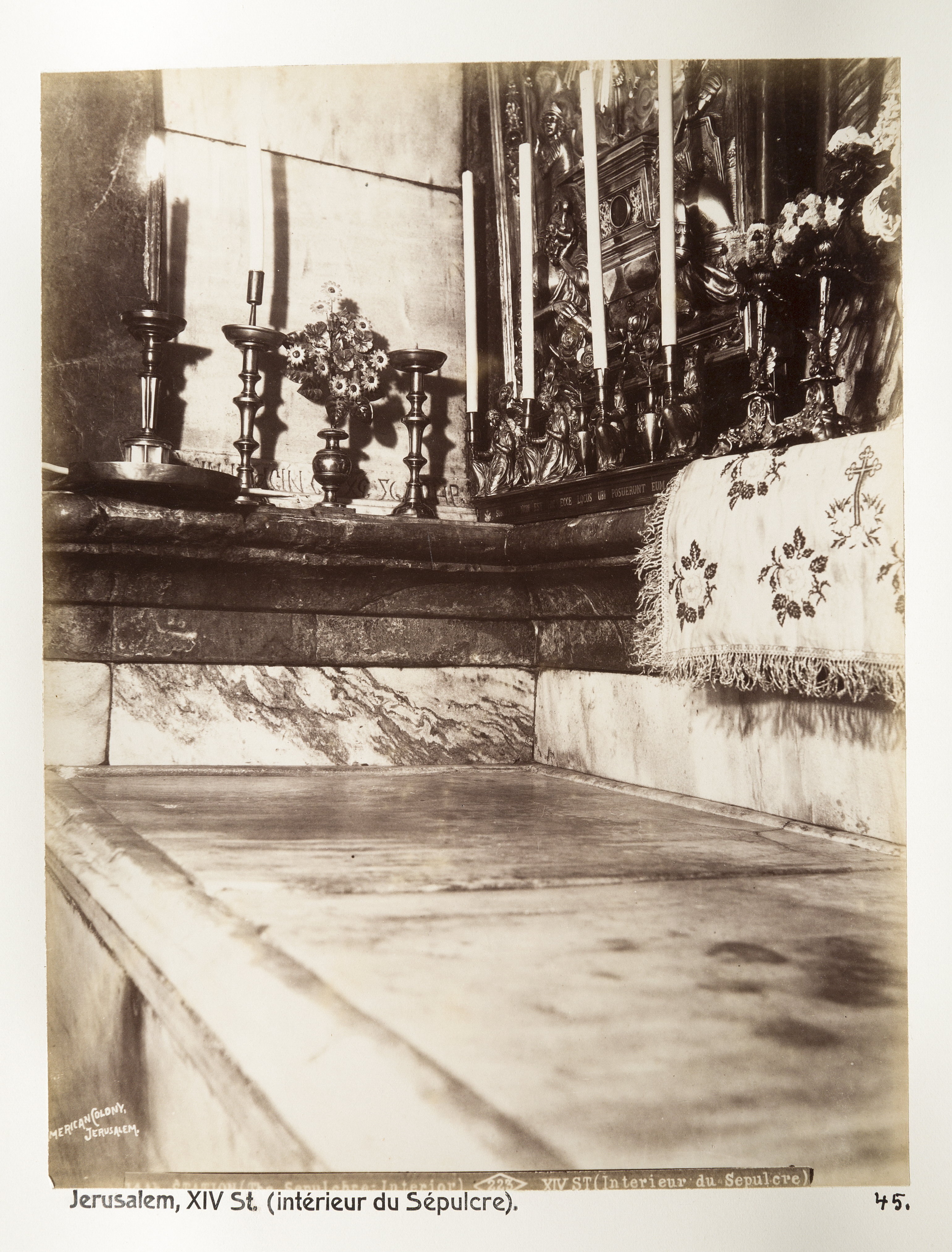Interiör från Heliga gravens kyrka. Station 14 på Lidandets eller Korsets väg (Via Dolorosa) där Jesus ska ha gått på dagen för korsfästelsen. Fotografierna LXVI:N.01.-180. kommer från resan till Palestina och Syrien som Wilhelmina och Walther von Hallwyl gjorde den 30 mars-27 april 1901. De lämnade Sverige den 5 november 1900 för Egypten, där de stannade till den 28 mars 1901, då de fortsatte till Palestina. Med på resan var Wilhelminas sällskapsdam, fröken Ida Uhse. Den 27 april fortsatte de till Turkiet och Mindre Asien. De mindre fotografierna (utom de från Samos) LXVI:N.90.-100. är tagna av Wilhelmina själv, under en resa till häst från Jerusalem till Damaskus 8-20 april 1901. Övriga fotografier är inköpta av Wilhelmina i Jerusalem, Damaskus och Beirut. Alla uppgifter kommer från Ida Uhses reseanteckningar.