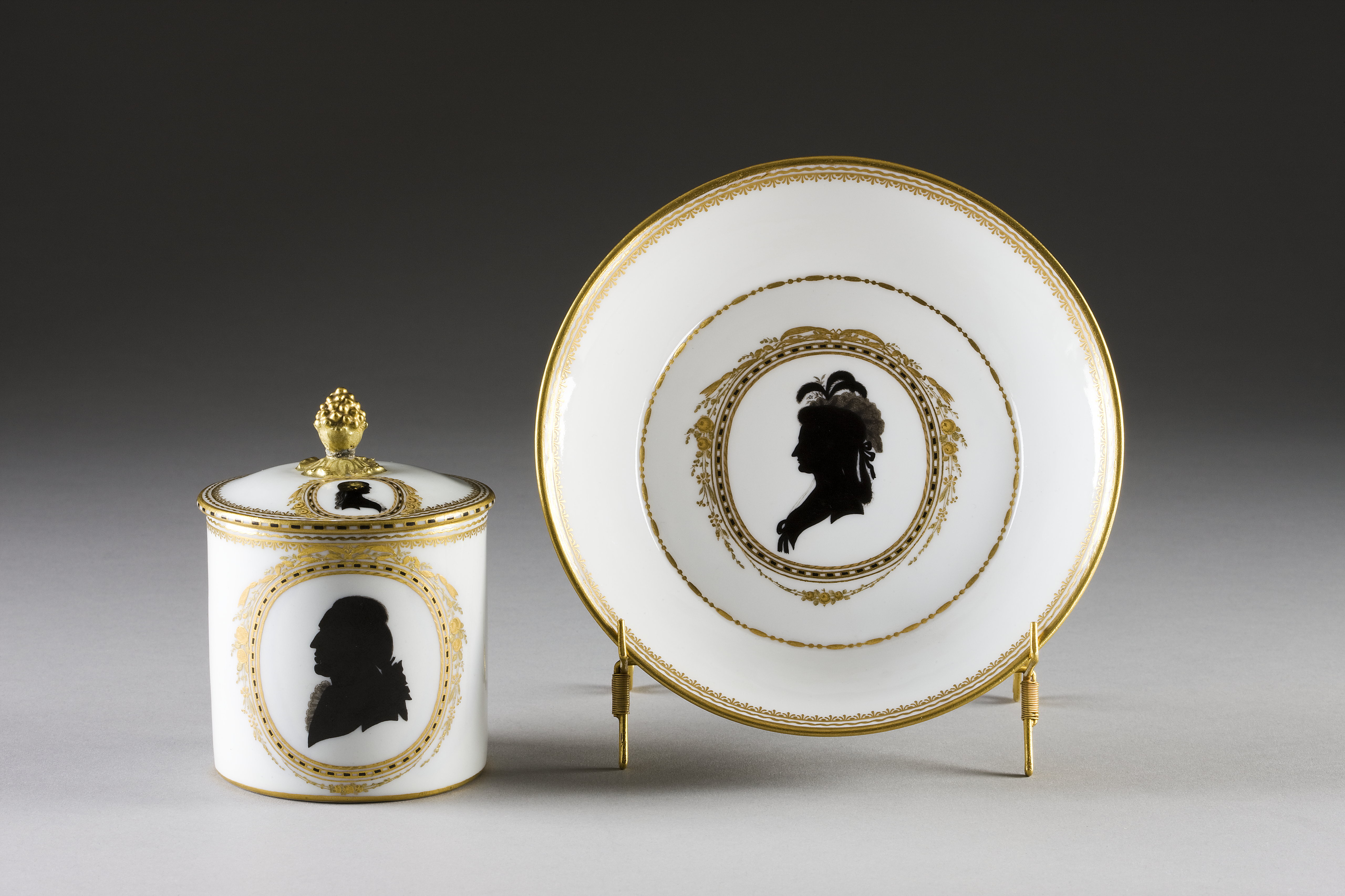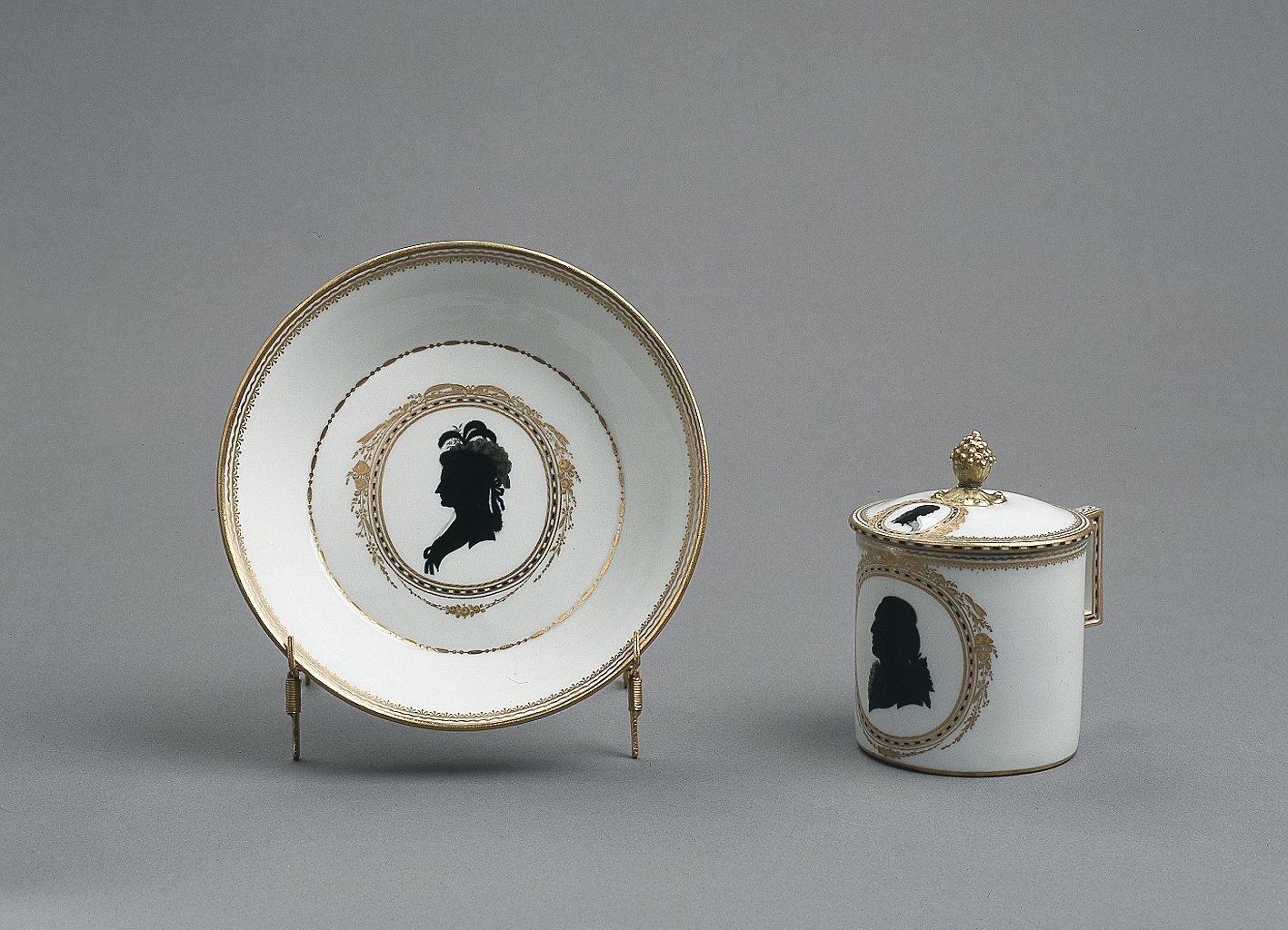 KOPP MED FAT.Cylinderformig kopp med lock och fat. Dekor i svart och guld på glasyren. Silhuetterna på detta eleganta samlarobjekt anses föreställa greve Camillo Marcolino, direktör för fabriken 1774-1814, hans maka och deras lilla dotter. De är lika fint återgivna som de silhuettklipp i papper som de påminner om. Traditionen med silhuettklipp kom från Frankrike och är uppkallad efter finansministern Ètienne de Silhouette som förespråkade en rad impopulära skatter och nedskärniningar. En servis "déjeuner Solitaire" med liknande dekor finns återgiven i boken "Un cabinet de Porcelaines (Pietsch red. 2001) Goldpainter "B". Fabriken grundlagd 1710 av kung August II av Polen, kurfurste av Sachsen. Johann Friedrich Böttger, som 1709 uppfann det fältspatäkta europeiska porslinet, var fabrikens tekniske ledare från dess grundläggande till sin död 1719. Pris: 35 Mk. Se walther v.H:s rescontra 1 Juli 1897 samt Uhses reseant. 22-23 Maj 1897.