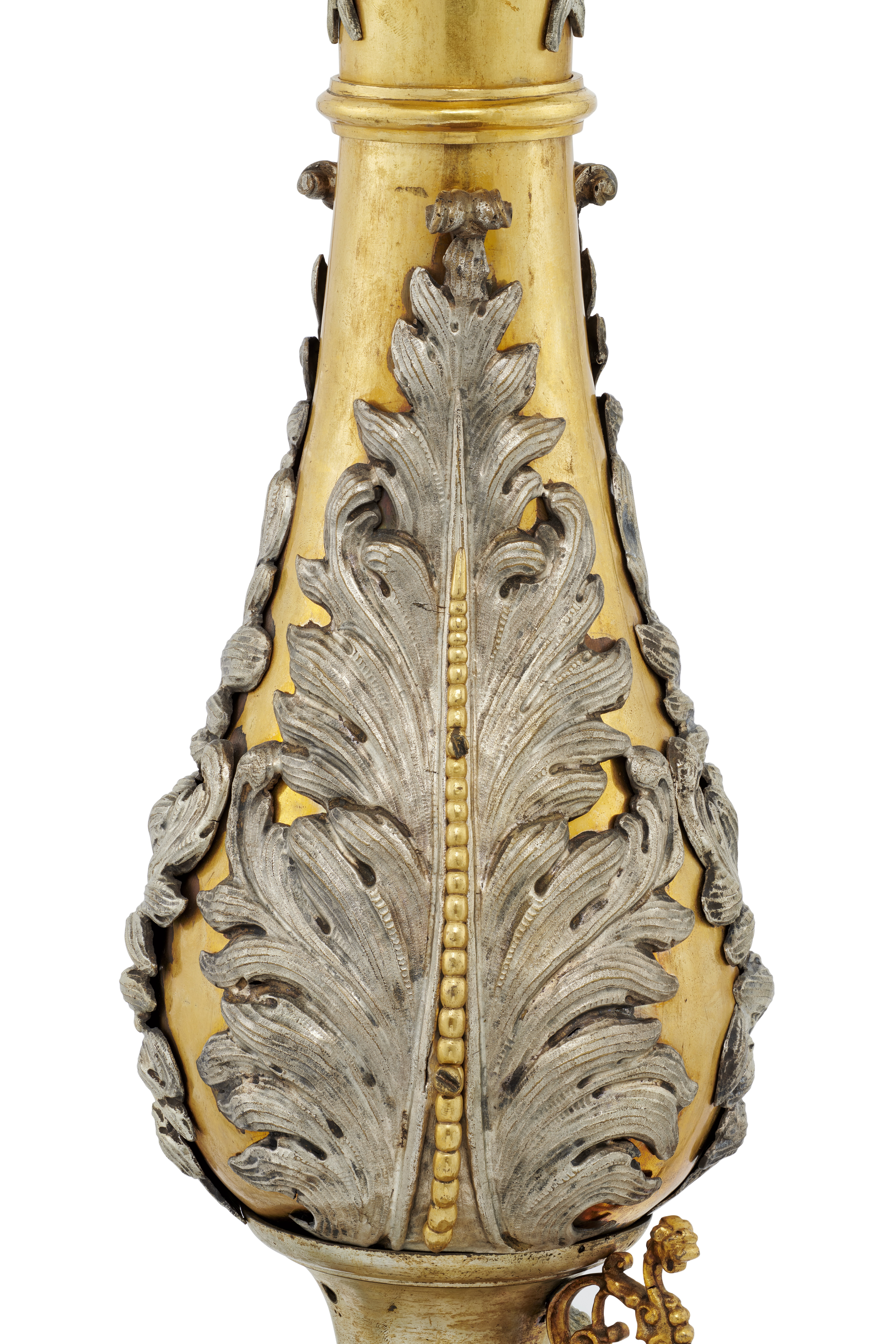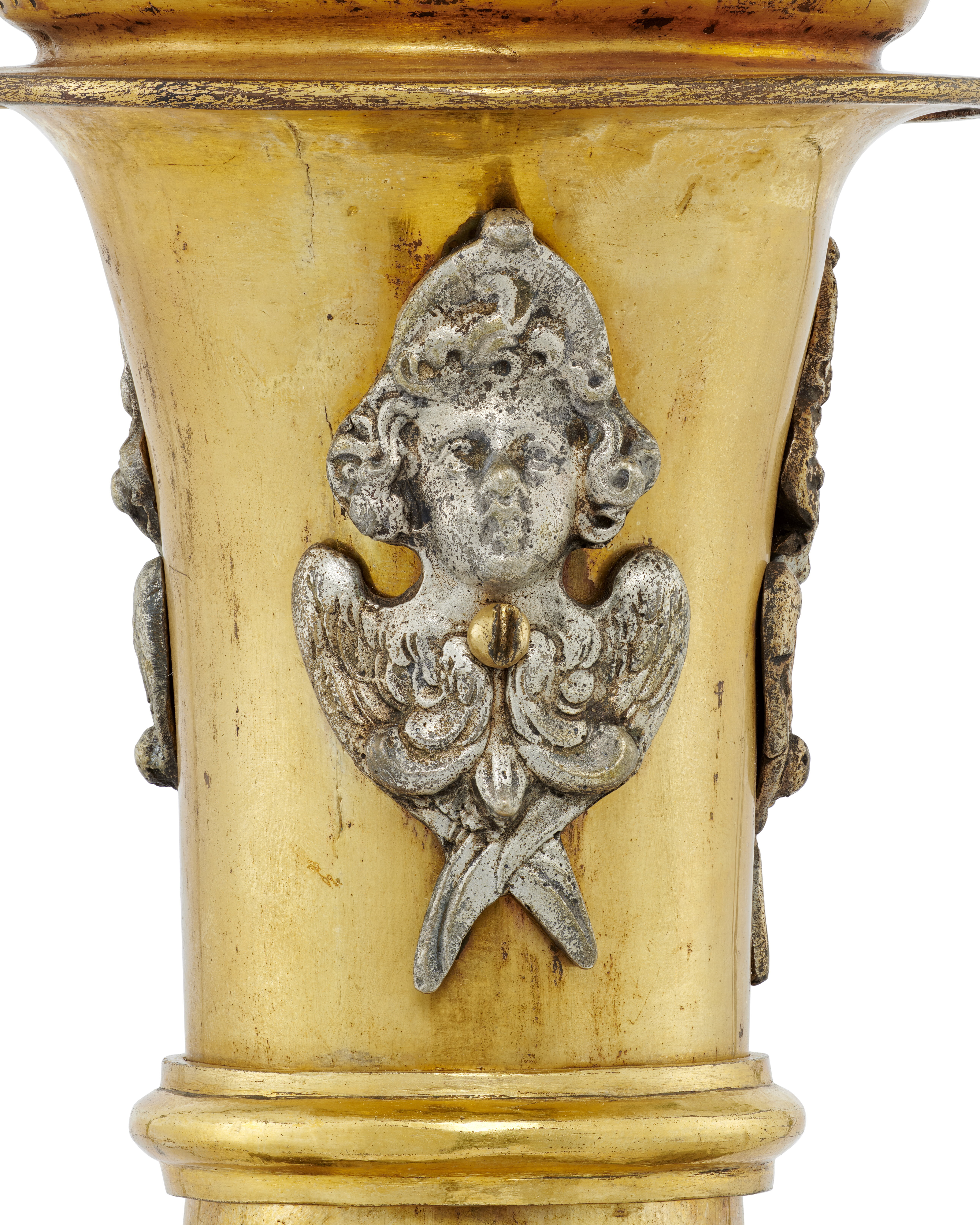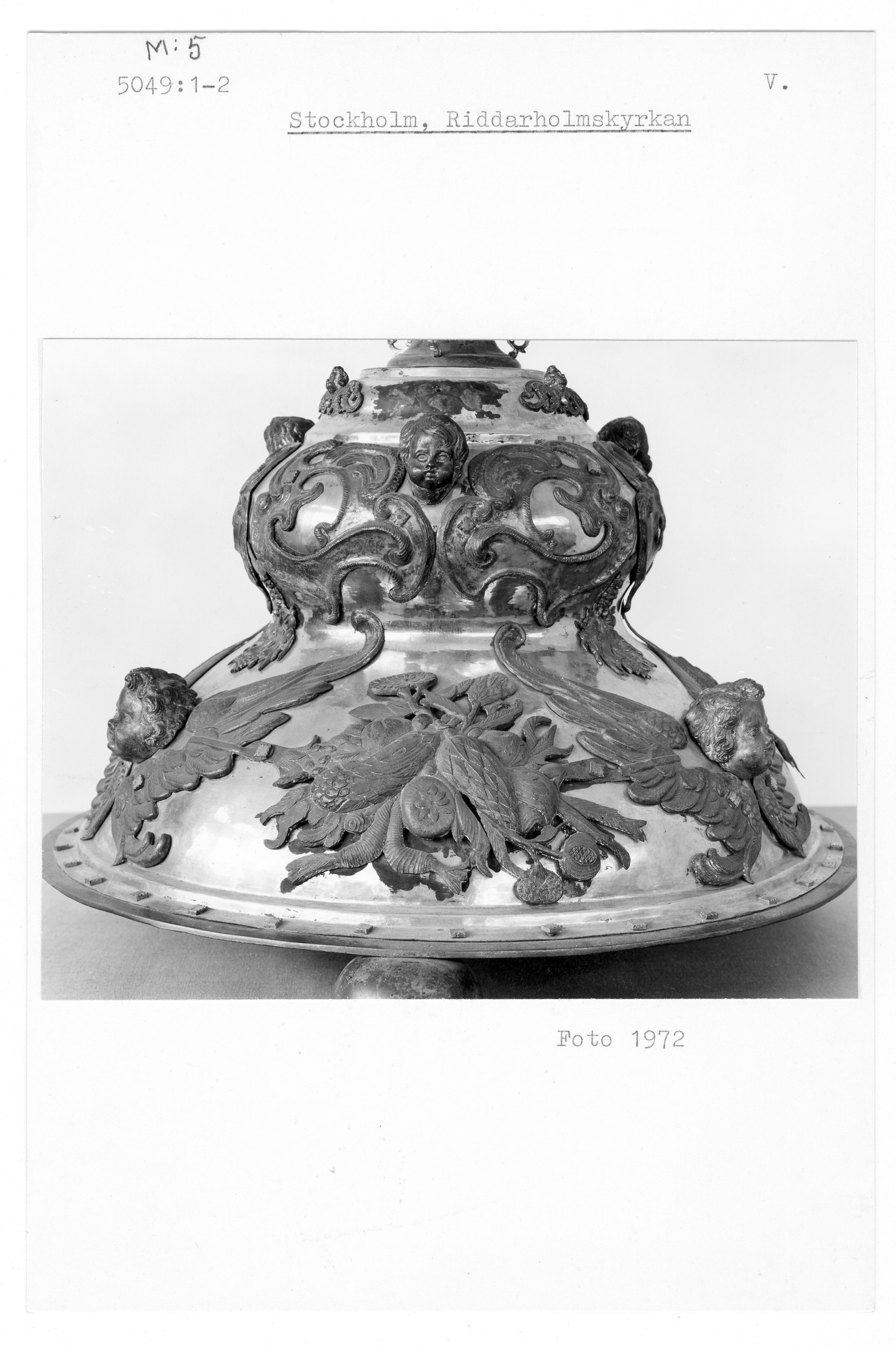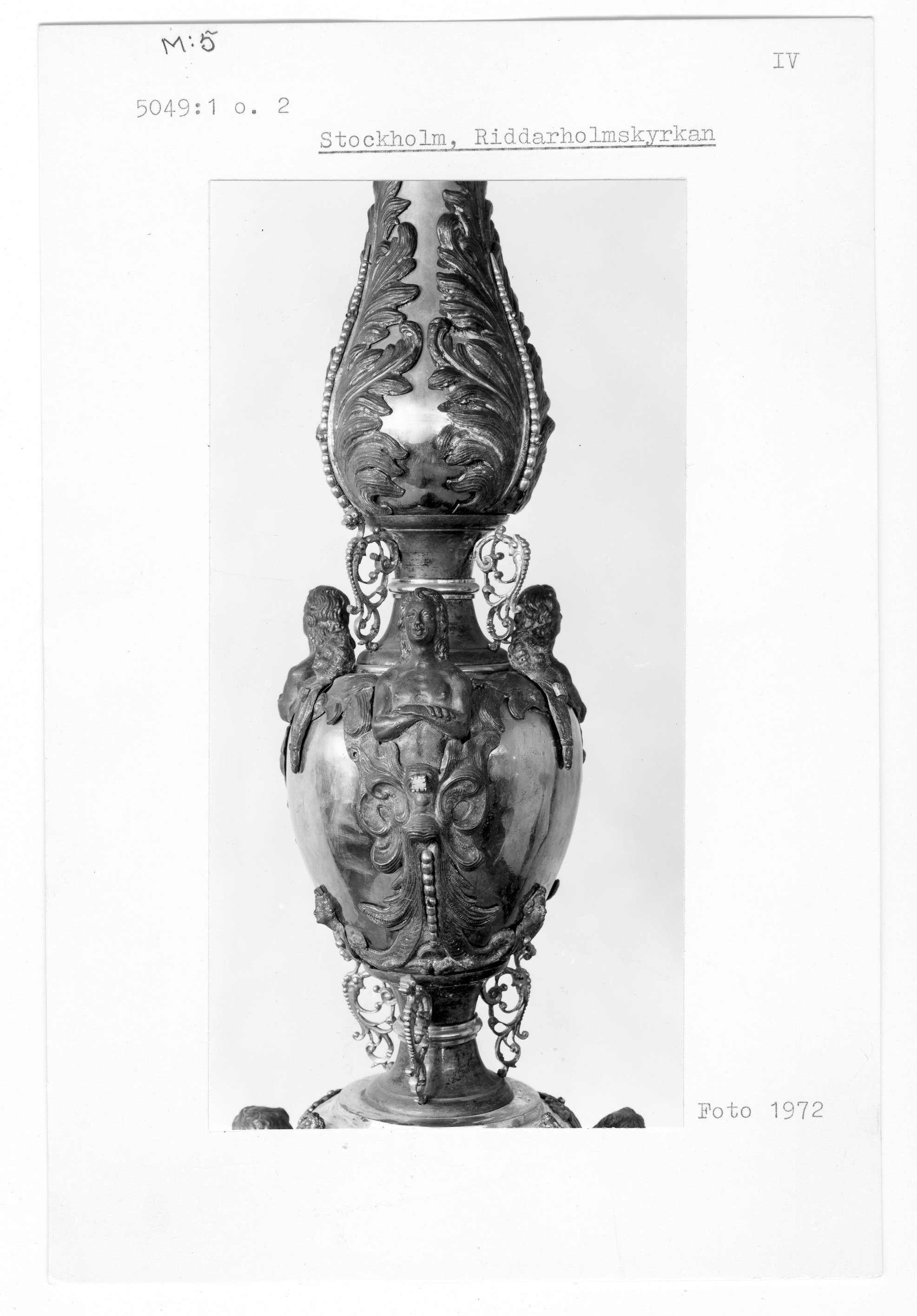 Stor förgylld och försilvrad ljusstake av koppar och mässing. Vilar på tre kulfötter och är prydd med bla tre änglahuvuden över varandra. Mellan de tre översta änglarna sitter tre människofigurer. Fyrflikig ljuspipa. Skänkta till Riddarholmskyrkan av H. M. änkedrottningen Hedvig Eleonora år 1663.