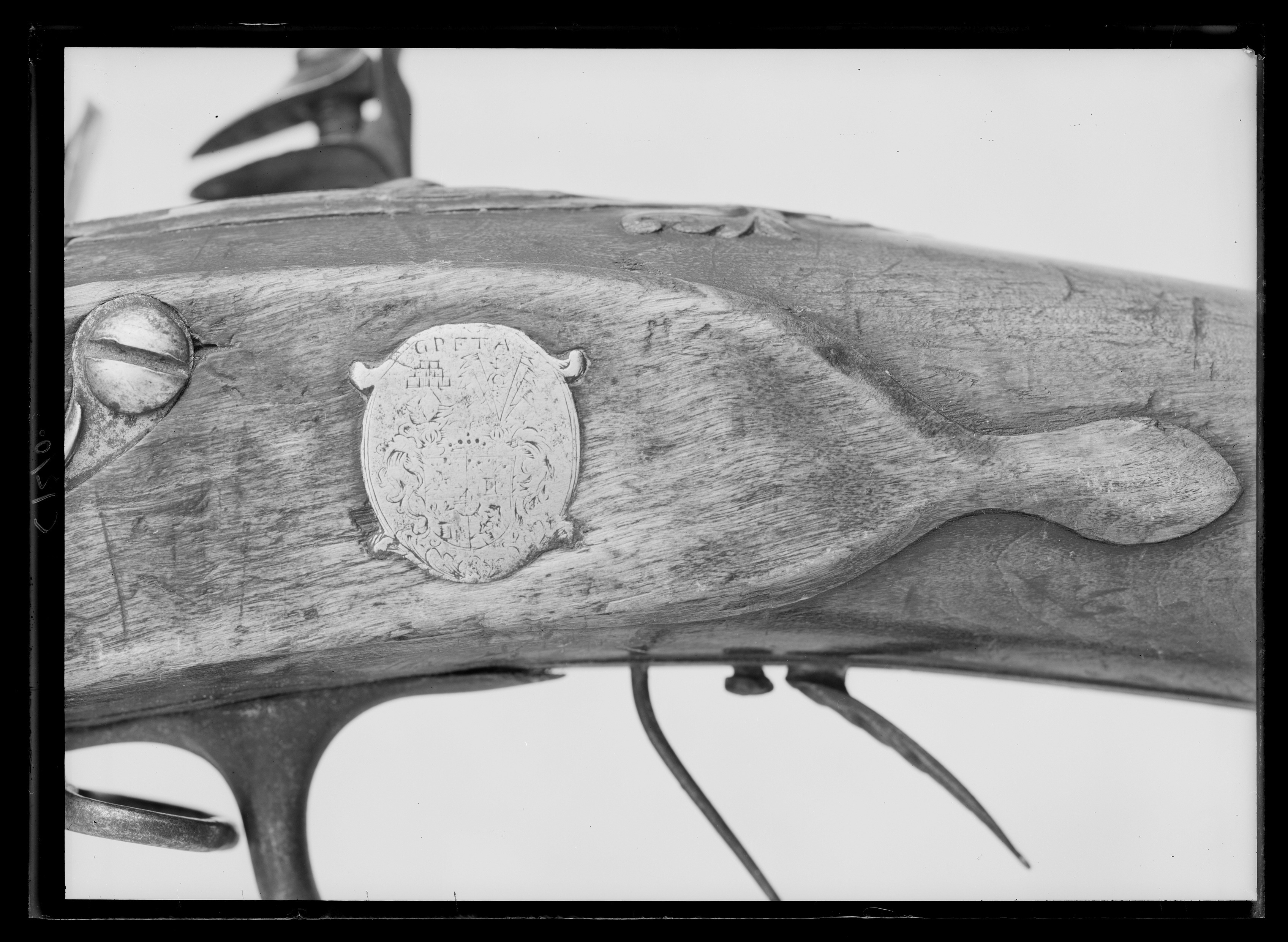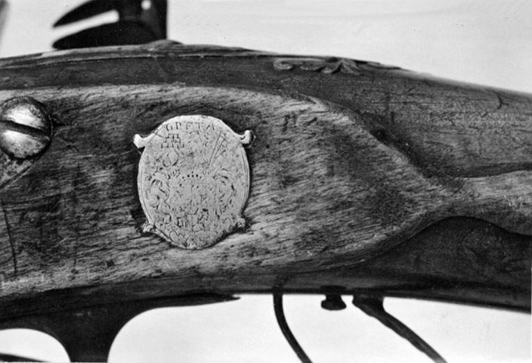 Åttssidig, på ovansidan brunerad, räfflad pipa, åtta räfflor, högerräffling. Vid pipbasen en pärlstav. På ovansidan en otydlig, graverad signatur(?), till v. därom: "IAN SIÖBLAD". På kammarens undersida en otydlig pipsmedsstämpel C M W(?), på v. fasen otydliga bokstäver, bl. a. H 2 ggr. Riktmedel: Klaffsikte av stål, två klaffar, framåtriktad, svängd, flikig gren, framtill avbruten. Spolformigt korn av mässing. Båda inlaxade. Fästning: Två häften. Pipan fäst med krysskruv, bakre låsskruven gm svansskruvplattan, främre rembygelns skruv samt urspr. ett pipstift. Flintlås med plant låsbleck med något fasade kanter, trubbig, försänkt bakspets. Graverade bladrankor. S-formigt svängd, platt hane med fasade kanter, stort, svagt välvt hanskruvhuvud. Spetsovala käkar, överkäken lös och blånerad, hangren med delvis skålad rygg och mittås, blånerad käkskruv med skivformigt huvud. Kantig fängpanna med skålad fals. Batteri med skålat fängpannelock med fasade kanter. Eldstål med profilerad ryggås, starkt uppsvängd häl. Batterifjäder med fasade kanter, treflikigt fjäderlöv. Nöt utan studel, yttre springkil. Fästning: Två låsskruvar. Avtryckare med snälltryck, rektangulärt avtryckarbleck. Helstock av valnöt, kolv av fransk typ med kindstöd, snidade bladknippen vid kindstödets framände och svansskruvbladet, volut vid kindstödets bakände. Näsband av horn, övriga beslag av stål. Bakplåt med lång, slät, avsmalnande flik på kolvryggen, tre skruvar. Vid bakplåtens högerkant fjäderbelastat, kvadratiskt stållock över kolvlåda. S-formigt svängt sidbleck. Därbakom en oval stålplatta med graverat vapen för friherrliga ätten Posse af Hedensund, däröver: "GPFTA" (GustafPosse, Friherre Till Arnäs". En + en svarvad rörka, ändarna försedda med runda tungor, slät,triangulär spets. Lång varbygel med skålade kantlister på bygeln som är bakåt avsmalnande och enbart välvd. Rund framstolpe på platta med balusterformiga armar åt vardera hållet, på främre delen en rembygel. Omvänt C-formig bakre stolpe, nedtill avslutad med en svarvad kula i tre avsatser, profilerad bakre arm.