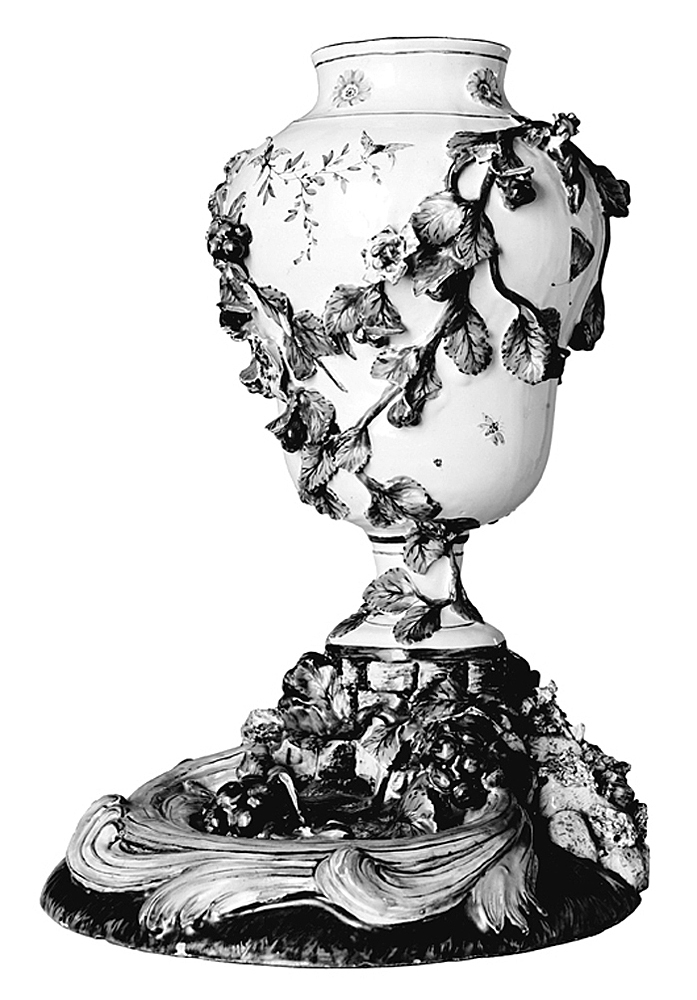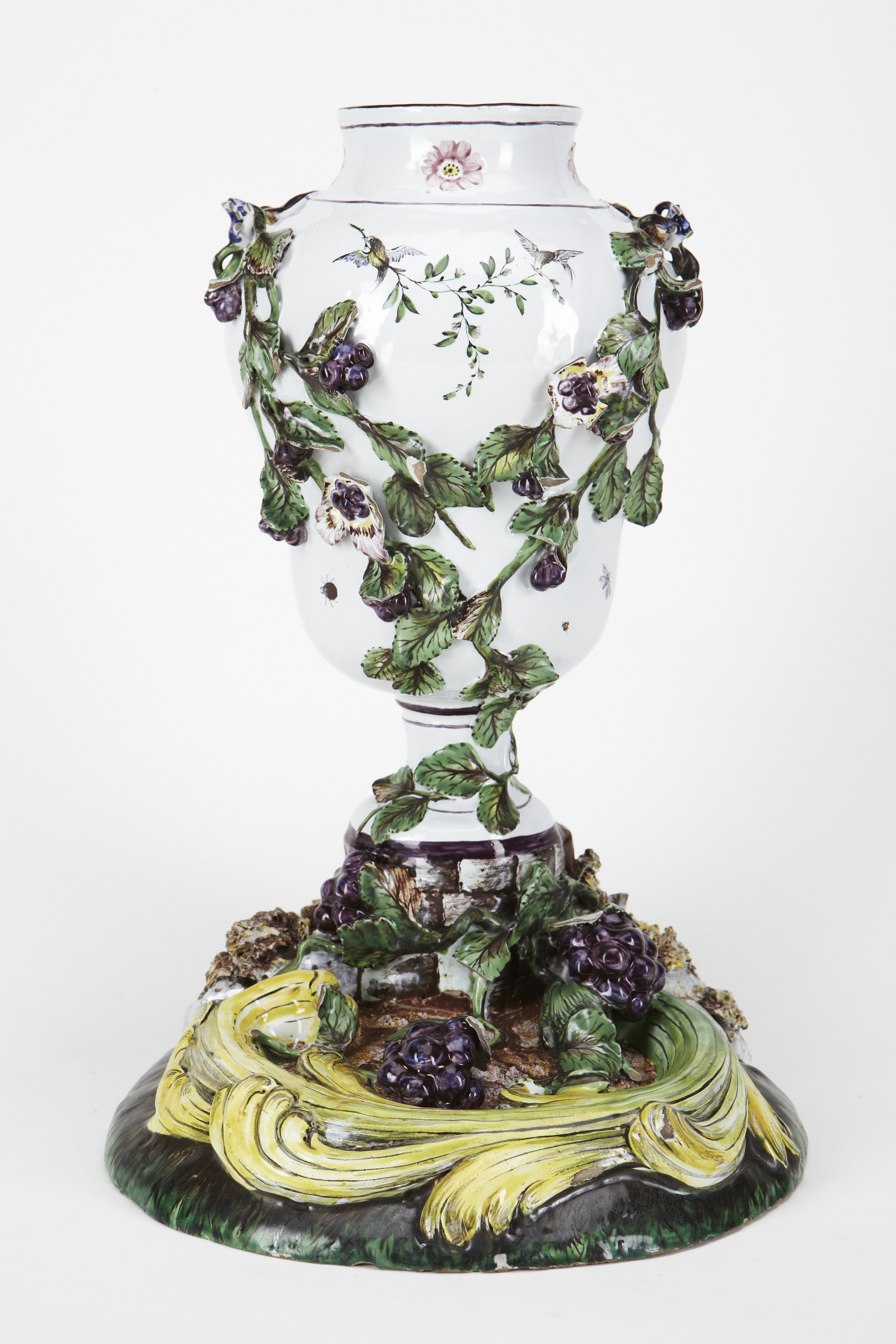 TERRASVAS (lock saknas). Pokalformig; kuppan omvänt päronformig med en insvängning omedelbart nedanför mitten samt svagt utsvängd uppstående mynning, runt dennas insida en falskant för locket; foten i form av en murad grund, baktill omgiven av ett stenkummel samt stående på bakre delen av en fotplatta med rundad begränsning, framför foten i högrelief ett i bågar svängt akantusliknande bladornament; mellan kuppan och foten ett insvängt skaft. På fotplattans undersida baktill ett bågformigt stöd. Dekor: i relief samt i muffelfärger på tennglasyr. Godset grågult. På kuppan i relief fyra kvistar i mörkbrunt med små spetsovala löv i grönt med nerver i brunt samt enkla blommor med kronblad i vitt, rödgredelint och gult samt kullrig mitt i mörkgredelint, dessutom klasar med runda bär i sistnämnda färg; kvistarna hängande fram- och baktill parvis med de övre ändarna sammanvridna och hopbundna med mörkblåa band samt fasthållna med en uppåtriktad flik, vari en gul punkt som spikhuvud. På kuppan dessutom målat på framsidan upptill en kvist med små spetsovala blad i grönt samt blommor i ljust rödgredelint, kvisten vid vardera ändan buren av en fågel med kropp i mörkt gråbrunt och gult samt utbredda vingar i gråblått och något brunt; på baksidan en kvist med en ros i ljust rödgredelint jämte knopp; på sidorna mellan kvistarna insekter; på mynningens utsida fyra parvis motsatta enkla blommor i ljust rödgredelint med mitt i gult, över och under blommorna en smal rand i mörkbrunt; utmed mynningskanten en något bredare dylik rand. Foten med målade, liggande rektangulära stenar i brungredelint, ljusgrönt och grått, på stenarna mossliknande växter i gult och grågult. På foten och fotplattan i relief en kvist, liknande den på kuppan, kvisten med tre druvklasar. På fotplattans undersida en märkning i mörkt brungredelint, samt målarens signering jämte datering i brunrött. Höjd 32,6 cm. Fotplatta, längd 23 cm, bredd 22,3 cm