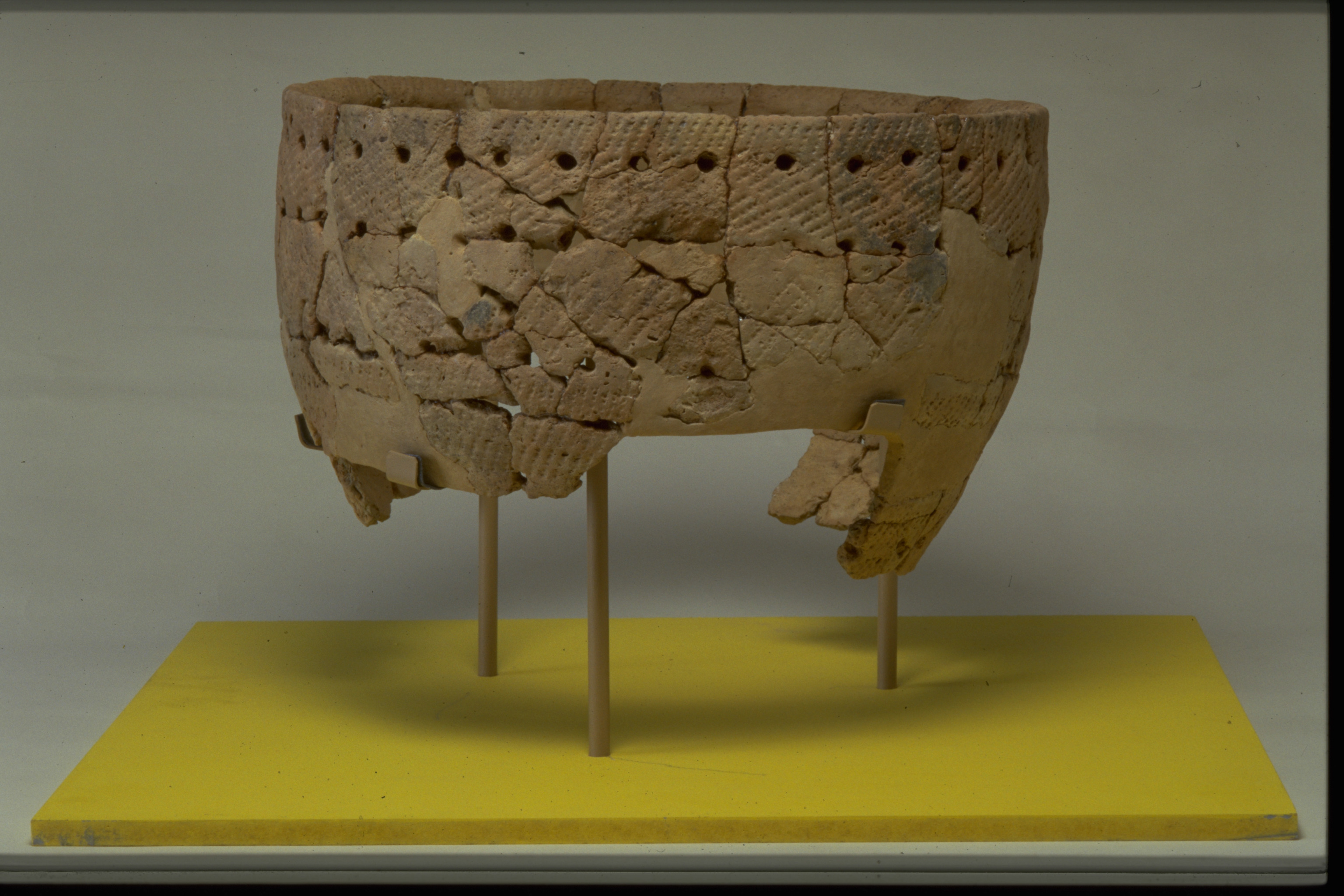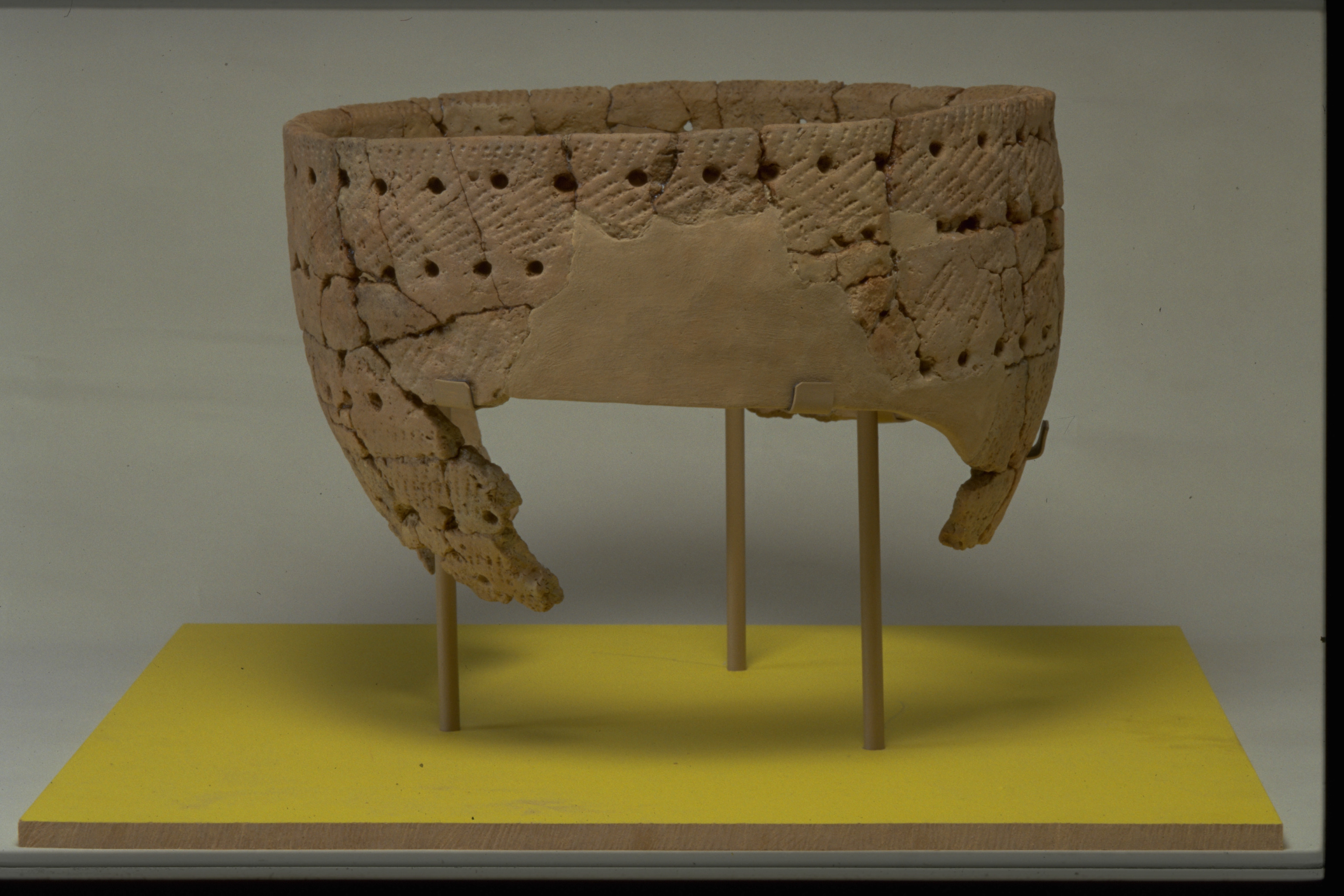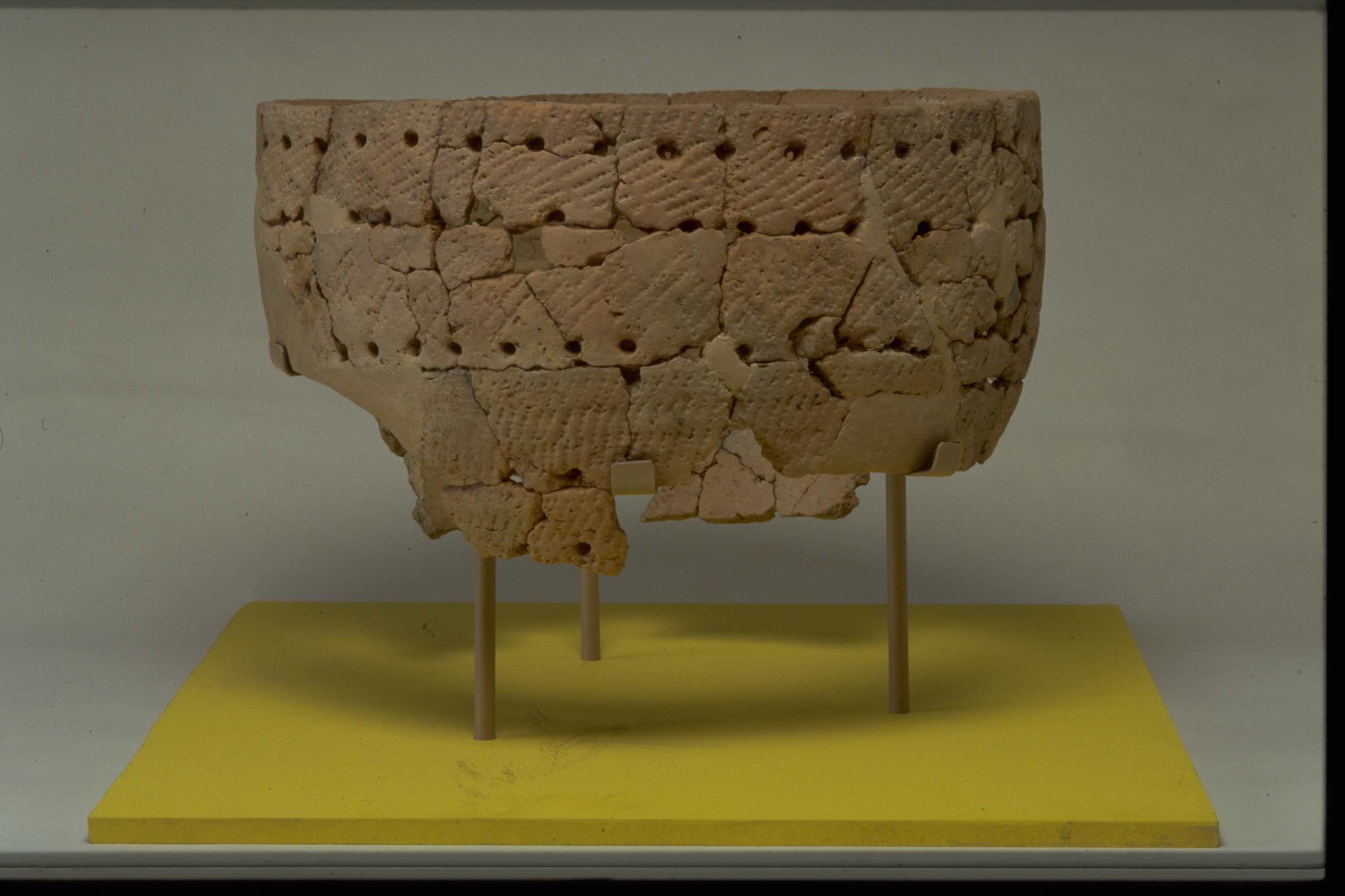 Kärl av keramik. Saknar botten men av det bevarade partiet verkat kärlet ha varit rundbottnat. Heltäckande ornering, i horisontella band bestående av gropar eller grupper av kamstämplar.