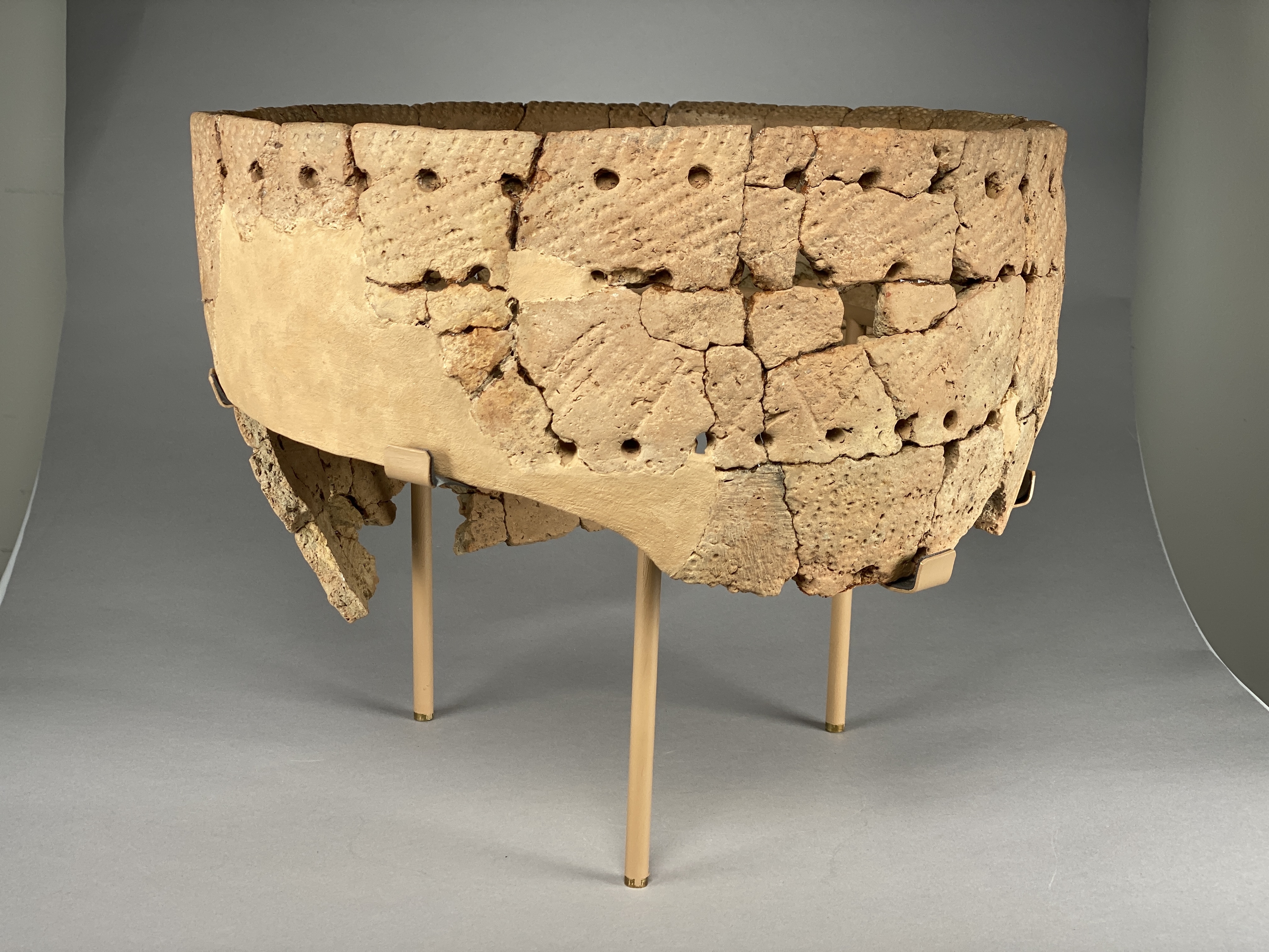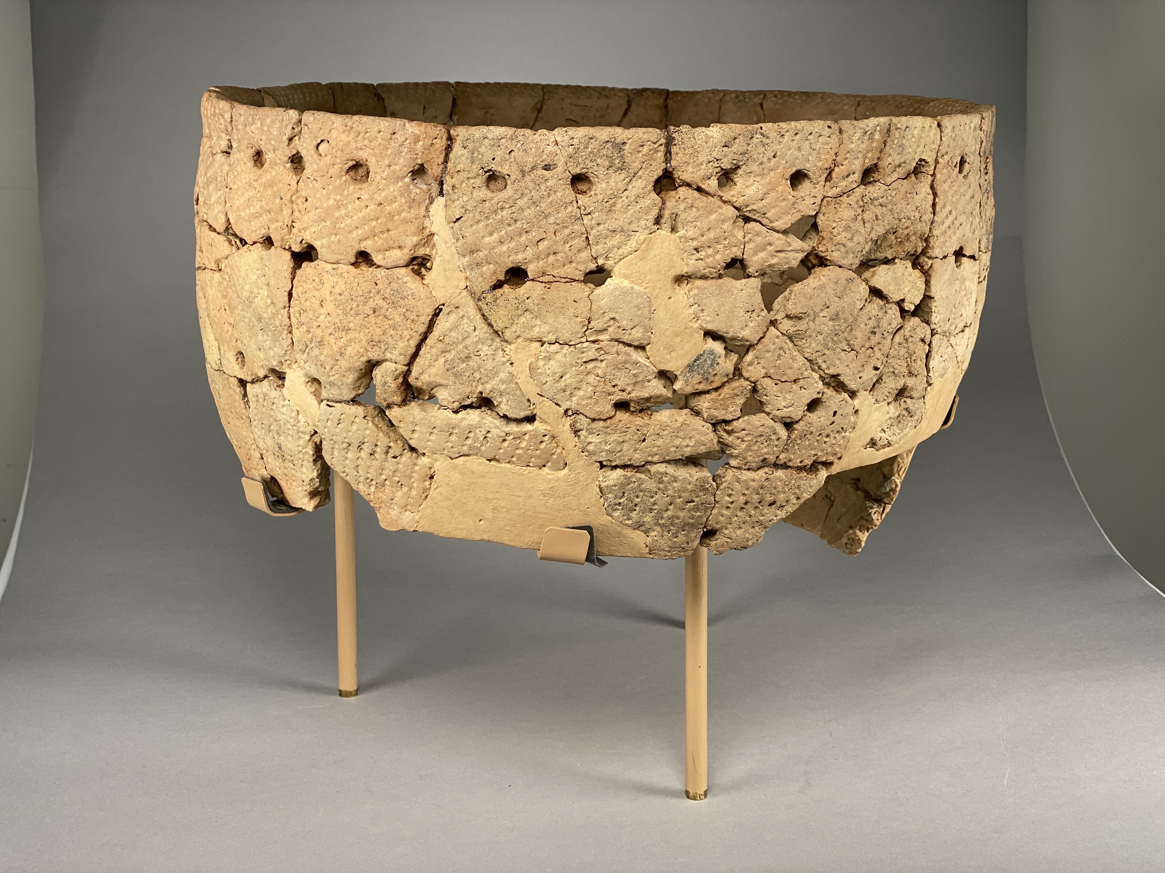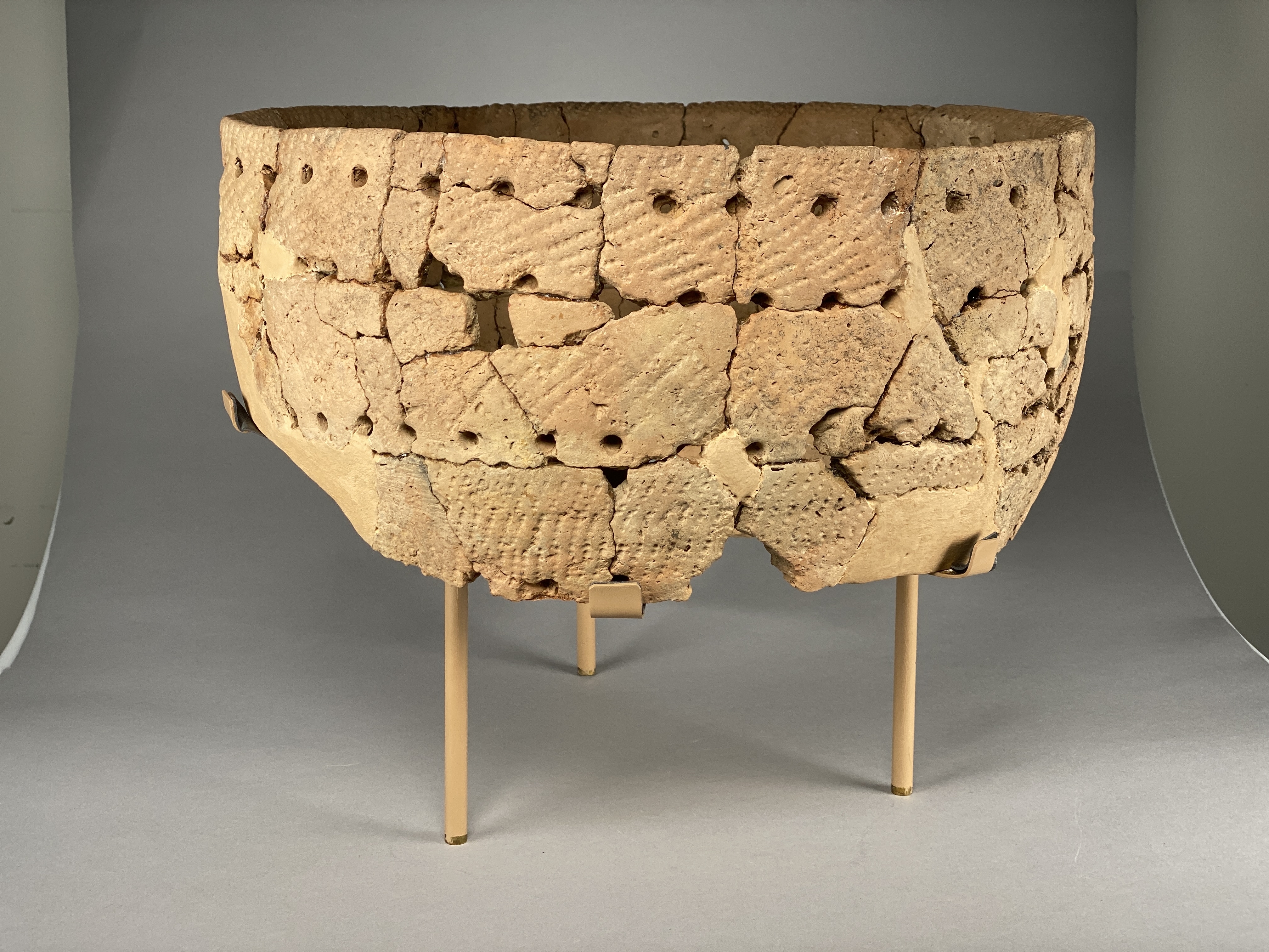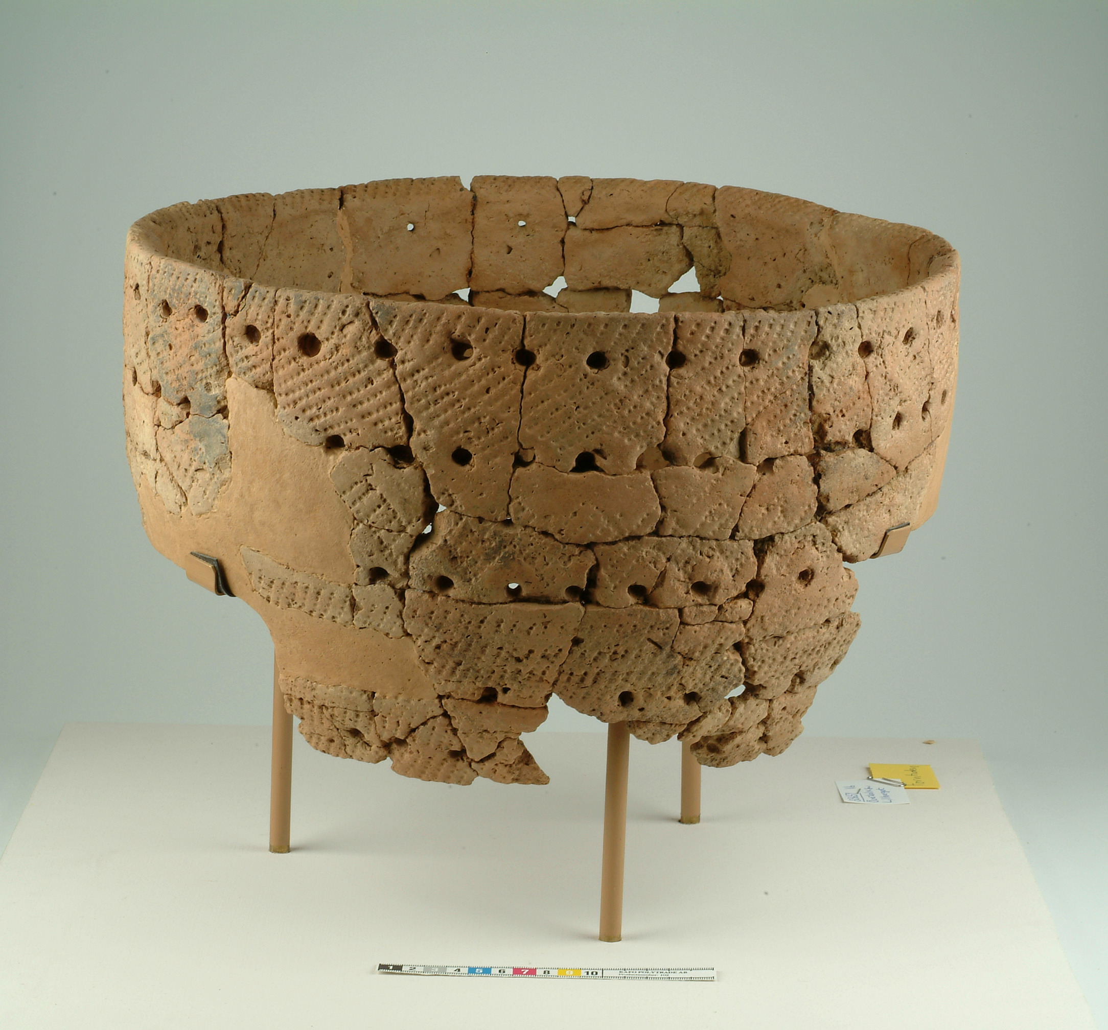 Kärl av keramik. Saknar botten men av det bevarade partiet verkat kärlet ha varit rundbottnat. Heltäckande ornering, i horisontella band bestående av gropar eller grupper av kamstämplar.