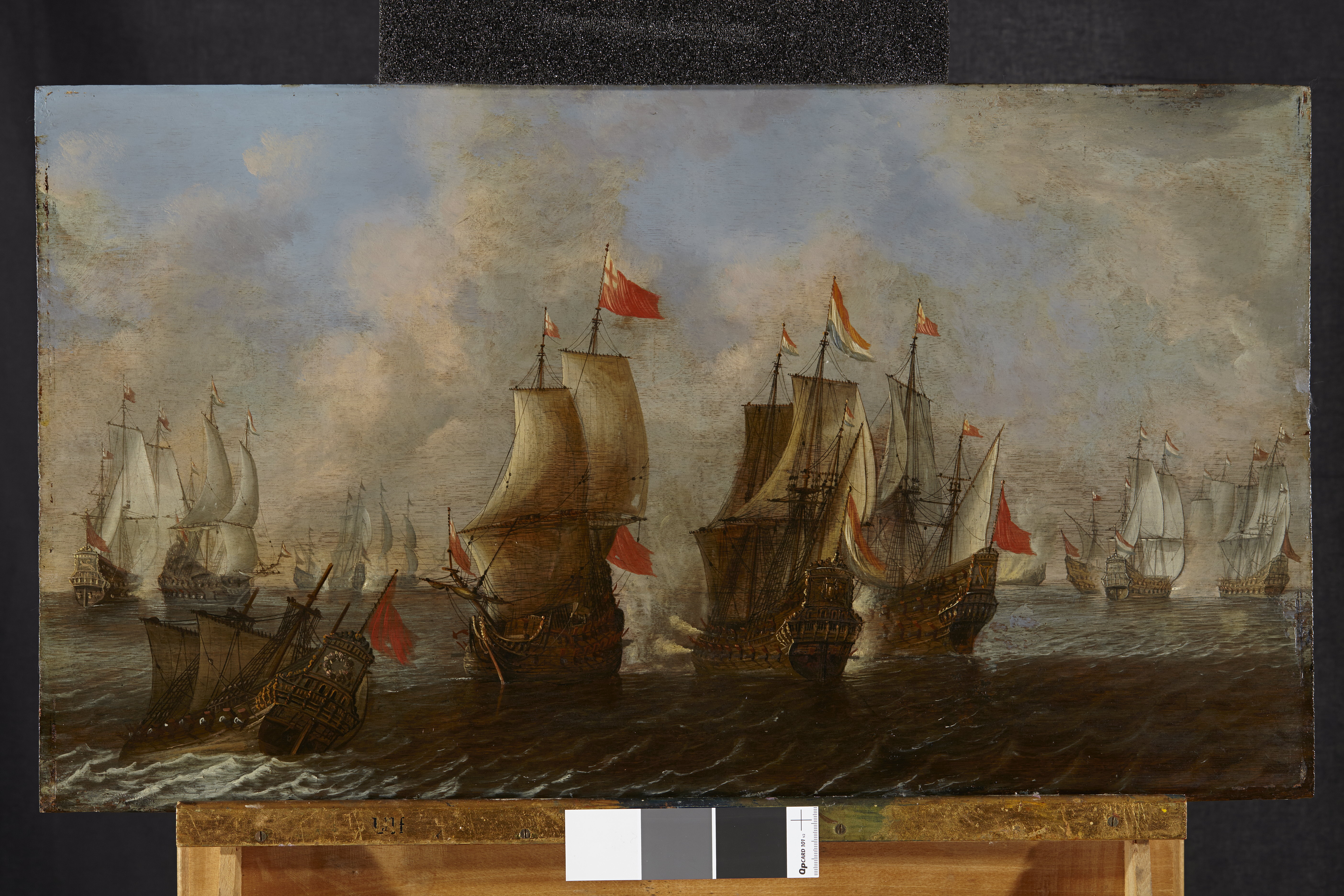 Engelska och holländska fartyg inbegripna i strid, i centrum ett holländskt skepp mellan två engelska. Till vänster i förgrunden ett sjunkande engelskt skepp. Signerad nere till höger : " C C Wou ". Olja på pannå (ek). Förgylld fururam med rundstav. Ramlist 40 mm.