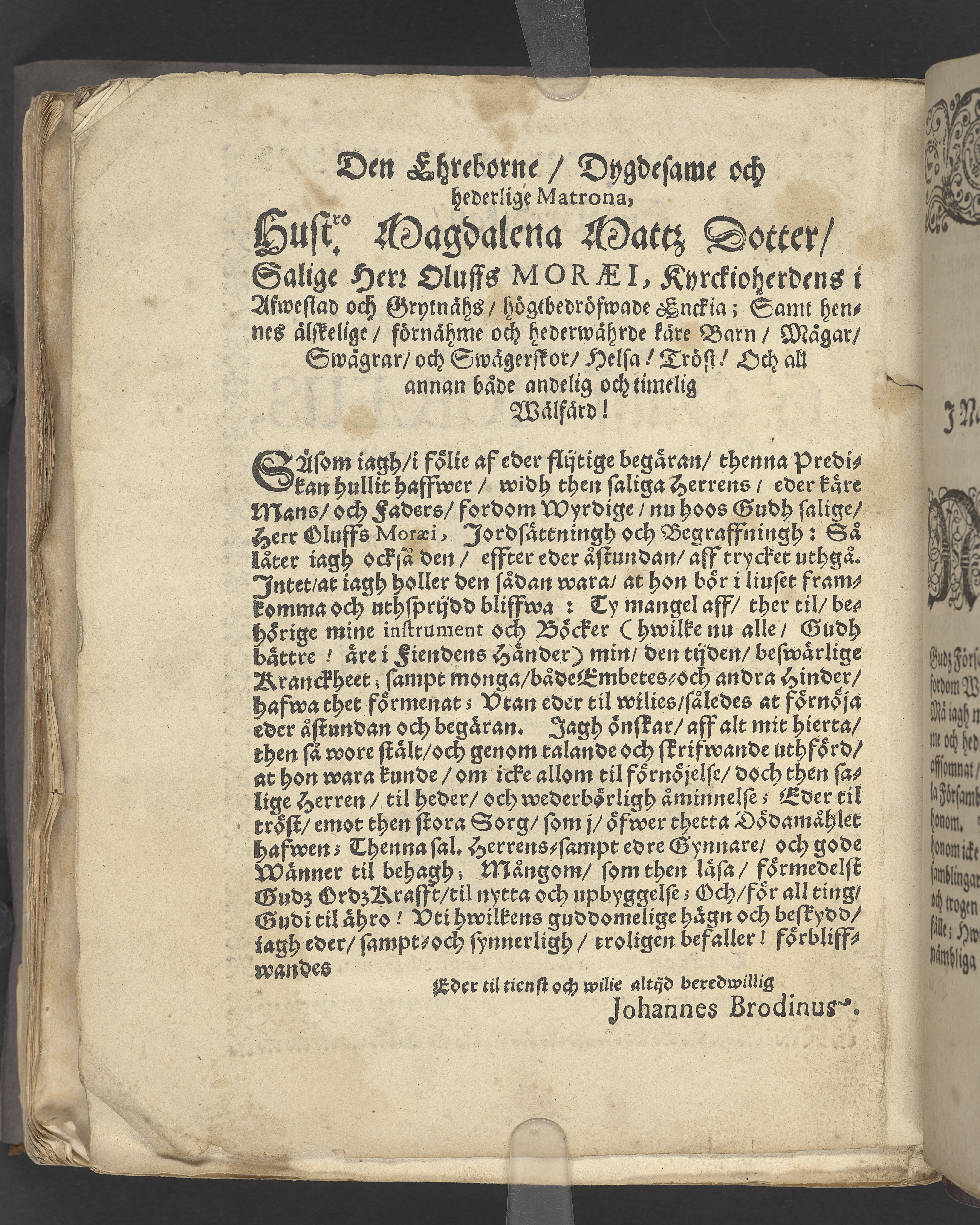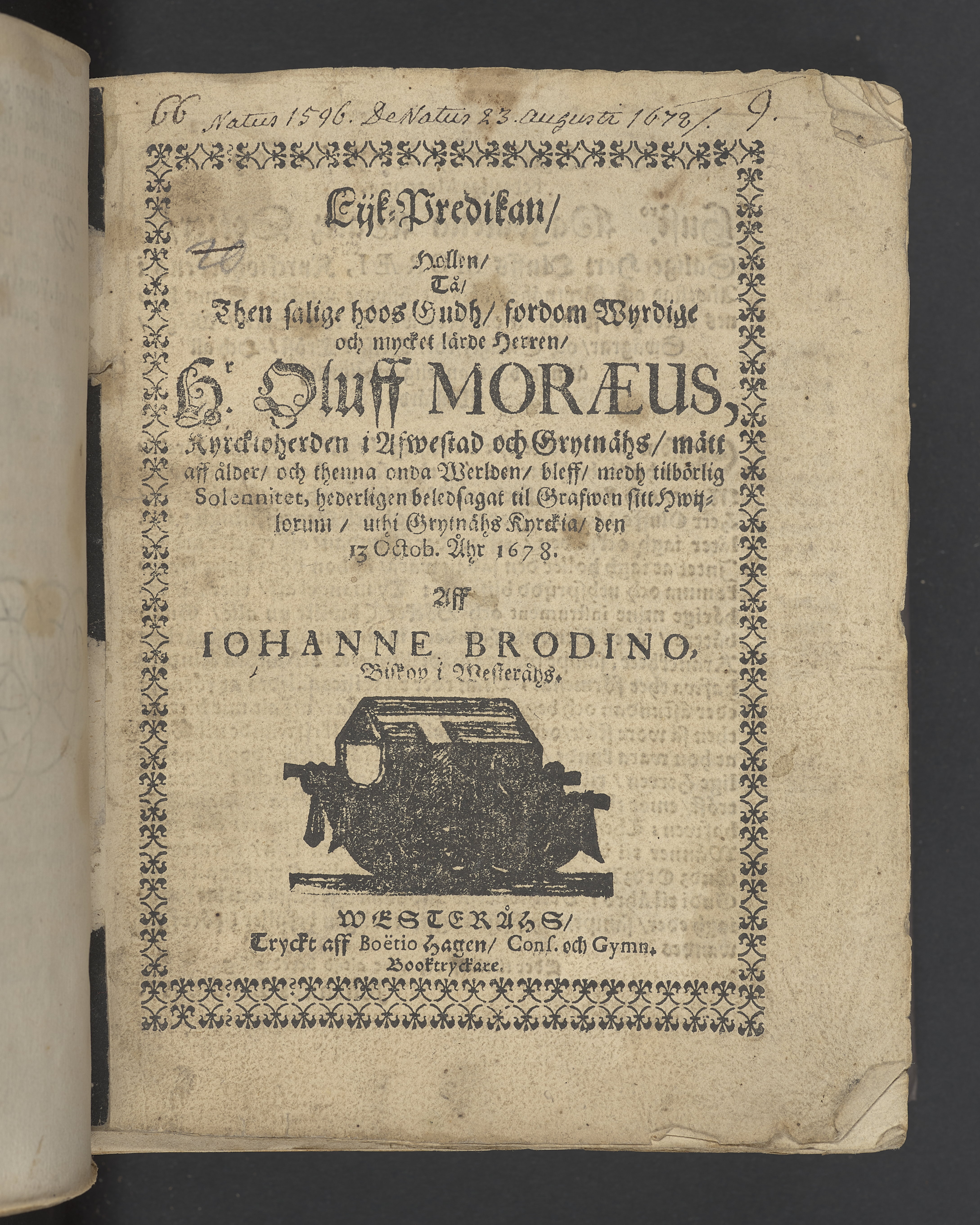 Lijk-predikan, hollen tå ... Hr Oluff Moræus, kyrckioherden i Afwestad och Grytnähs ... bleff ... beledsagat til grafwen sitt hwijlorum, vthi Grytnähs kyrckia, den 13 octob. åhr 1678. Aff Johanne Brodino ... Westeråhs, tryckt aff Boëtio Hagen, cons. och gymn. booktryckare.