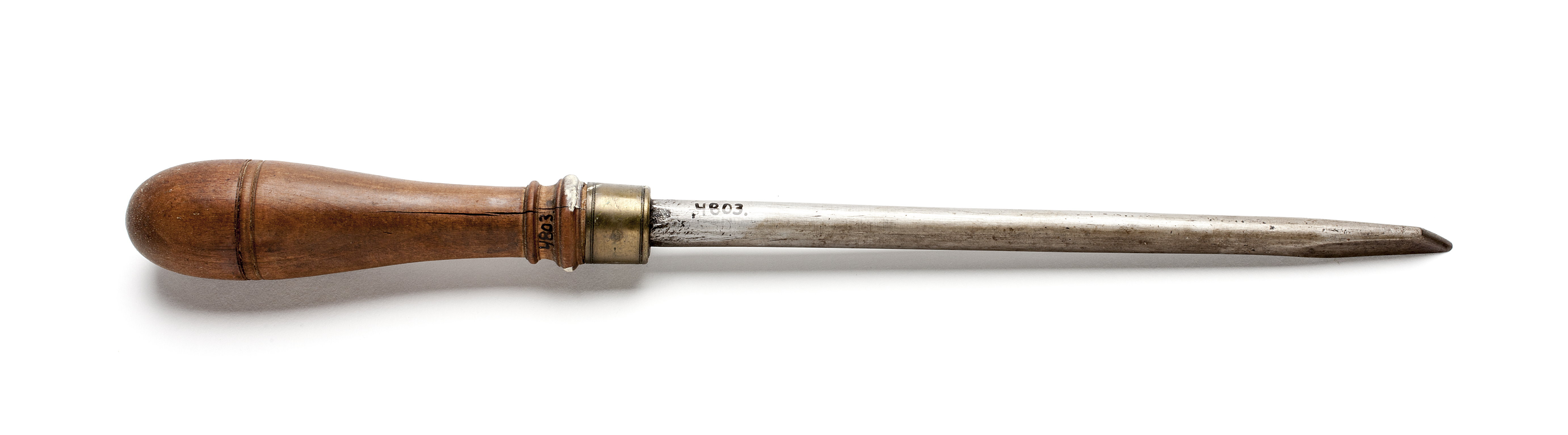 Rund klinga, i änden med tillplattade sidor och ovansida. Svarvat skaft av päronträ med två vulster nedtill ("skoklostertyp"). Mässingsring.