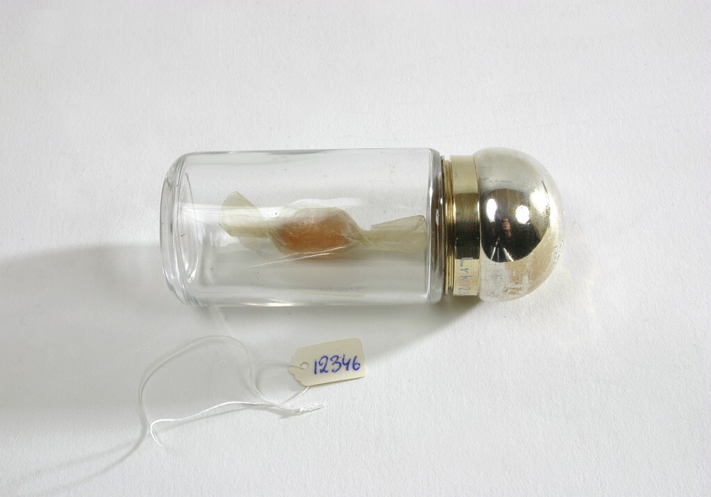 Burk av tjockt glas med runt tvärsnitt. Upptill beslag av förgyllt silver med gängad utsida samt fem stämplar: "W L, lejon, C, Victoria", (W. Leuchars, London 1878). Lock av förgyllt silver, klotformigt med slät rak kant, på denna lika stämplar som på föregående. På ovansidan Gustav V:s spegelmonogram krönt av kronprinskrona. Inuti locket kork samt runt förgyllt brickformigt beslag. Ur resenecessär, begagnad av Gustaf V som kronprins. Gåva 1951 av Gustaf V:s arvingar genom K. Hovmarskalksämbetet.