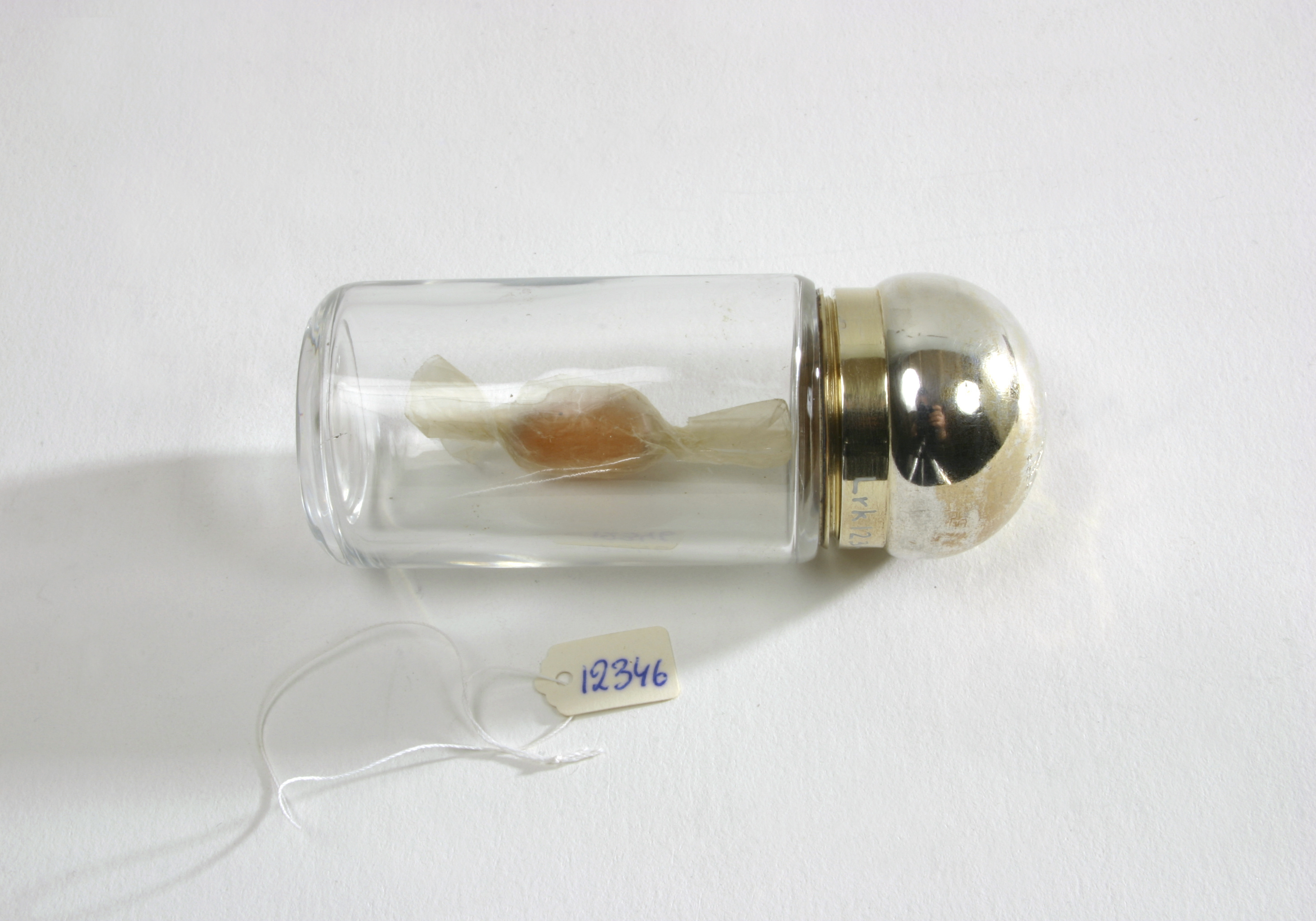 Inuti glasburken förvaras liten kulformig behållare av plast med bensin för cigarett-tändare. Behållaren inlindad i silkespapper.