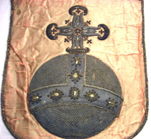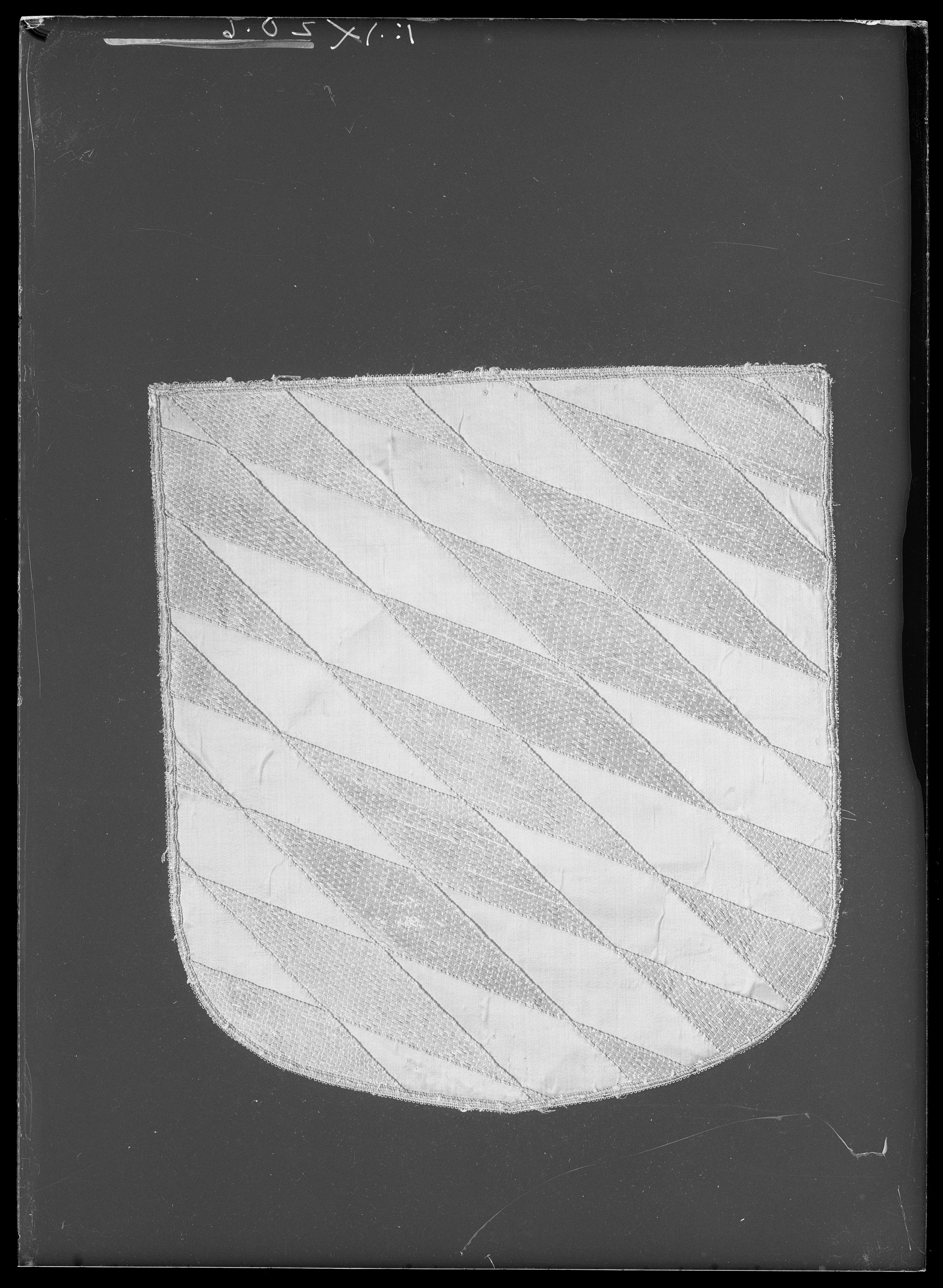 Vapenskölden har ett bottentyg av gulröd sidenatlas, kantad av en tjock snodd av smala silverlan och beigefärgad silkestråd virad runtom en silkeskärna. Ytterst kantas vapnet av en beigefärgad silkestråd trädd genom små öglor av silvertråd. Mitt på skölden är riksäpplet applicerat. Det är broderat i hög relief av silvertråd som ursprungligen varit förgylld. Tråden är nedsydd med stygn av vit silkestråd. På äpplet är broderat en vågrät och en lodrät bård av silvertråd, 48 respektive 42 mm bred. Bården kantas av en snodd av smala silverlan och silvertråd virade runt silkeskärna samt av en smal snodd av silvertråd och ett smalt band av silverlan och beige silkestråd. På bården är broderat sammanlagt sex ovaler och romber av förgylld tråd och förgyllda lan. Samtliga kantas av silvertråd runtom en silkeskärna samt av kantiljer av silvertråd som ursprungligen varit förgylld. Runtom är broderat små kärnor av kantiljer av silvertråd, ursprungligen förgylld. Äpplet kröns av ett kors av silvertråd nedsydd med stygn av vit silkestråd, 140 x 170 mm. Korset kantas av ett smalt snöre av silvertråd. Korsarmarna framställs som liljeformade blad med halvmåneformade avslut av silverlan samt kantiljer av silertråd. Vid änden vid tre av de fyra korsärmarna är broderat en blomma av små kantiljer av silvertråd. Mellan korsarmarna sticker fram en blomma med blad och stjälk. I korsets mitt är broderat ytterligare en blomma av kantiljer av silvertråd. Skölden kröns av en grevlig krona av silvertråd som visar enstaka spår från förgyllning. Kronan har en 30 mm bred kronring av silvertråd nedsydd med stygn av vit silkestråd i ett schackrutigt mönster kallat gaufrure. På kronringen är påsytt fem små ovaler och rektanglar av silverlan runtom vilka är virat röd respektive blå silkestråd. De kantas av förgyllda kantiljer och små kärnor av kantiljer av silvertråd. Kronringen kantas nederst av ett smalt vävt band av beigefärgad silkestråd och silvertråd utdragen i små öglor. Upptill kantas kronringen av en snodd av silvertråd och gul och vit silkestråd virad runtom en silkeskärna. Från kronringen utgår fem spetsar av stiliserade blad och liljeliknande former broderade med silvertråd, ursprungligen förgylld, medsydd med vita silkesstygn. Dessa kantas av smala snören av silvertråd. Mitt på vardera blad är broderat en stående rektangel av silverlan med grön och röd silkestråd, kantade av smala snoddar och av små prickar av kantiljer av silvertråd. På baksidan är vapnet klätt med beigefärgad linnelärft. Skölden är även klädd med gulnat papper. I nedre kanten på skölden är skrivet med svart bläck: "WPLÅN".