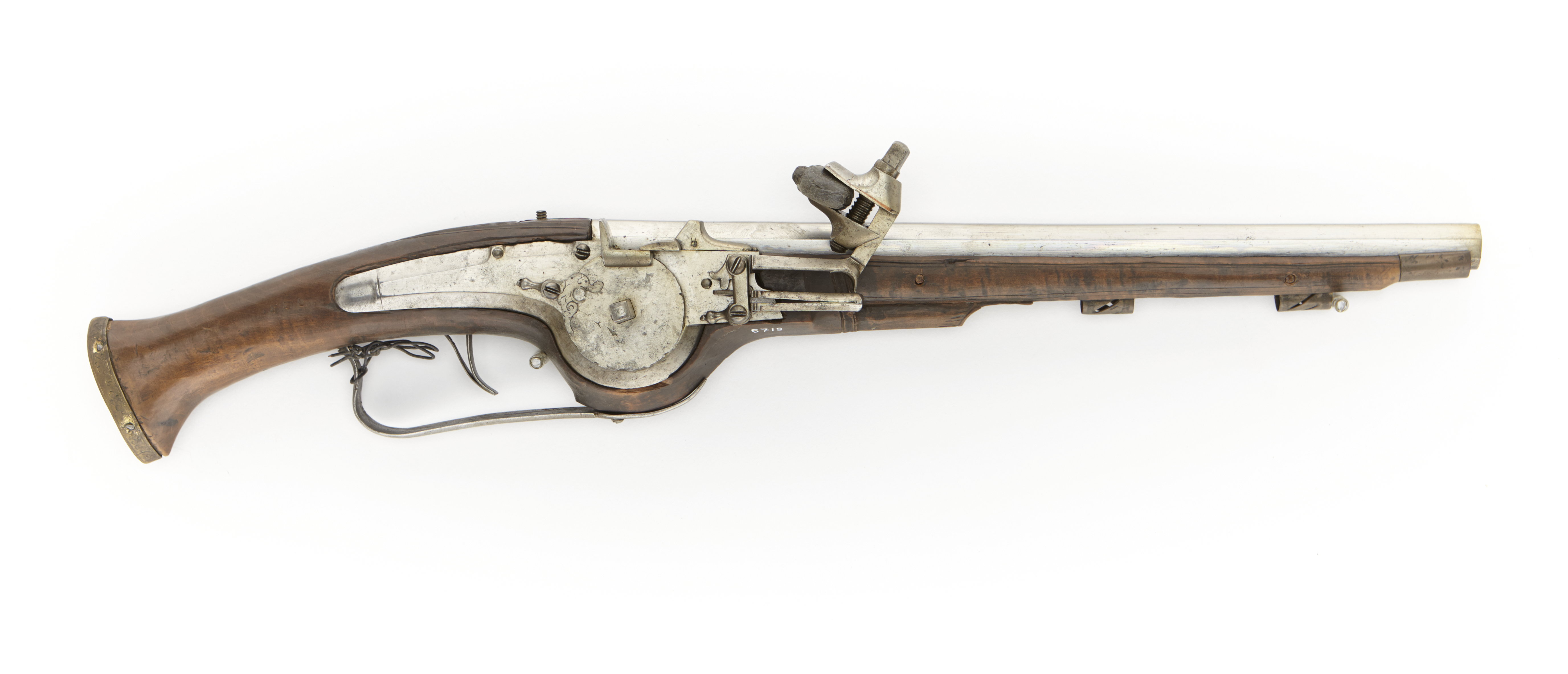 Åttkantig, slätborrad pipa av stål. Två piphäften. Hjullås. Låsbleck med fasade kanter, utsvängt för hjulet. Hjulet fastskruvat med krampa kl. 9. Låg, vertikal krutskärm. Hane med lös underkäke. Vertikalhjulstudel. Hel stock av päron ? Kolven med spetsovalt tvärsnitt. Kolvkappa av graverad mässing. Oval centrumplatta med graverad hjälm med hjälmprydnad. Kolven utsvängd för hjulet. Två låsskruvar. Pipstiften ej ursprungliga. Näsband samt genombrutna rörkor av mässing. Varbygel av stål. Fjäderbelastad avtryckare. Tillbehör: Svavelkis i blymantel. Märkt: 118 bakom låsblecket, stanstyp 5376.