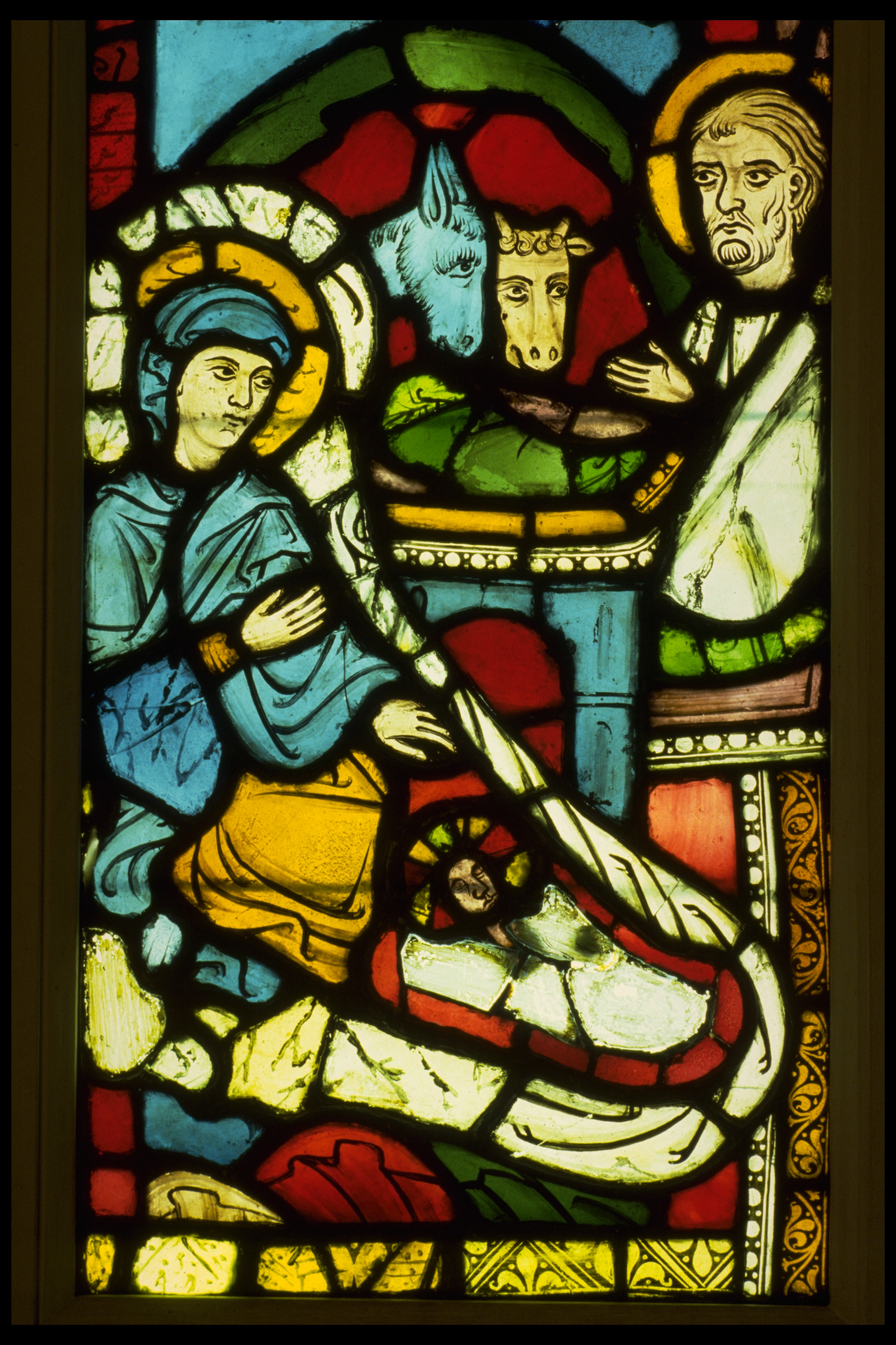 Kristi födelse. Corpus vitrearum medii aevi. Skandinavien. Stockholm 1964. Nr 19. Glasmålningen, som ursprungligen kommer från en gotländsk kyrka, skänktes 1867 av Major Hans Henric von Essen till Övergrans kyrka. 1898 såldes den tillsammans med de flera andra glasmålningar till museet. Vid förvärvet katalogiserades fyra glasmålningar som 10705:2–5. Senare katalogiserades (i museets lappkatalog) fem målningar som 10705:1–5, trots att den vid samma tillfälle förvärvade kalken från Övergran (fid. 43121) redan bar undernummer 1.