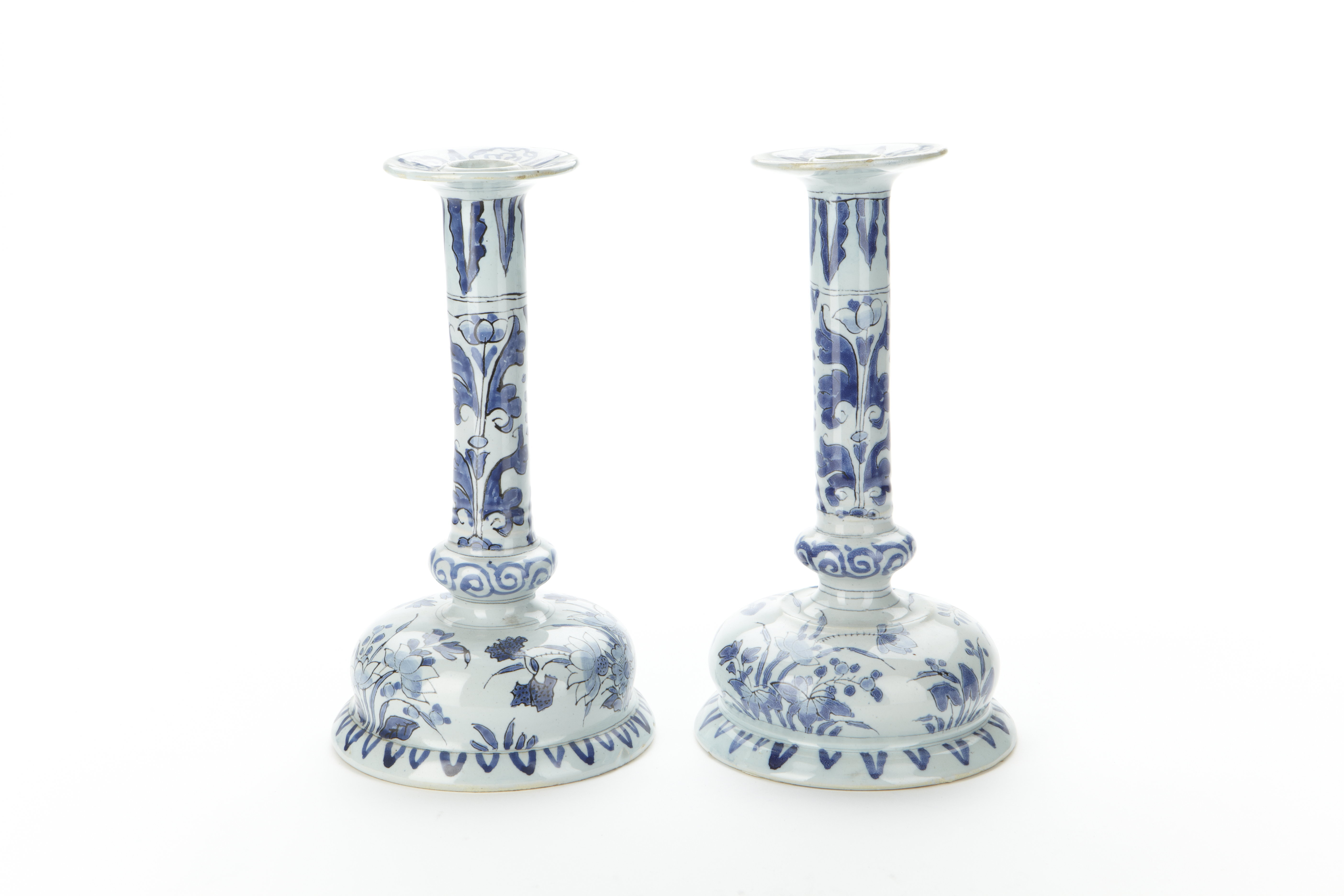 Ett par ljusstakar av fajans med blå underglasyrmålning, delvis svartkonturerad.