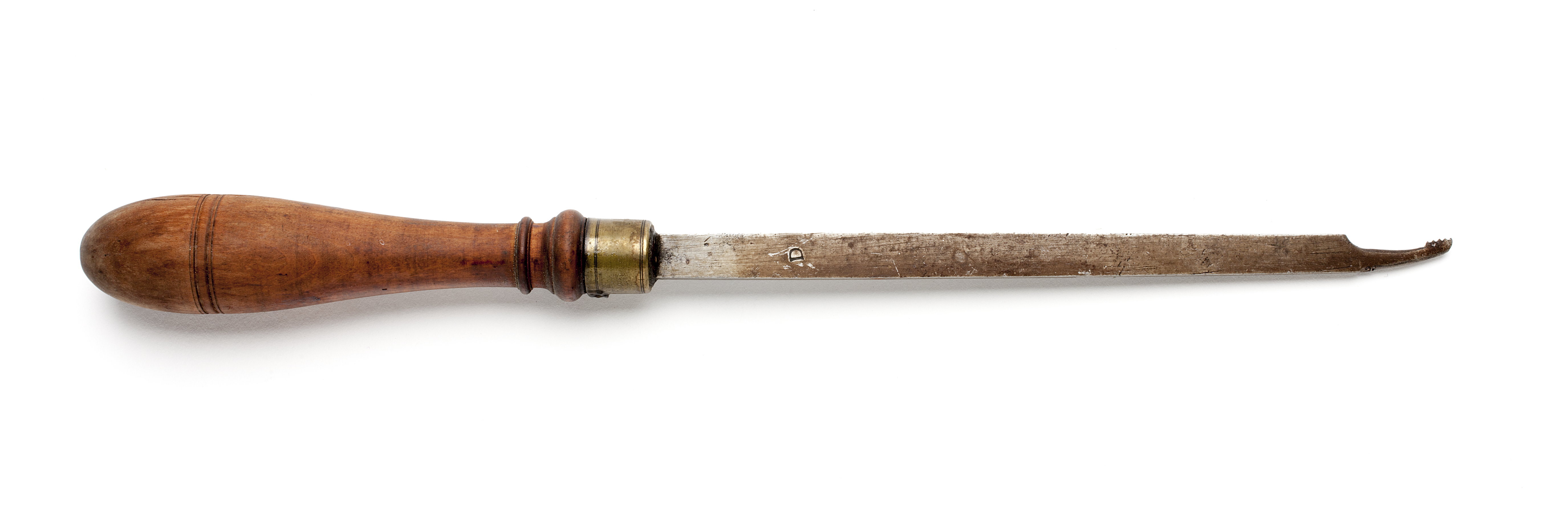 Klinga med rektangulär genomskärning. Smal, rundad ände. Vinkelställd, femtandad egg. Stämplat på klingan: "D". Svarvat skaft av päronträ, med två vulster nedtill. Mässingsring.
