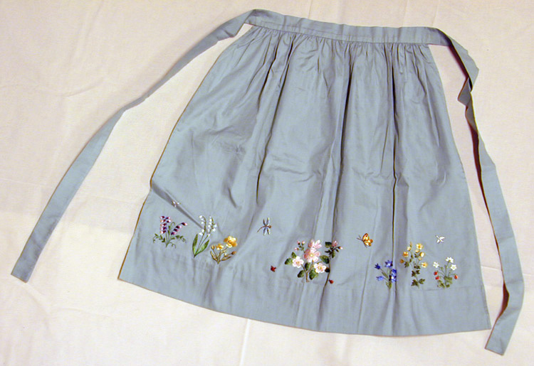 Förkläde av grågrön bomull, veckat upptill. Upptill är ett band sytt, vilket går ut i tvåsnibbar att knyta om livet. Fåll nedtill, b: 80 mm. Dekor nedtill av blommor och insekter,sydda med gul, blå, vit, röd, grön, svart och lila silkestråd.