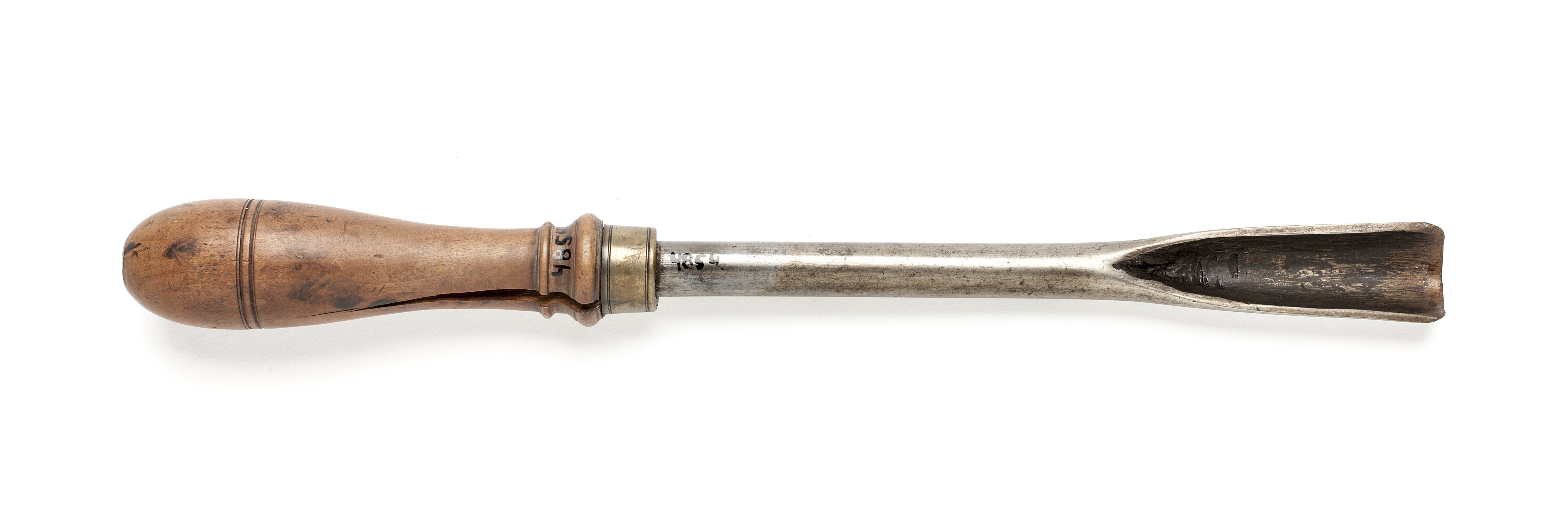 Rund klinga. Svarvat skaft av päronträ med två vulster nedtill ("skoklostertyp"). Mässingsring. Stämpel i skaftets ändträ vid fästet: otydliga siffror