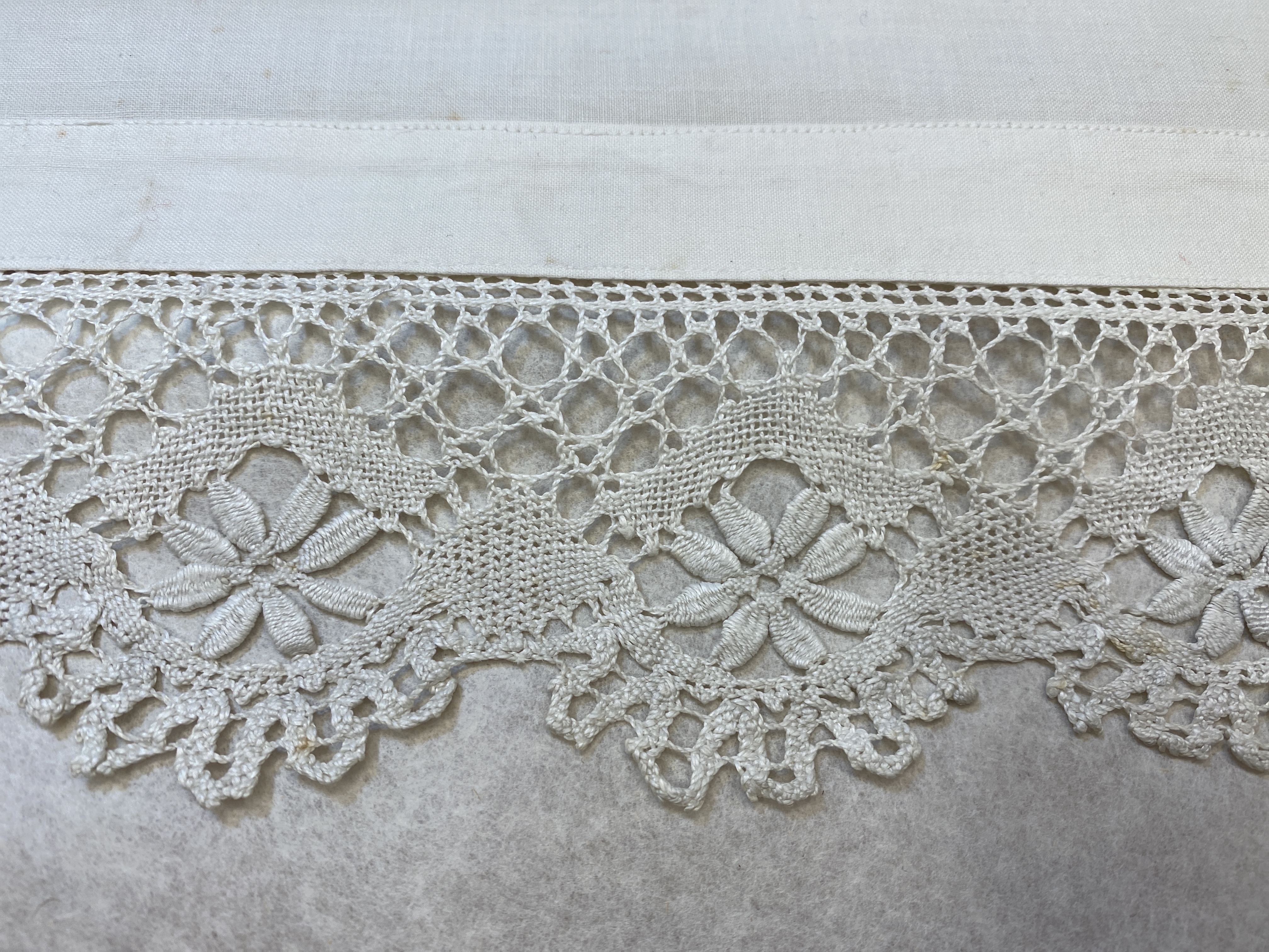 Vit bomullslärft med knypplad spets. Deponerad. Vit altarduk i tuskaftsvävd bomull. Duken är fållad i kanten och sömmen är sydd maskin. Knypplad spets, av lin, fastsydd i främre kanten. På baksidan av spetsen ser blommorna i spetsen ut att ha varit knypplade av ljusblå lintråd. / Maria Neijman