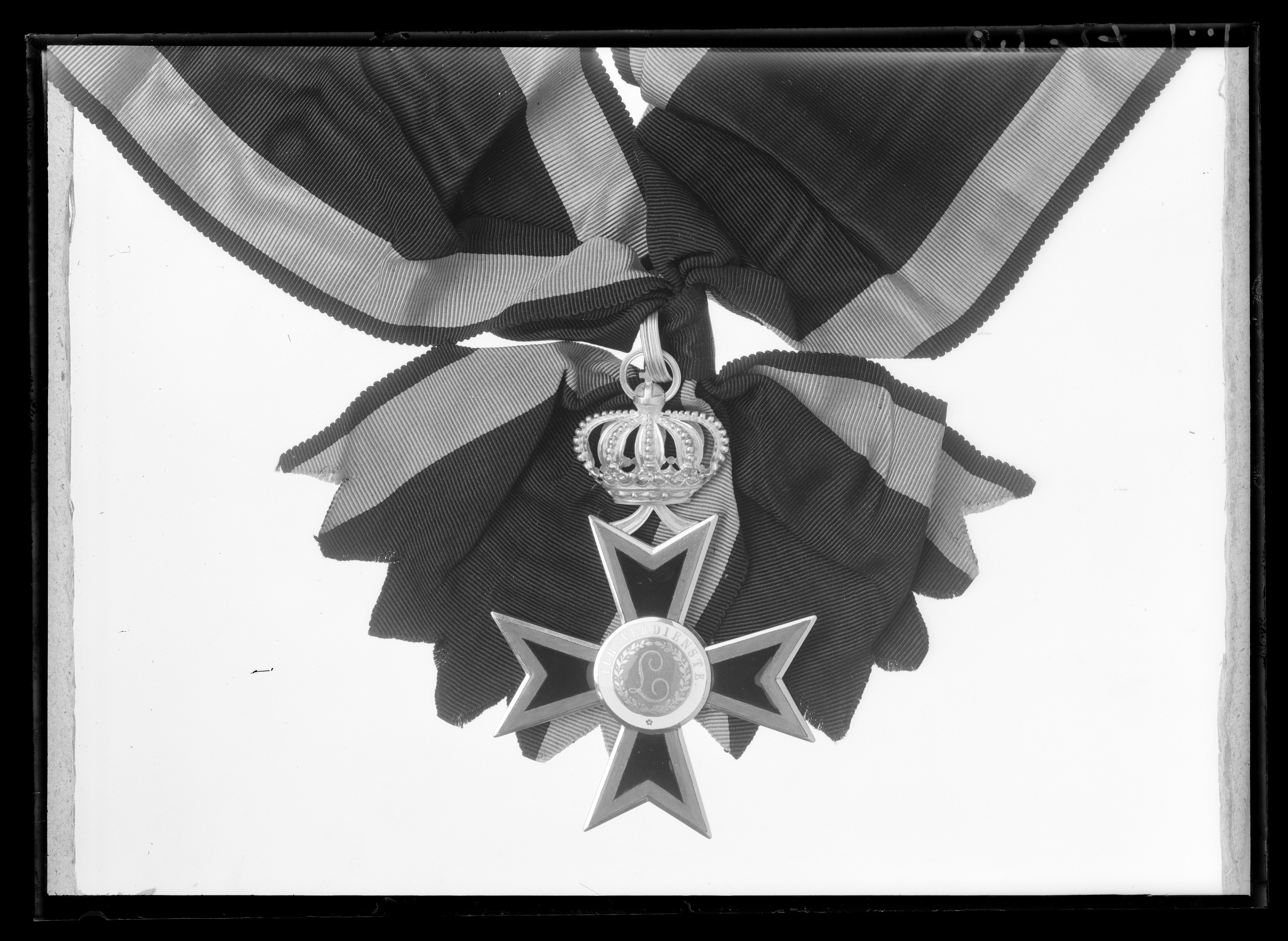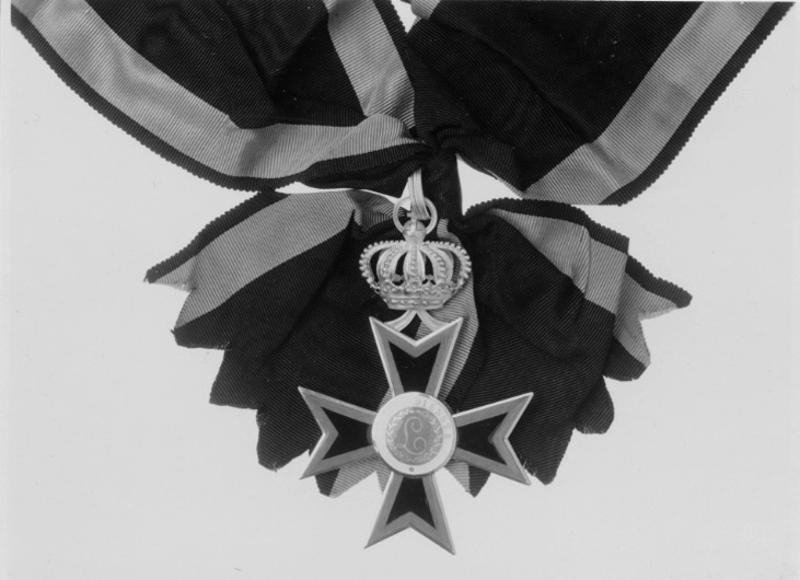 Malteserkors av guld, armarna täckta med svart emalj, 3 mm breda karminröda kanter. Svagtvälvd medaljong, täckt med röd emalj, däri av guld namnchiffer L, omgivet av lagerkrans.Däromkring vitemaljerad ring med guldtext: "FÜR VERDIENSTE". Frånsidans medaljong svagt välvd och täckt med emalj, däri guldtext: "GOTT. // EHRE. //VATER // LAND". Däromkring vitemaljerad ring, däri grönemaljerad eklövs- och lagerkrans. Mellan den övre korsarmens spetsar två band, däri fäst med scharner en kunglig krona avguld, igenom äpplet draget räfflad ring, däri oval, på utsidan räfflad bandring av guld.