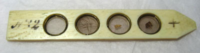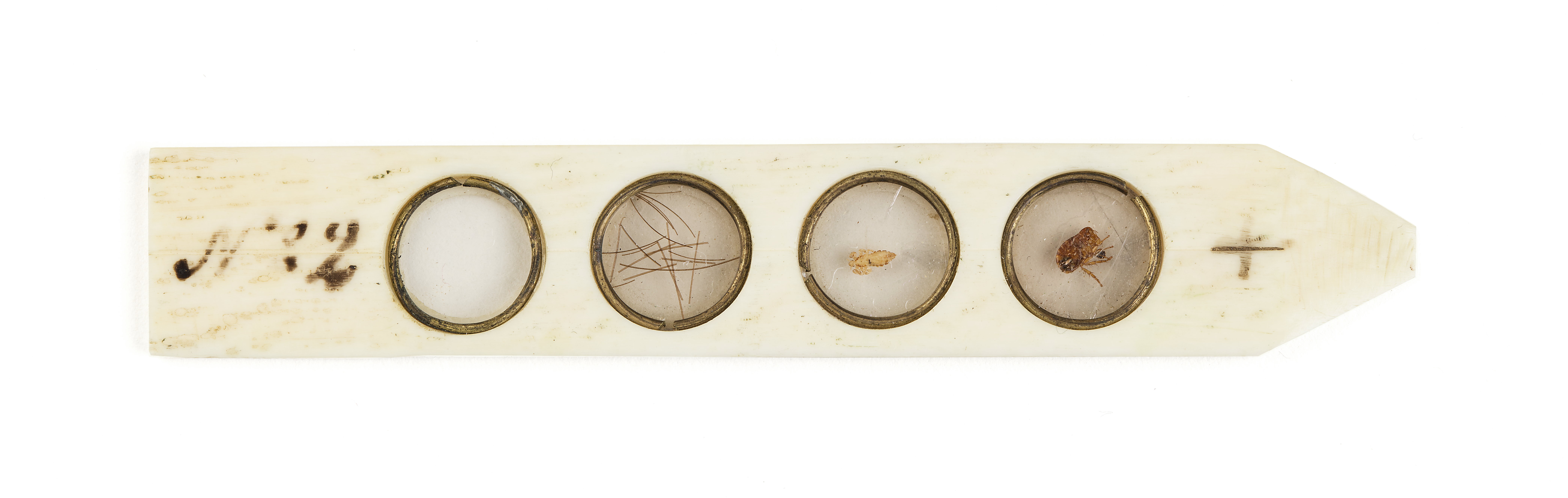 Gulvit, troligen av elfenben. Rektangulär, platt med ena änden spetsig, i andra änden svart påskrift "No 2". I mitten fyra hål på rad med glas (möjligen glimmer) och fästring av mässingstråd. No 2.X Loppa Lus m hår m skinn.