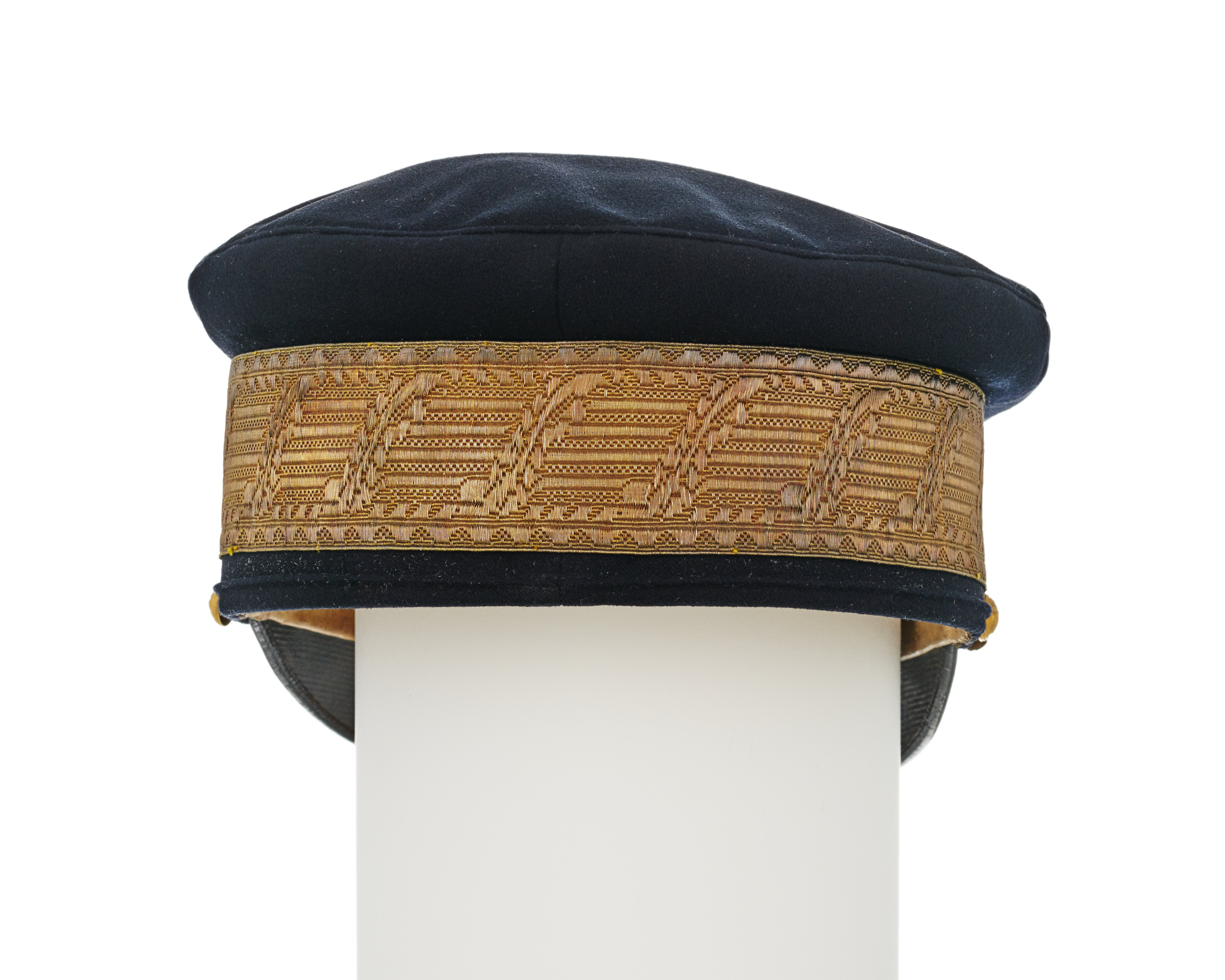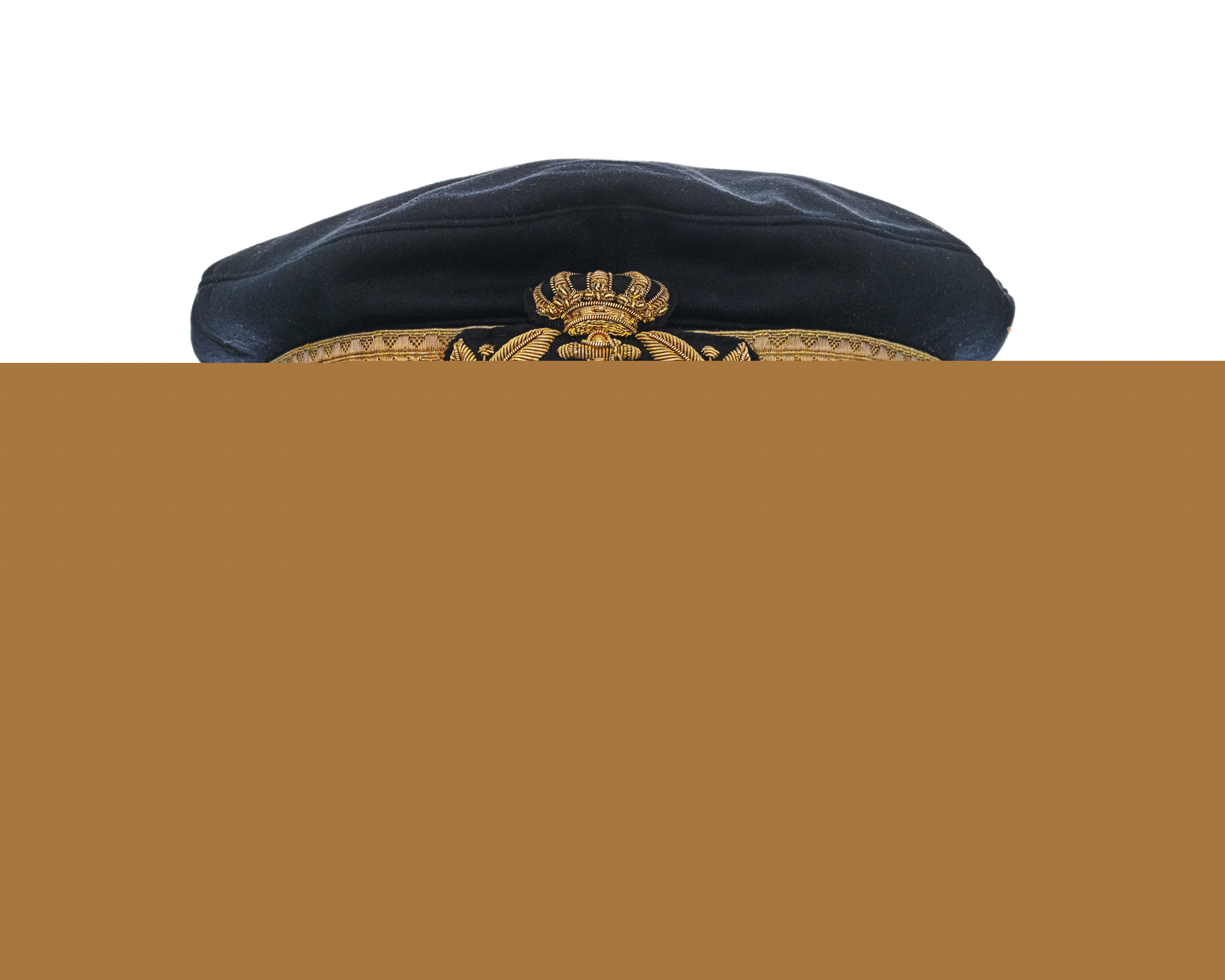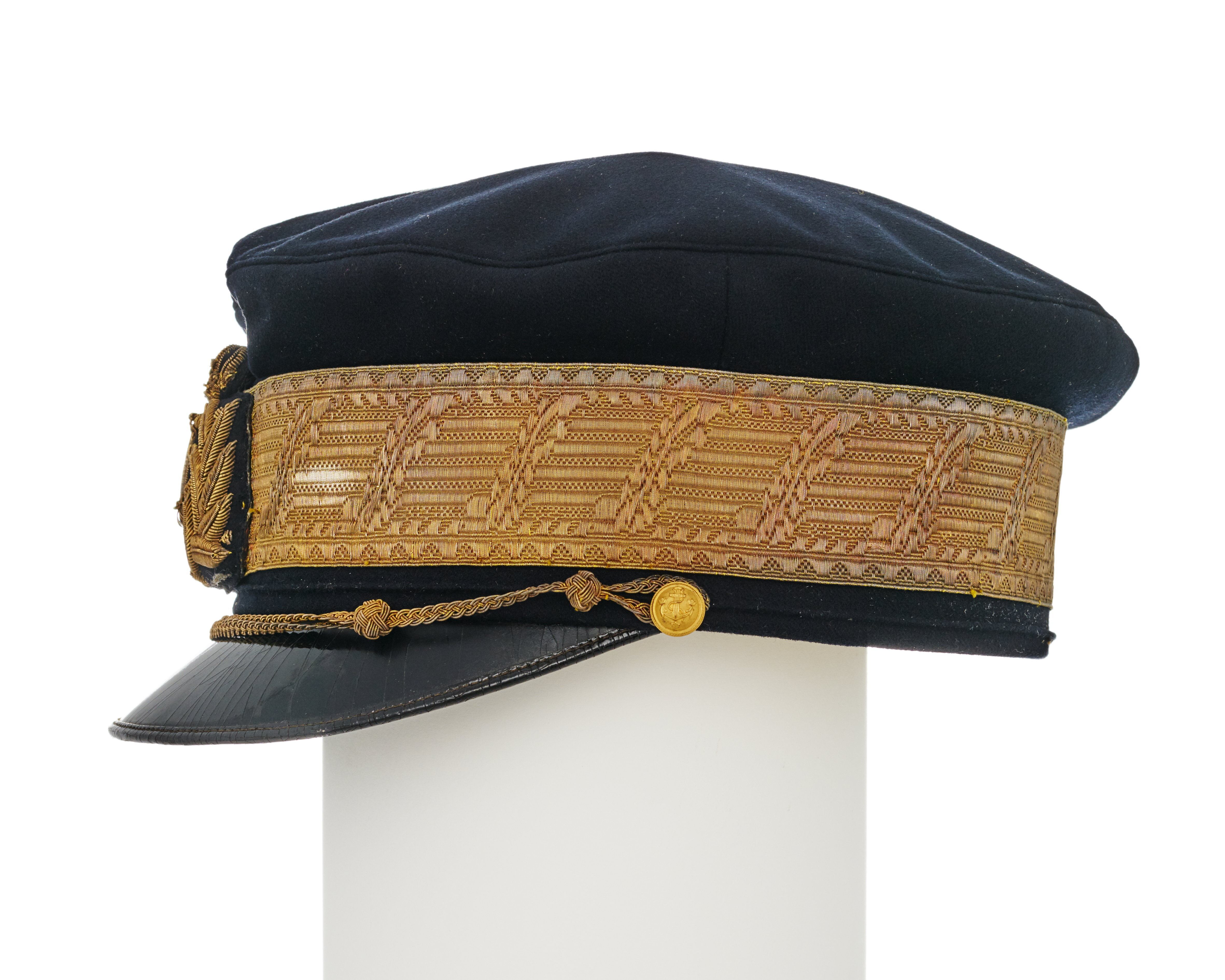 Skärmmössa av mörkblått kläde med stor kulle. Guldgalon, b: 45 mm. Påsytt mössmärke m: 78. Hakrem, guld, rund, m: 82. Välvd mössknapp, förgylld och med ankare och tre kronor, d: 11 mm. Svart lackerad skärm, på undersidan matt. Foder av vitt siden, vadderad, i kullen rutstickad och med Oskar II:s krönta namnchiffer. Svettrem av beigefärgat läder, b: 35-44 mm, upptill fastsydd i mössan och baktill med fyra korslagda lädersnibbar. Mössan ligger i en fyrkantig pappkartong med på locket en rund firmaetikett: "MILITÄR-EKIPERINGS A-B // M.E. // A. // NORRMALMSTORG // STOCKHOLM".