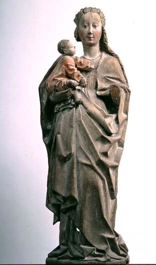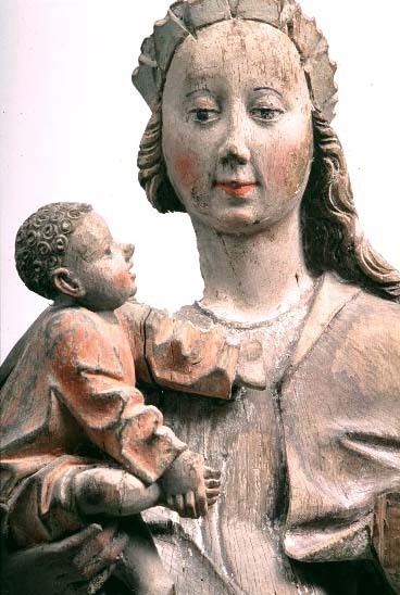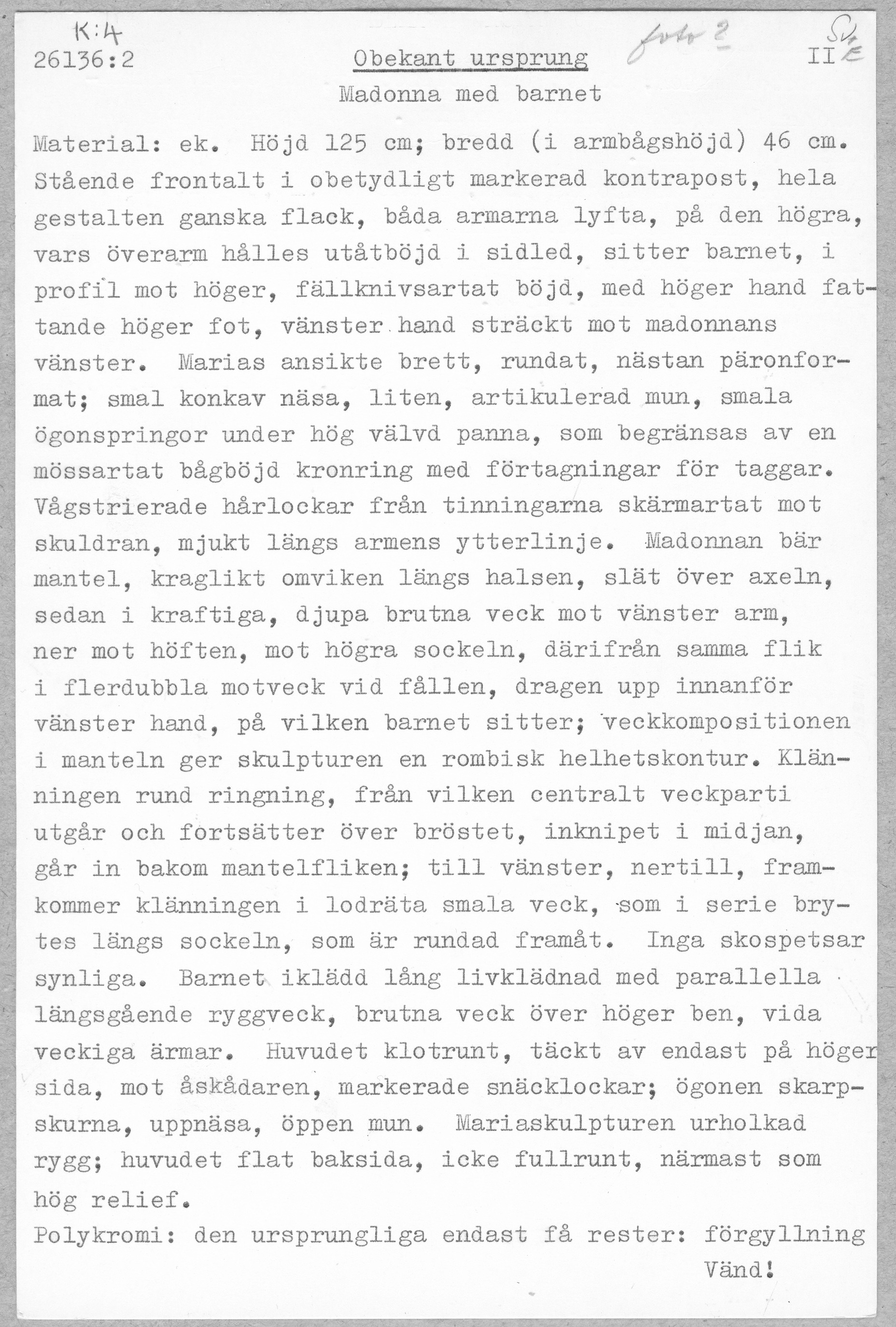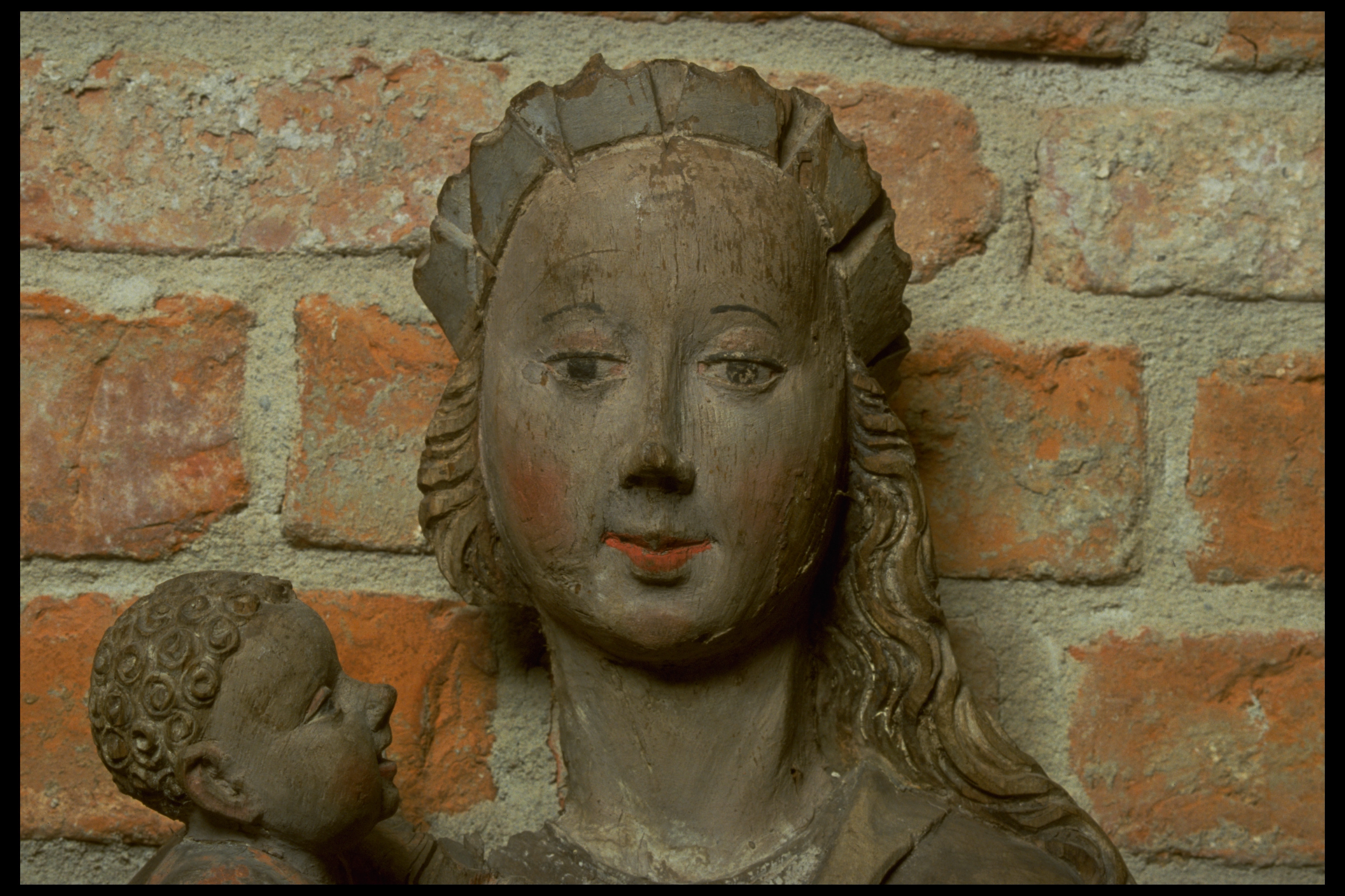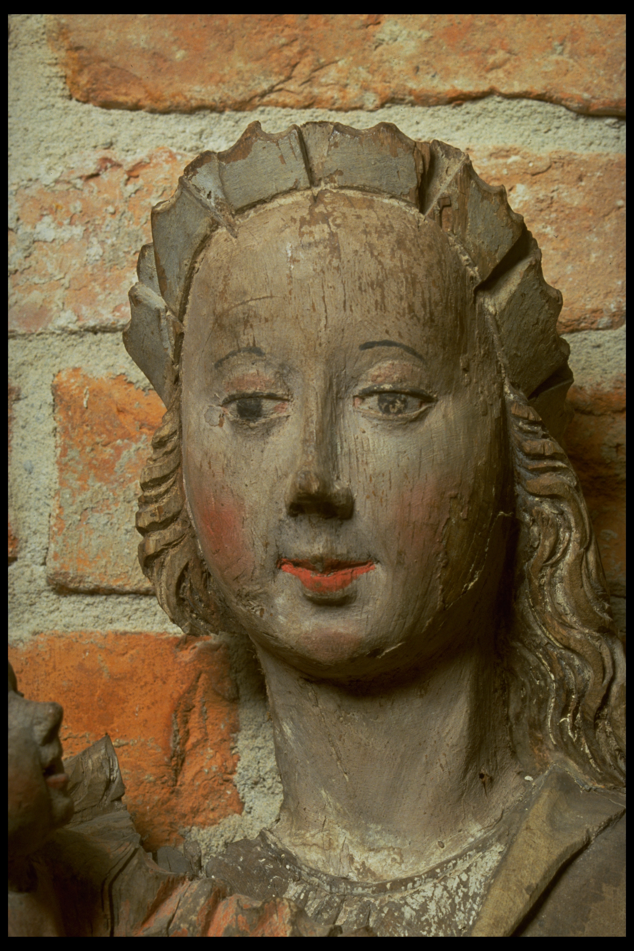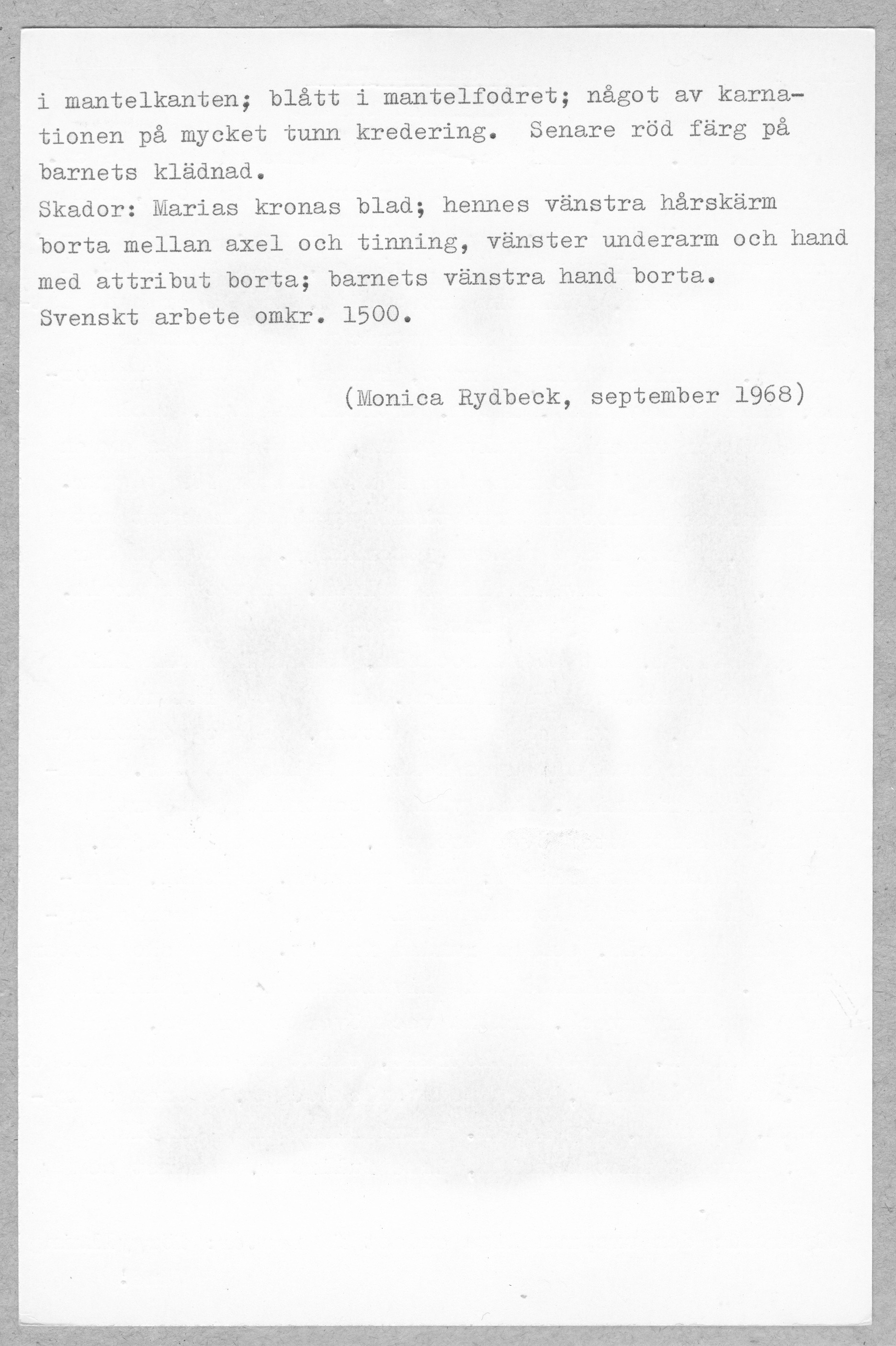 Kondition: Marias vänstra hand, barnets vänstra hand och fot avbrutna, Marias lockar och krona fragmentariska. Färg: av ursprunglig färg och kredering återstår endast fragment; bilden är sekundärt målad utan kredering.