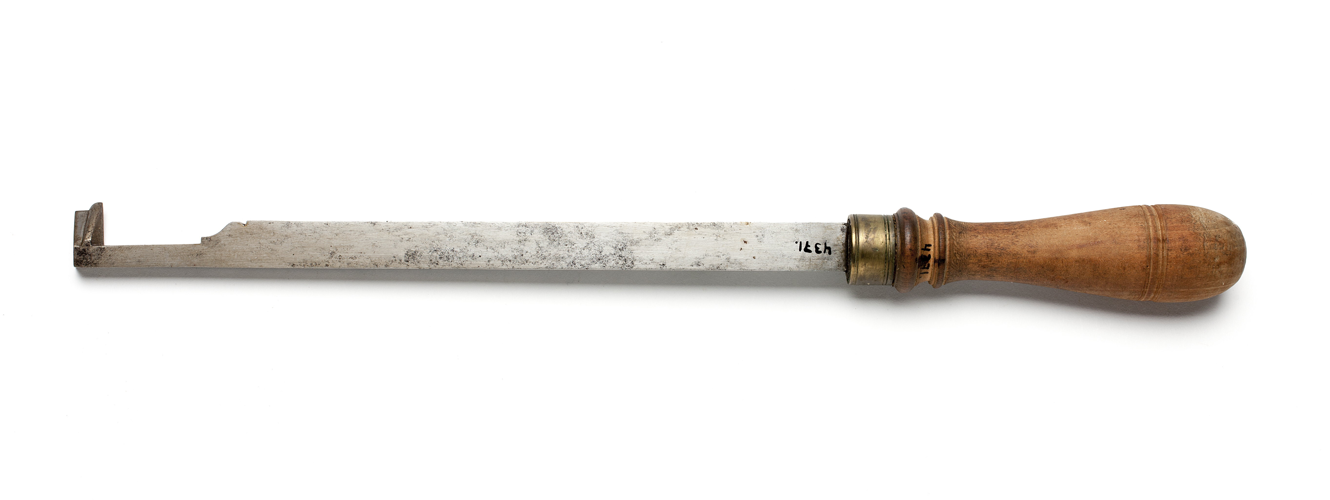 Klinga med rektangulär genomskärning, övergående via profilering på ena sidan i smalare, vinkelböjd ände. Egg bildad av en rak och en kvartscirkelformad konvex del. Stämplat på klingan: "IK" under krona, Johan Kesemaker, Stockholm. Svarvat skaft av päronträ, med två vulster nedtill ("rydboholmstyp"). Mässingsring. Stämplat på skaftet: "NB".