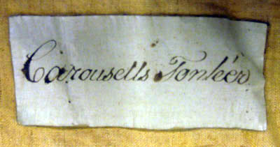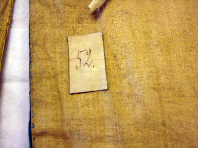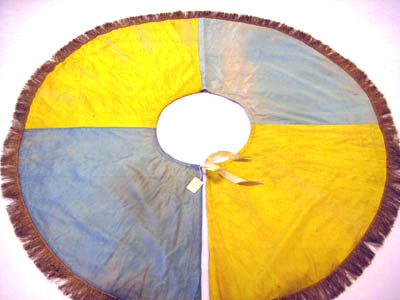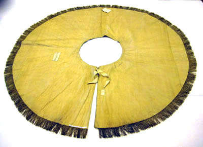 Tornerskört sytt i ljus blå och gul taft med guldfrans. Skörtet är rundskuret med en öppning och sydd av fyra delar. En dragsko i midjan är 20 mm bred. Längst ner är en drejad guldfrans av kantiljtråd som är 65 mm bred och 4440 mm lång. Fodret är av beige linne med en vävbredd på 620 mm. Tre etiketter är fäst på insidan av skörtet. Ett etikett av papper beklädd med kreppelin med siffra no. 52 är fäst vid v. sida.