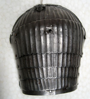 Driven blankpolerad stålplåt med vertikala räfflor och skurna linjer. Bestående av sammanlagt fem skenor, fästade i varandra med nitar i sidorna. Välvd, nedåt avsmalnande med rundad övre kant och rak nedre. Övre kanten omvikt, rundsmdd med punsade snedställda injer. Skenorna vertikalt räfflade med vågiga kanter och skurna linjer på räfflornas åsar. 10 mm bred slät och försänkt kantbård. Sista skenans nedre kant tvärt avslutad. Upptill spänne av stål, L 36 mm, rektangulär ram med konturerad kant. Framför detta rektangulärt remhål. Till vänster ett genomgående hål, diam 4,5 mm. Äldre lagning av påsmidd och nitad plåtbit, 90 X 45 mm. Insidan brunsvart med slagmärken. Nertill i ena sidan brun läderrem, L 244 mm. I andra sidan nitat ursprungligt spänne lika som upptill, L 31 mm. Plåtens tjocklek varierande, ca 1-2 mm. Tunnare i kanterna. Armskena (överarm, armbågsskydd samt underarm) tillhörande axelstycket är monterade på axelstycke tillhörande armpansar 24688, gnr 2613:h, och är utställda i Livrustkammaren.