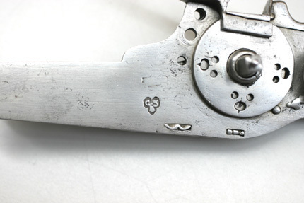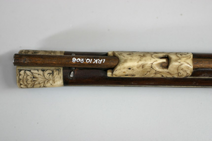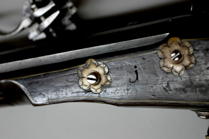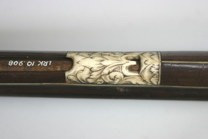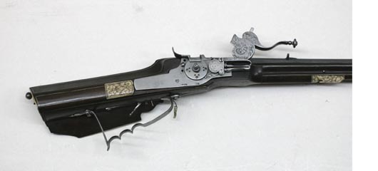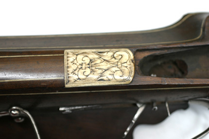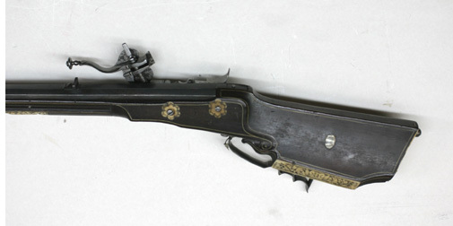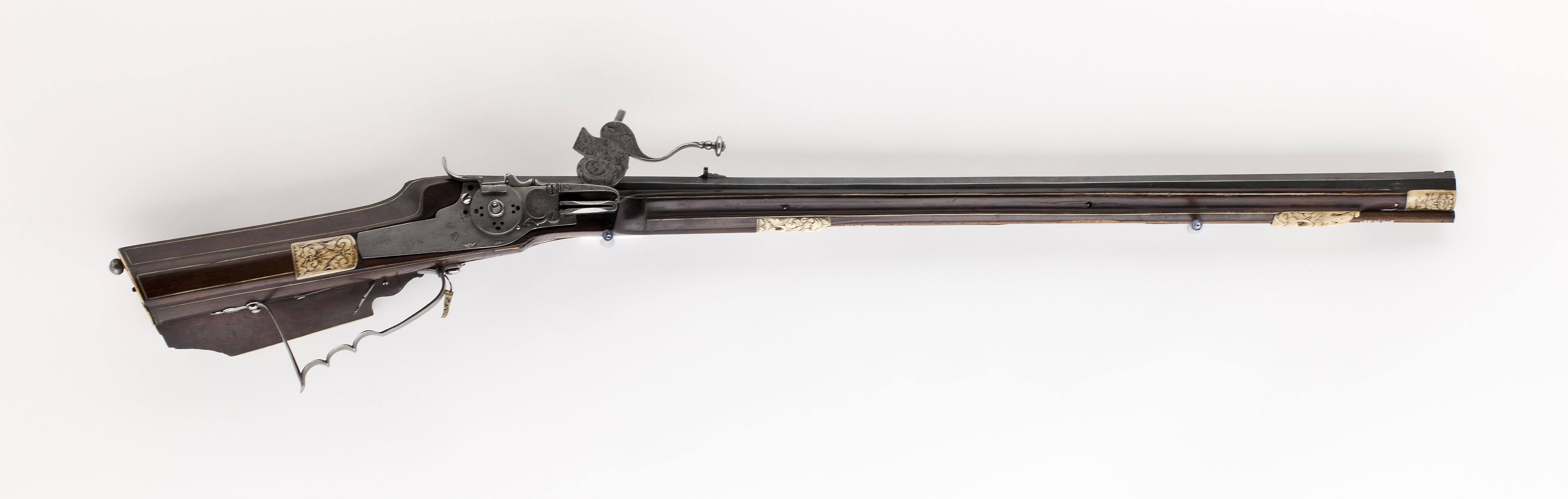 Åttsidig, svartanlöpt pipa av stål, åtta breda räfflor. Rektangulärt, kort svansskruvblad. Riktmedel: Inlaxade riktmedel, ståndsikte, kornet saknas. Fästning: Tre häften, pipan fäst med krysskruv underifrån samt tre pipstift av stål. På h sida vid pipbasen inborrat ett gängat hål för fästning av låsblecket. Hjullås med plant, odekorerat låsbleck, stämpel C S över blomliknande figur (Lrk vägledning 1921:372). Hjul täckt av låg, plant hjulkapsel, genombruten på tre ställen med grupper om tre hål, två runda och ett ovalt. Fängpanna med rak utsida, vågtät, i bakänden uppåtsvängd krutskärm med rundad ände, fängpannelock med rörlig arm, kraftigt profilerat grepp. Hane med fyrsidig, i framänden nedåtsvängd kropp, graverad bladdekor, hals och huvud täckt av stor, plan, konturerad platta med graverad dekor i form av drakhuvuden, övergående i lågt, s-formigt svängt fingergrepp med avslutning i form av rund skiva. Käkar med tvärt avskurna läppar, underkäken lös, käkskruv med högt, fyrsidigt huvud. Hanfjäder med delvis fasade kanter, långt, s-formigt svängt, konturerat fjäderlöv. Hanstudel med rund platta, graverad blomma. Fästning: Låset ursprungligen fäst med två låsskruvar från v sida, nu ersatta av en skruv från h sida in i pipan. Två korta ersättningsskruvar från v sida. Avtryckare med snälltryck. Helstock av mörkbrunt trä med smala benlister, kolv av tysk typ med kolvlåda och vinge, snidad bladvolut vid vingen. Välvt kolvlådelock med benplatta i framänden, bladranksdekor, på lockets insida inskuret över hela bredden: VIIIIII. Beslag av ben, bakplåt med graverade kantlister samt mittblomma, stödkula av stål. Mitt på anslaget en liten oval pärlemorplatta. På vingen kantlist av ben med dekor som på bakplåten. Två låsskruvbrickor i form av sexbladiga blommor. I laddstocksrännans båda ändar benplattor med graverad dekor som på bakplåten, genombrutna av B-formiga öppningar, näsband med graverad dekor. Varbygel av stål med lång bakre stolpe, tre fingerlägen, bakstolpen fäst med två skruvar, ändblad med hjärtformig spets. Tillbehör: Laddstock av trä, l: 806 mm, i framänden skodd med stålplatta.