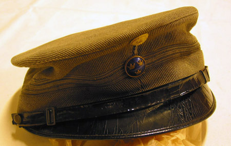 Gråbrungrön skärmössa med ryttmästares gradbeteckning och framtill gul kokard. Fodrad med svart bomullssatäng och med fyra löstagbara tygklädda stålfjädrar. I mösskullen firmamärke i guldtryck: " M. E. // A. " samt hertigkrona och initialerna: " G. A". Svettrem av naturfärgat läder, b: 37 mm. I övrigt modellenlig.