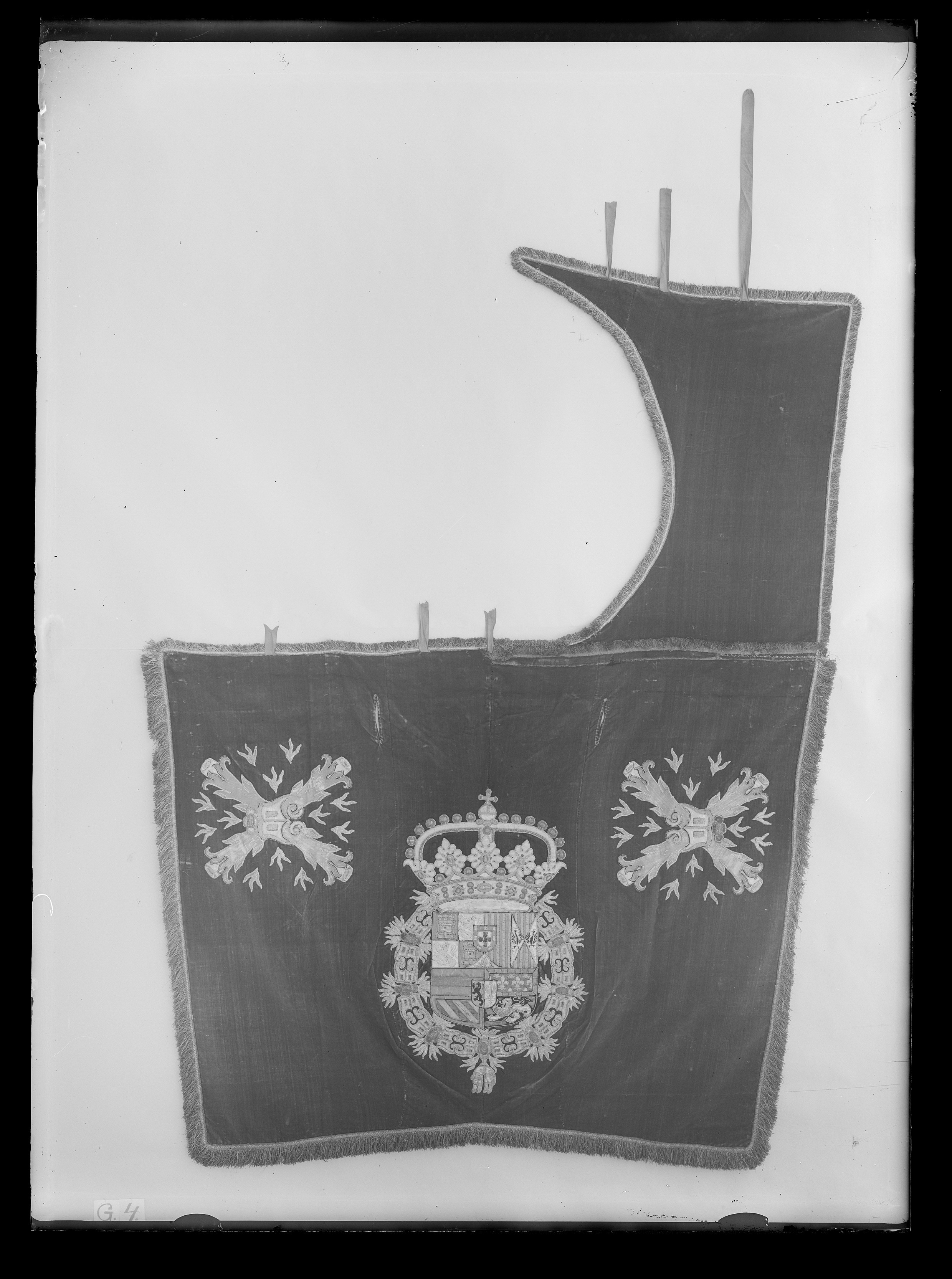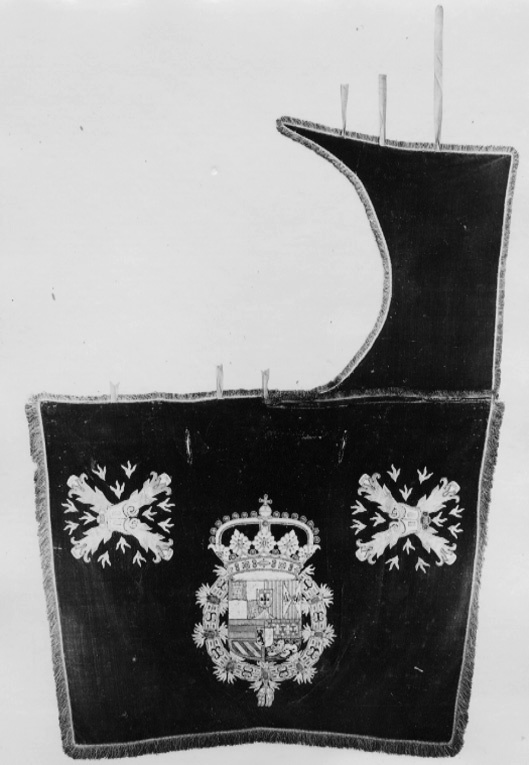 Bottentyg av röd sammet i kypert i fyra figursydda våder, de två yttre 530 mm breda till 220 mm från sammetens bakre kant där de är 460 mm. De två inre är 195 mm vid bakre kanten och 250 mm vid främre. 25 mm från sömmen mellan yttre och inre våderna och 100 mm från främre kanten 100 mm långa sprund, kantade med sammet. Bogstycket färst på höger sida. 80 mm från bakre kanten det spanska vapnet 720 mm högt och 500 mm som bredast. I de främre hörnen i kvistkors stål och flinta ca 350 mm högt och 400 mm brett, med eldtungor. Kungliga vapenskölden delad, på övre fältet Spaniens vapen med Portugal i hjärtsköld och Granada i mantelsnitt, på undre fältet Nederländenas vapen med Flandern och Tyrolen i kluven hjärtsköld. Övre fältet kluvet, högra delen kvadrerad med i fält 1 och 4 Kastilien, 1 2 och 3 Leon, vänstra delen kluven i Aragonien och Sicilien. Undre fältet kvadrerat med i fält 1 Österrike, i 2 och 3 gamla och nya Burgund och i 4 Brabant. Kastilien: kastaler av gyllenduk på röd sidenbotten. Leon: ljusa lejon av silke i schattersöm på gyllenduk. Aragonien: röd sidenbotten med bjälkar av guldtråd i läggsöm. Sicilien: örnar av svart silke i schattersöm på gyllenduk. Portugal: röd sidenbård med guldkastaler, silversköld av gyllenduk med fem små sköldar av blått silke i plattsöm med bollar, två, en och två, av silvertråd. Granada: granat av ljust rosa silke i schattersöm och gröna blad på gyllenduk. Österrike: röd sidenbotten med bjälke av metalltråd i läggsöm. Burgund, gamla: bård av rött siden och silver i läggsöm, mittfält av blått siden med franska liljor i plattsöm av guldtråd. Burgund, nya: bård av rött siden, balkat mittfält av blått siden och guldtråd i läggsöm. Brabant: gult lejon av gyllenduk på svart sidenbotten. Flandern: lejon av svart silke i schattersöm på gul gyllenduk. Tyrolen: örn av ljust rosa silke i schattersöm på gul gyllenduk. Vapnet krönes av en sluten krona, av applikationer av gul gyllenduk och pärlformer av silver och guldtråd och silke i blått, rött och rosa. Vapenskölden omges av gyllene skinnets orden av applikationer av gul gyllenduk som stål och blå gyllenduk i fyrpassblomma med stygn av blått silke och i mitten en ellipsform med läggsöm av silver, och eldgnistor broderade med lan av guld och silver. Kvistkorsets armar av röd sidenatlas och med kanonmynningar av gyllenduk och öppningar av silverlan. Flinta av gyllenduk med bård av guldsnoddar i läggsöm. Eldgnistor av guld och silverlan. Frans i två lager, det undre av rött silke, det övre av guld och silver med ca 6 mm stad. Längs schabrakets sidor och bakre kant 50 mm bred, längs framkanten och runt bostycket 30 mm, silkesfransen mellan framkant och bogstycke i sömmen, men guld och silverfransen fastsydd 15 mm innanför denna, hängande åt motsatt håll. Fem lädertampar med mässingsringar längs framkanten. På vänstra halvans främre kant tre röda sidenband 30 mm breda och 80 mm, 115 mm och 115 mm långa. På bogstyckets fria kant tre sidenband 30 mm breda och 180 mm, 240 mm och 500 mm långa. Foder av linne i tuskaft.