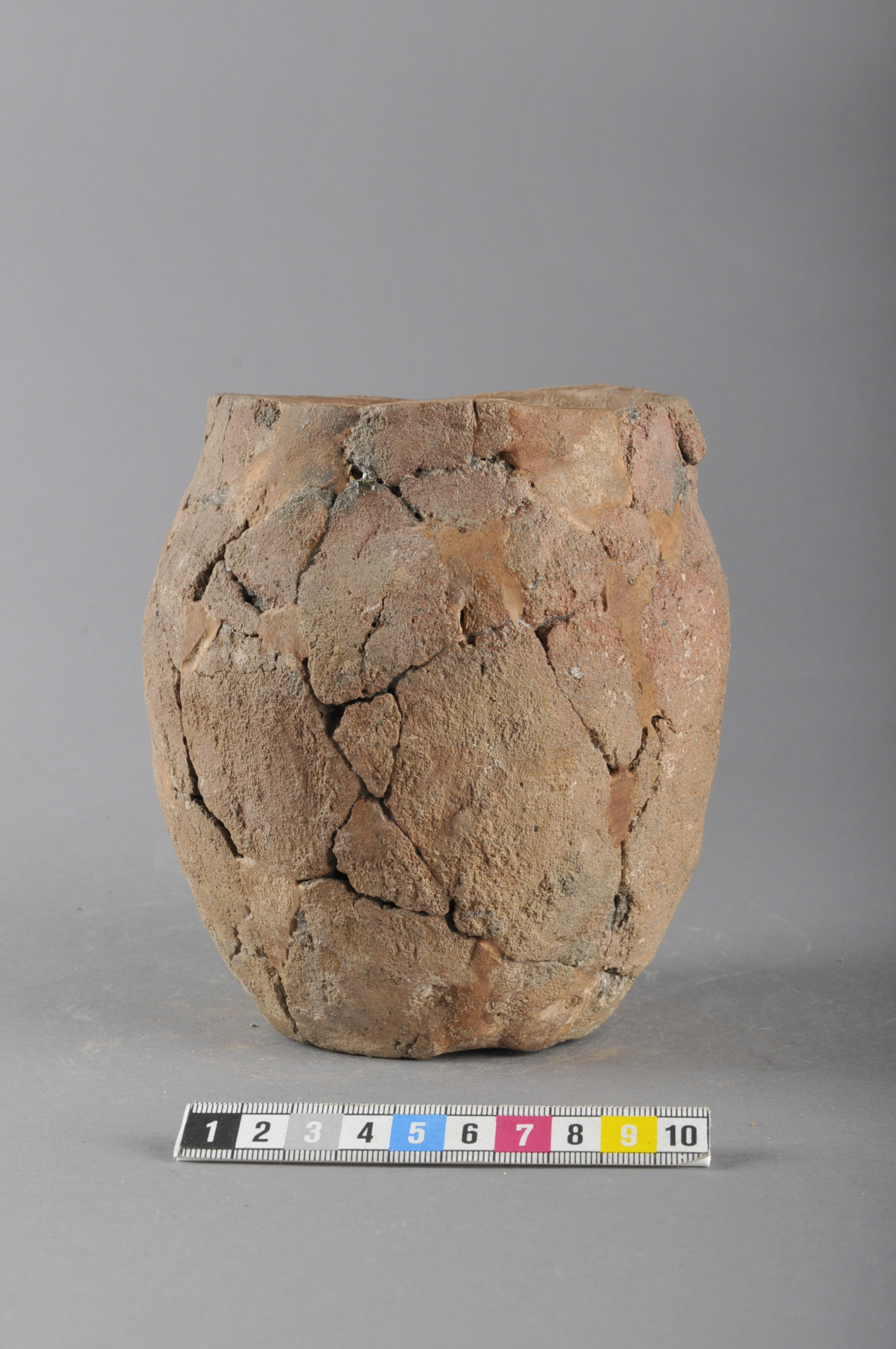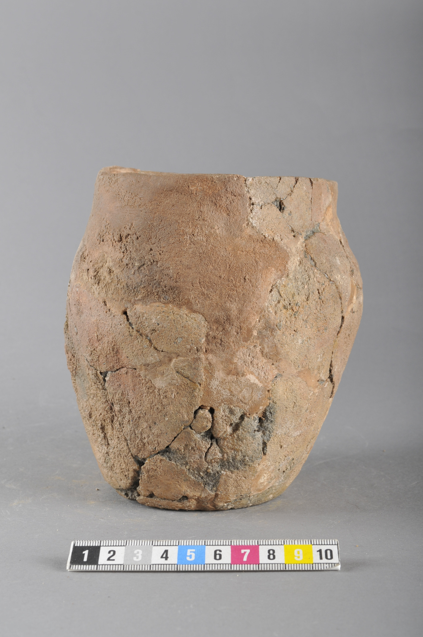 Delvis rekonstruerat upp till mynningsranden finrabbat kärl med knopp vid mynning. Hela urnan något skev. Godset är grovt och kvartsblandat.