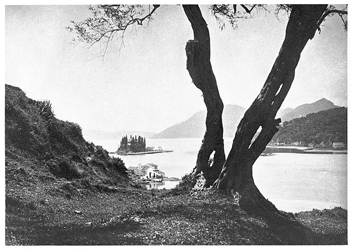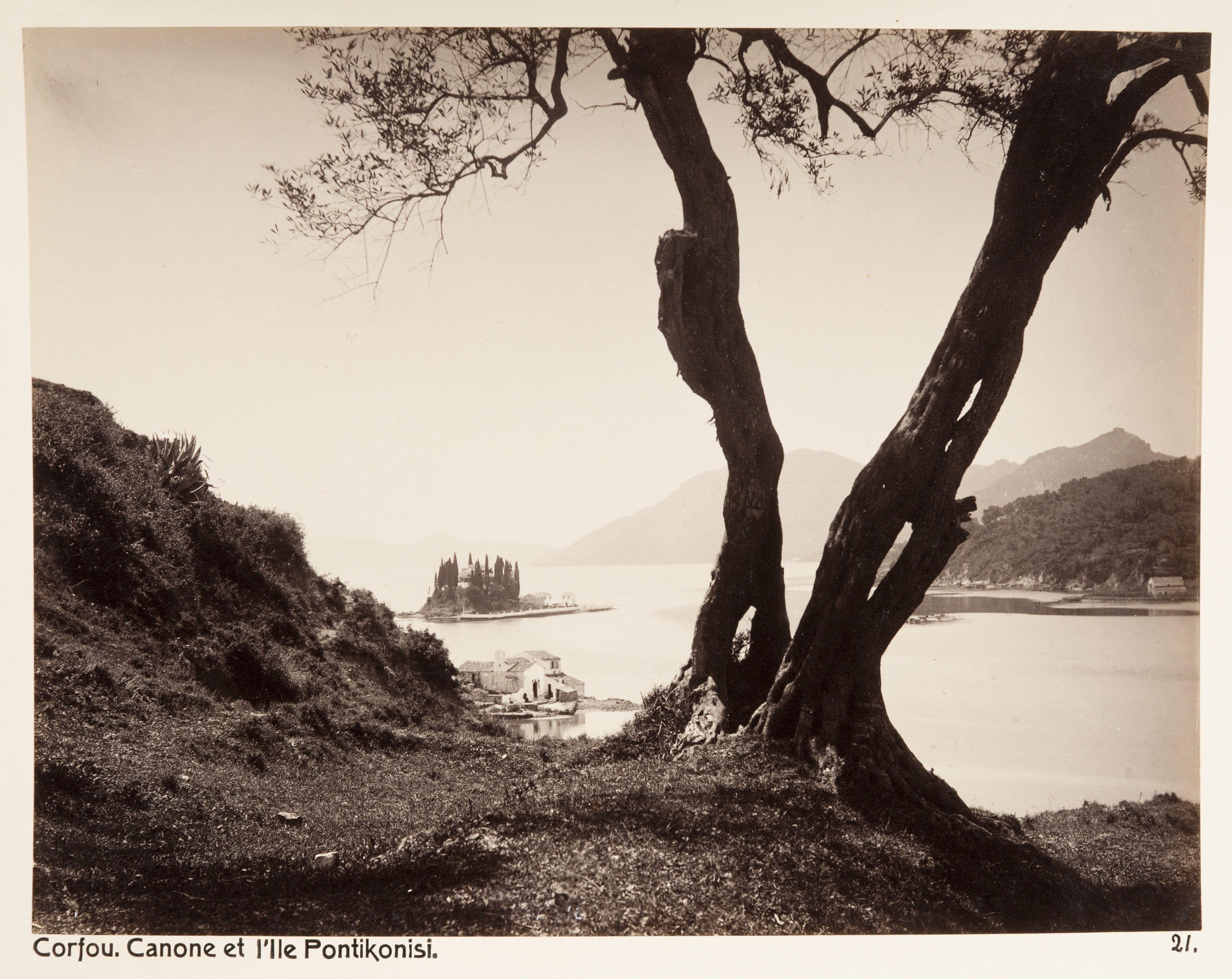 Kanoni och ön Pontikonísi, Korfu. Text på originalet: Canone et l´île Pontikonisi. Korfu, Grekland. Foto från resa genom Grekland, Makedonien och Serbien, 15 mars-6 juni 1896. Fotografierna LXVI:K.18.-147. är köpta av Wilhelmina von Hallwyl, f. Kempe på Korfu samt i Patras, Nafplion, Aten, Thessaloniki och Belgrad. Med på resan var maken Walther von Hallwyl och fröken Ida Uhse. Uppgifterna kommer från Ida Uhses reseanteckningar.