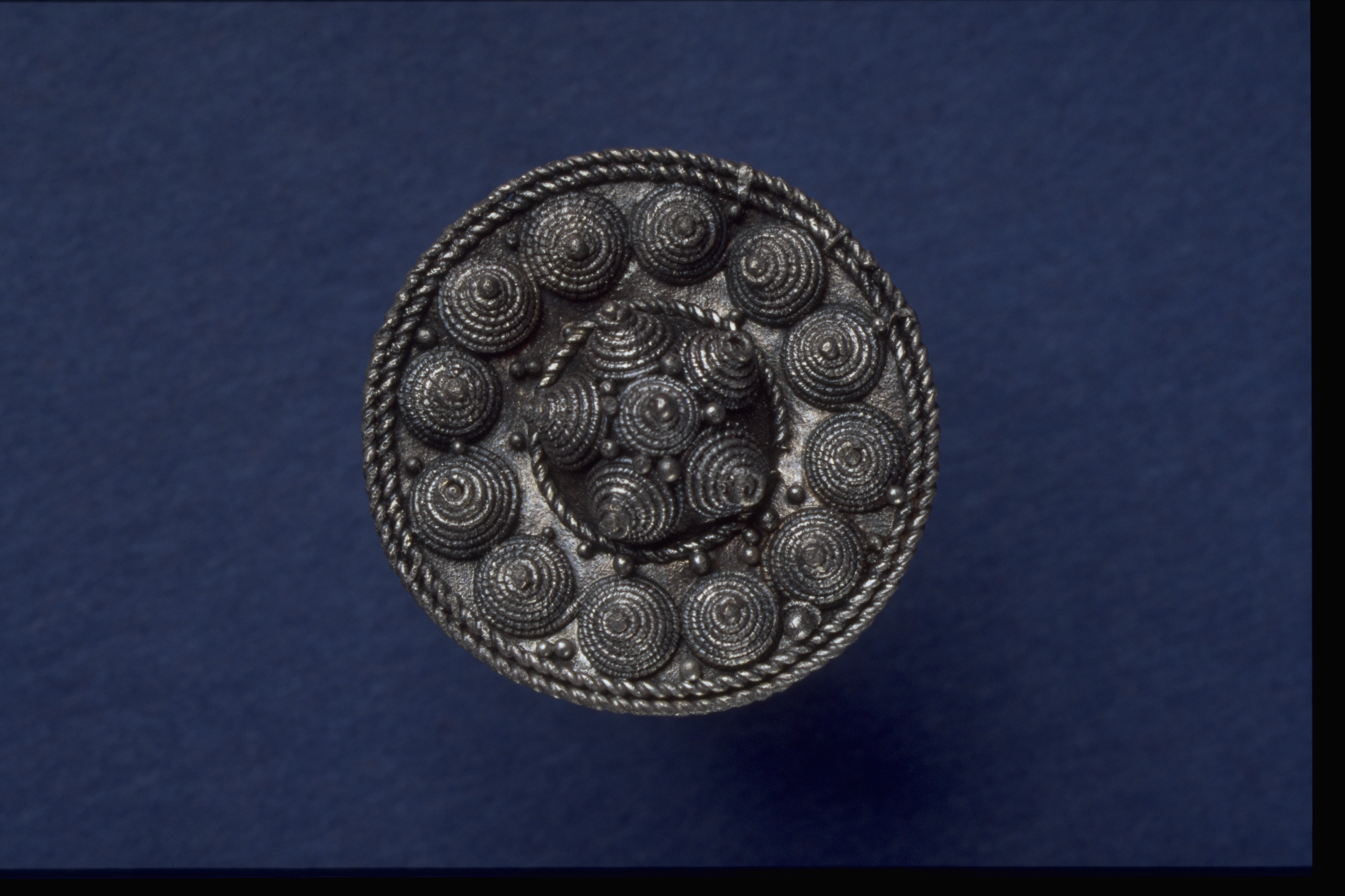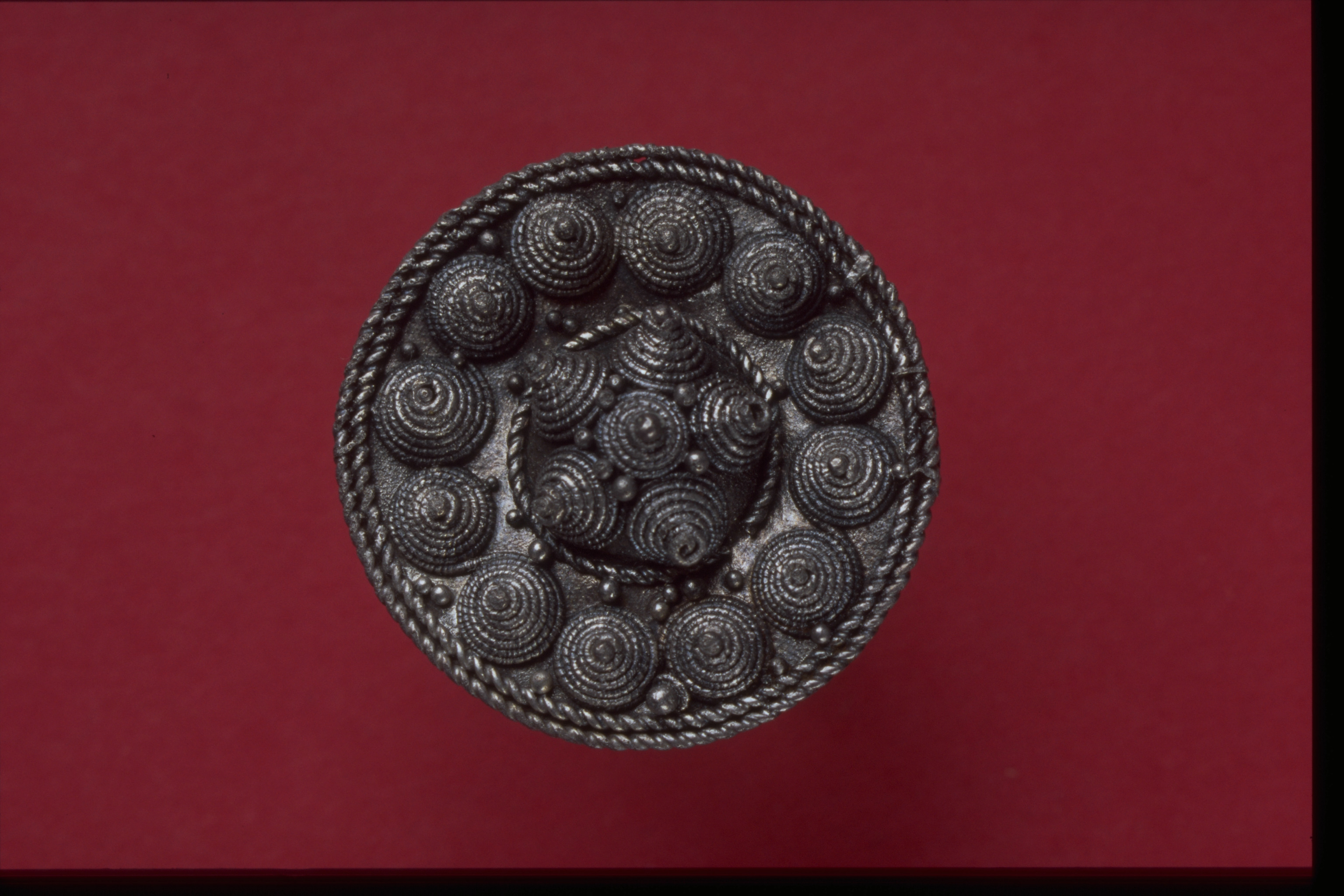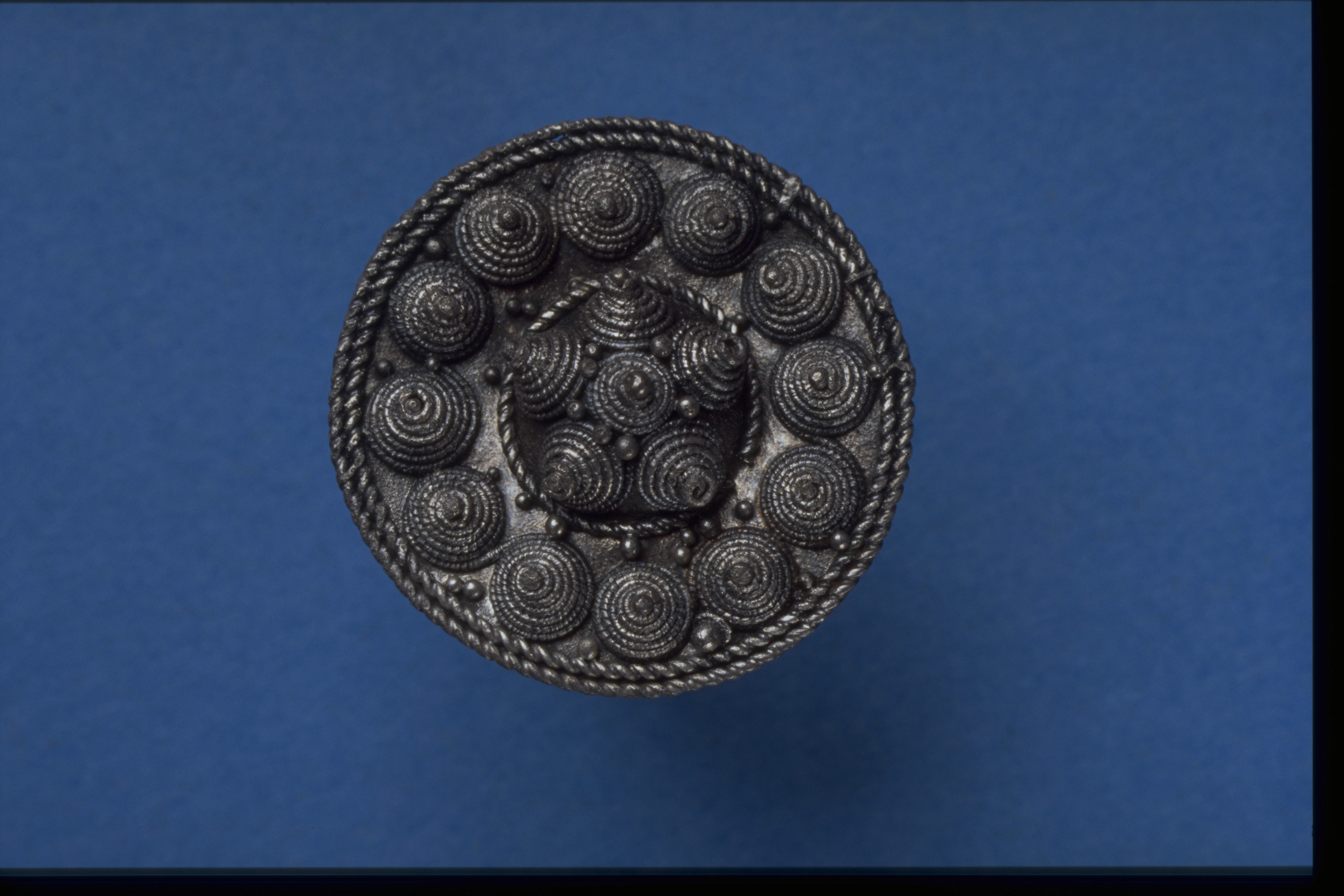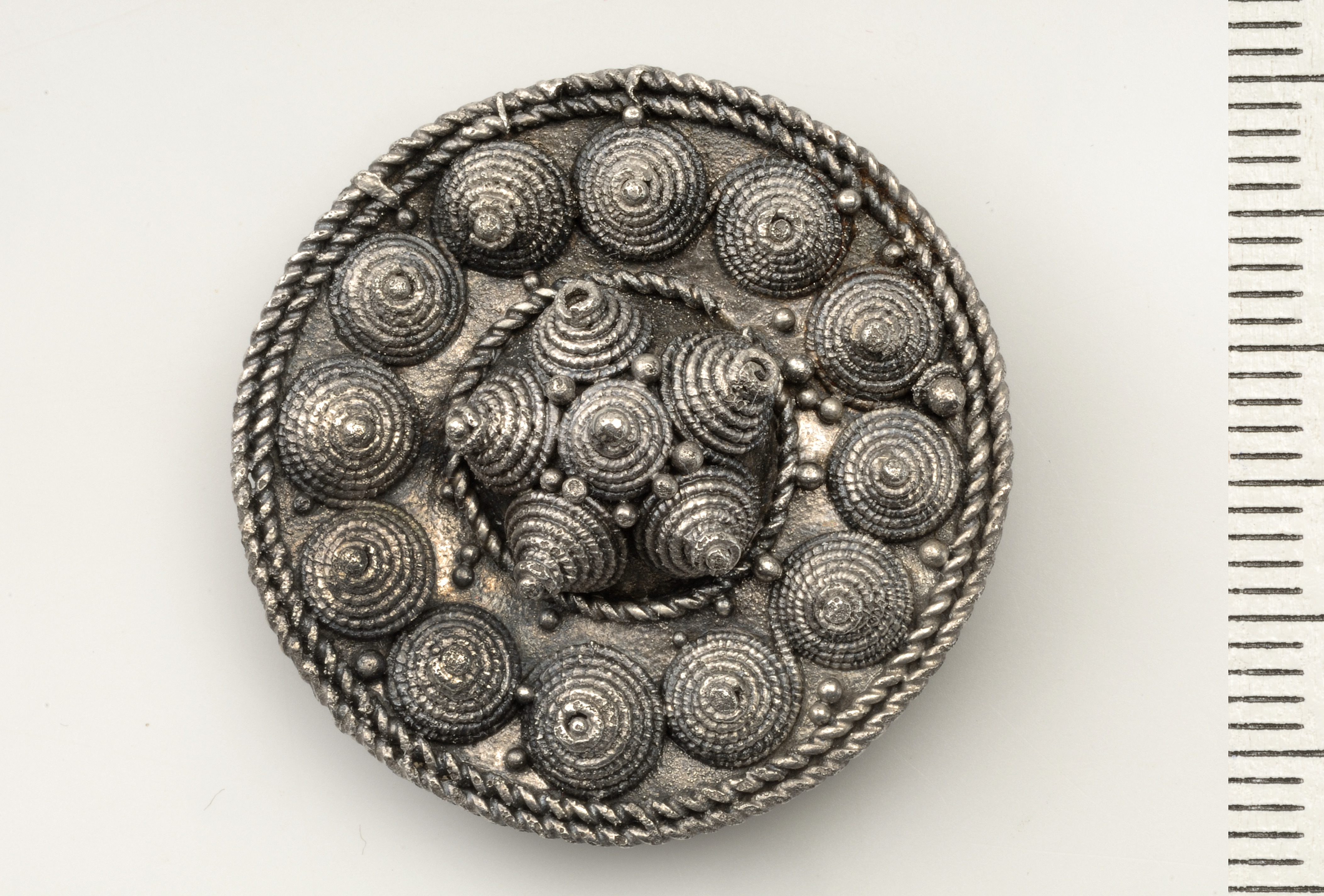 Rundspänne av silver med filigran.