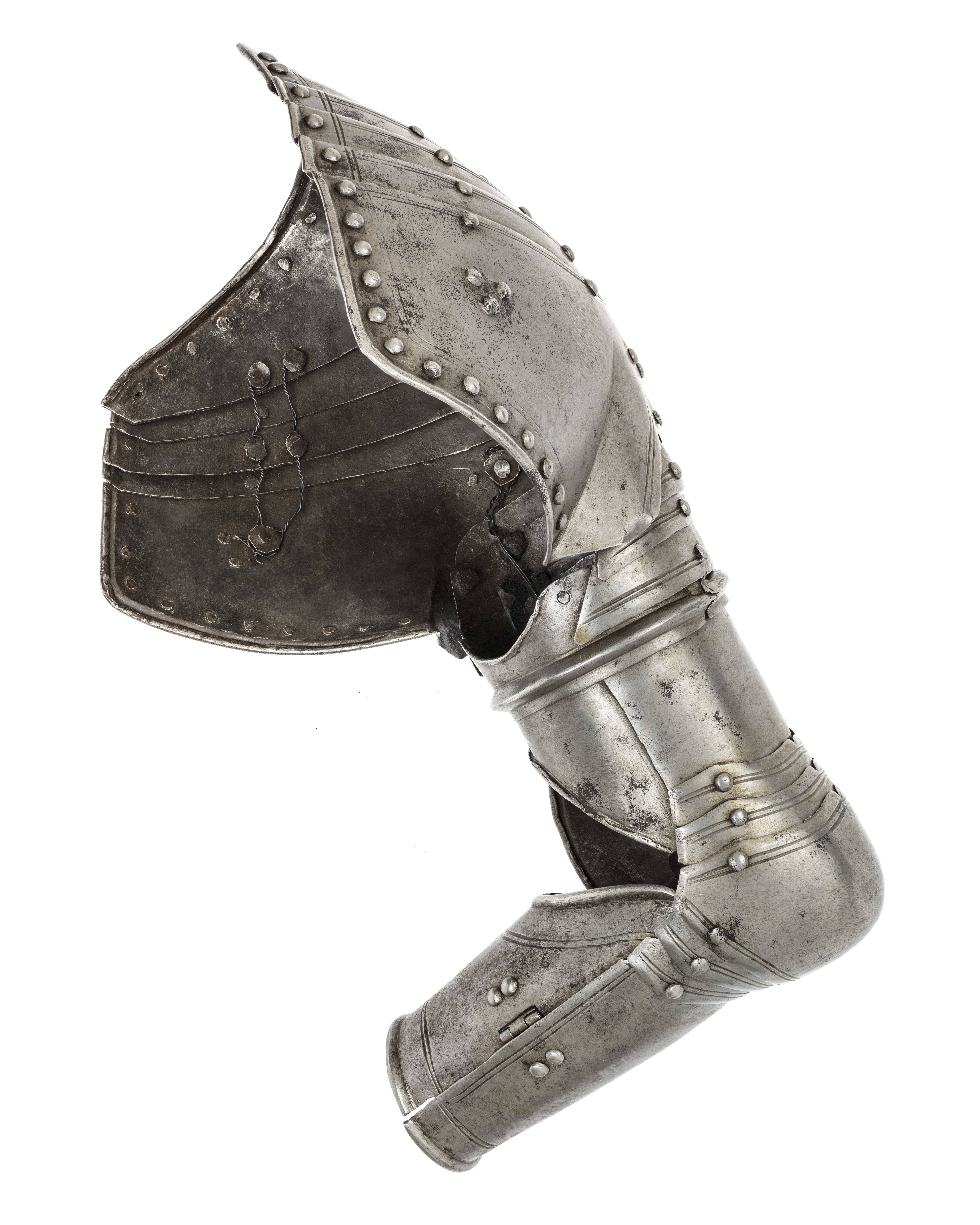 Driven stålplåt med blankslipad och polerad utsida. Sammanlagt 17 delar. Axelstycke av fem välvda skenor lada omlott med driven mittås. Utdragna över bröst och skuldra, bildandes en enhet. Översta skenan med rundad urtagning för halsen, djupare över bröstet. Över axeln en hake och ovanför denna ett rektangulärrt hål, 10 x 15 mm. Nedersta skenan med urtagning för armen med kanterna vinklade upp mot denna. Mörka läderband på insidan. Armskena av två skenor bildandes ett rör, sammanfogade i varandra genom rörlig led. I övre skenan tre mindre uppåt avsmalnande välvda skenor, placerade omlott och nitade i kanterna. Välvd armbuckla formad som rundad spets, inåt tvärt avslutad och utåt övergående i mussla med spetsoval form. Musslans spetsiga ytterkant svagt V-formig. Över och under bucklan två mindre skenor med övre kanterna svagt S-formade och i mitten V-formig urtagning. Underarmsskena av två välvda halvor bildandes ett rör. Nedåt avsmalnande och öppningsbar genom på insidan två gångjärn och mot utsidan tapp genom hål. Inre skenan mindre med övre kanten lutande snett utåt. Alla yttre kanter omvikta och rundsmidda. Enkel dekor av två skurna linjer och nitar i rad längs kanterna.