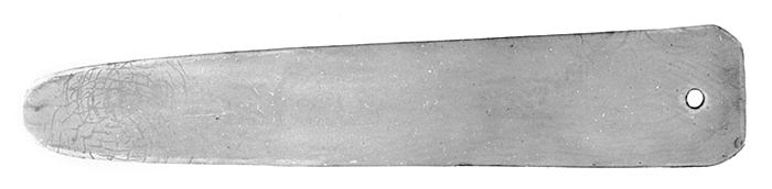 Tunn, tveeggad papperskniv s.k. falsbenden, avsmalnande från eggarna mot den rundade udden övre ändan tvär med fasade hörn; innanför övre ändan ett runt hål. Tillhört inventarierna i Wilhelm H. Kempes privata kontorsrum, inrymt i Schinkelska huset, dåvarande adress Kornhamnstorg 2 (nuvarande adress Kornhamnstorg 4), Stockholm.