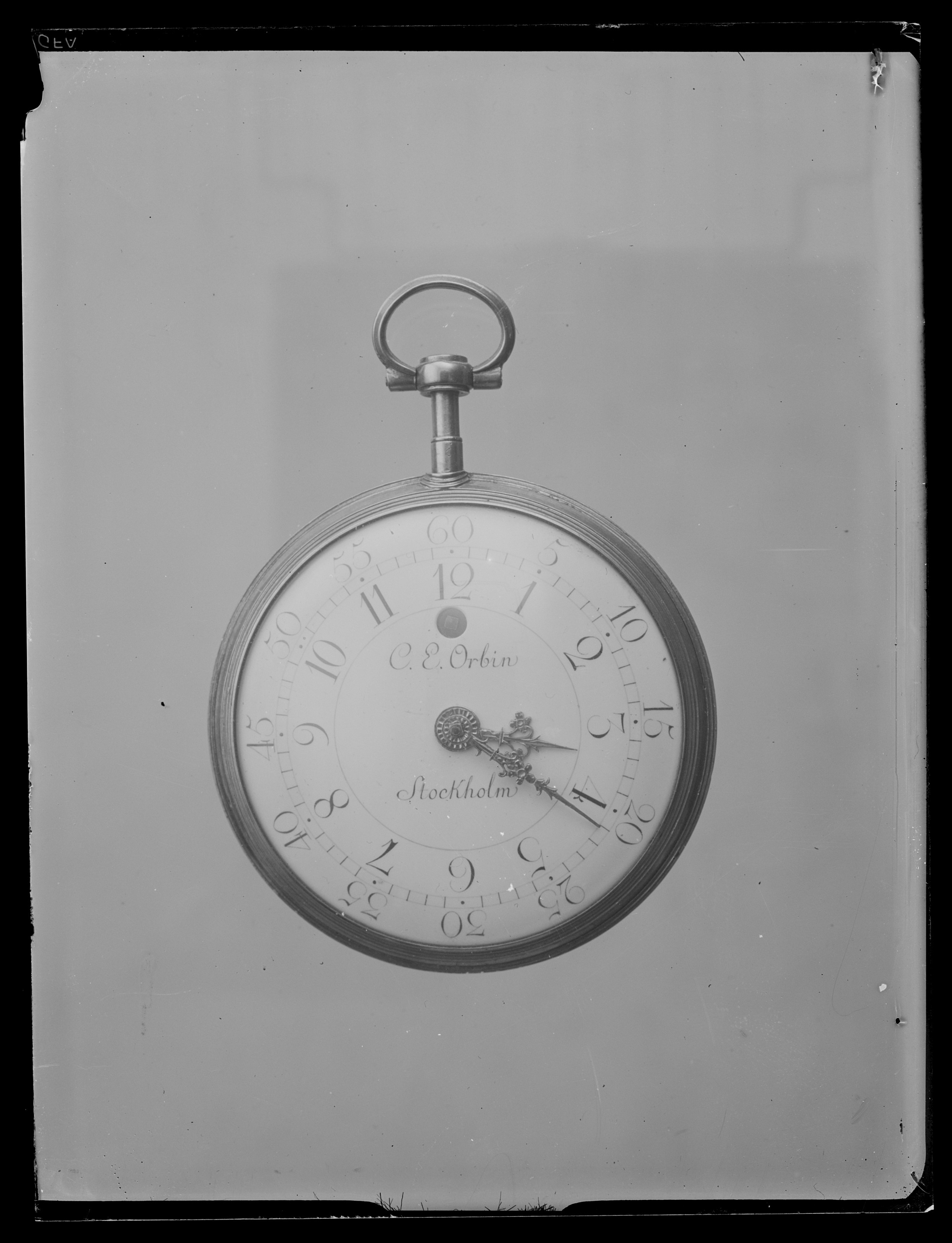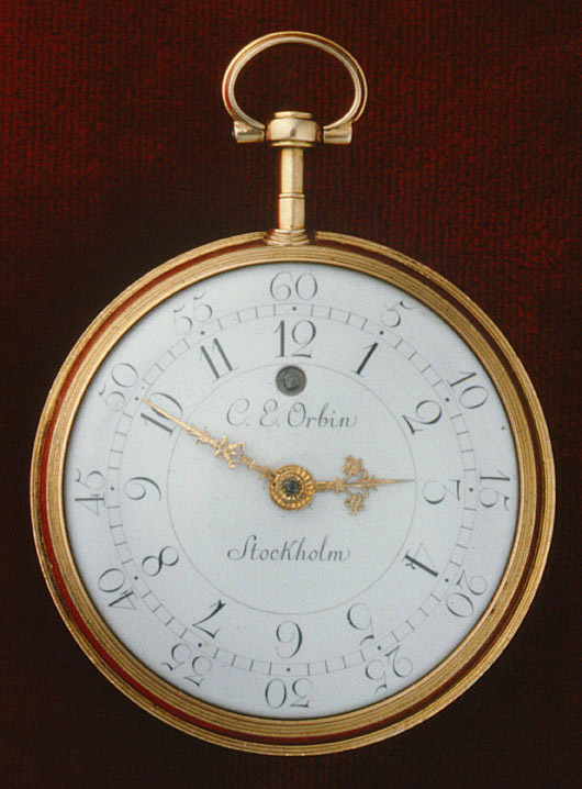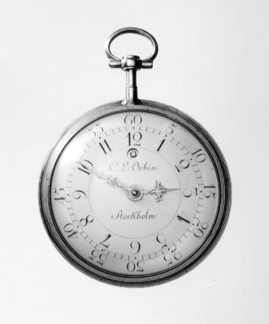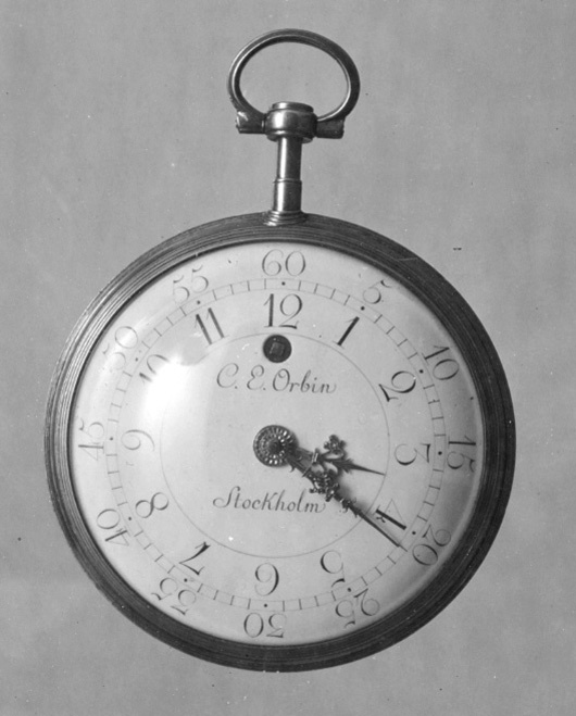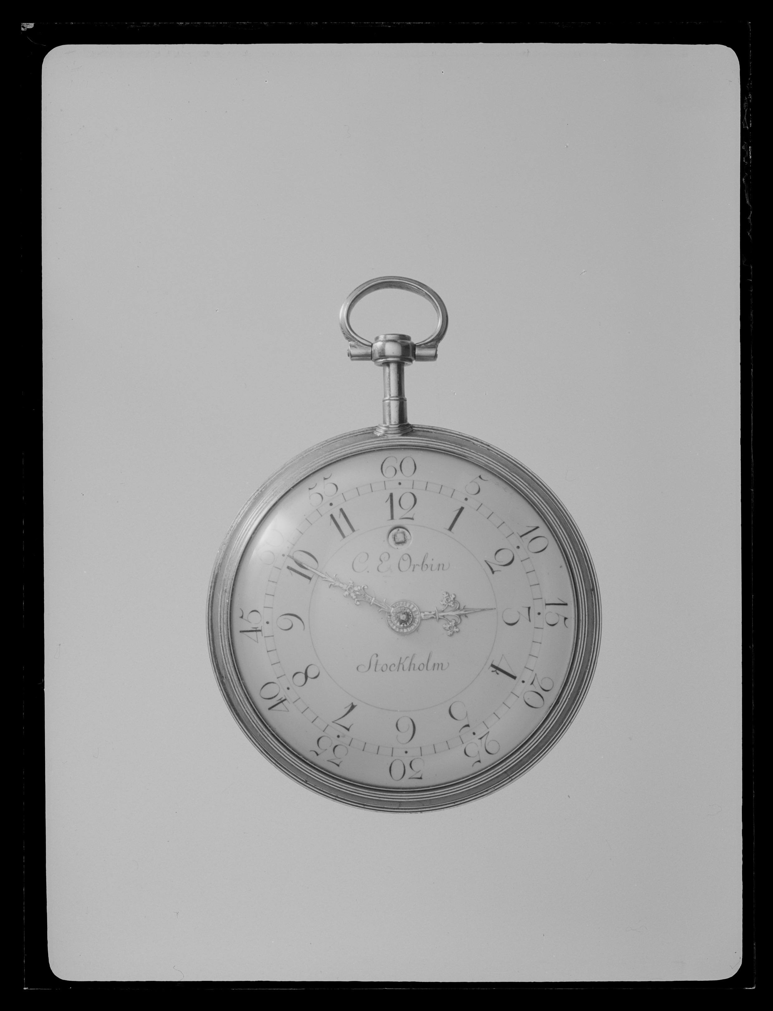 Förgyllt urverk med detaljer av blånerat stål, graverad signatur: "C.E.Orbin, Stockholm N.230". Vitemaljerad urtavla, gradering 1-12 och 5-60 i 5-stegsintervaller, arabiska siffror. Signering:"C.E.Orbin Stockholm". En uppdragningsaxel, två rikt konturerade, genombrutna visare av guld. Boett av guld, stämplad på den bakre halvans insida: tre kronor, S:t Erik, P S, Z, 18k (Peter Strömqvist, Stockholm 1782). Urtavlan täckt med kupigt glas, ram av guld, fäst med gångjärn vid v.kanten samt fjäderlås med knapp på stolpe i överkanten och regel vid h.kanten, vid stolpen dessutom fäst en oval ring. Urverket fäst med gångjärn vid överkanten, fjäderlås av stål vid nederkanten. Baksidan likaså täckt av kupigt glas, därbakom flätad matta av drottning Hedvig Elisabeth Charlottas hår (brunt).