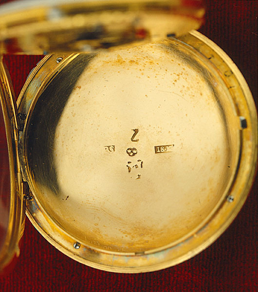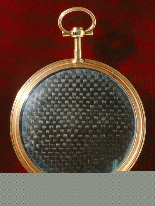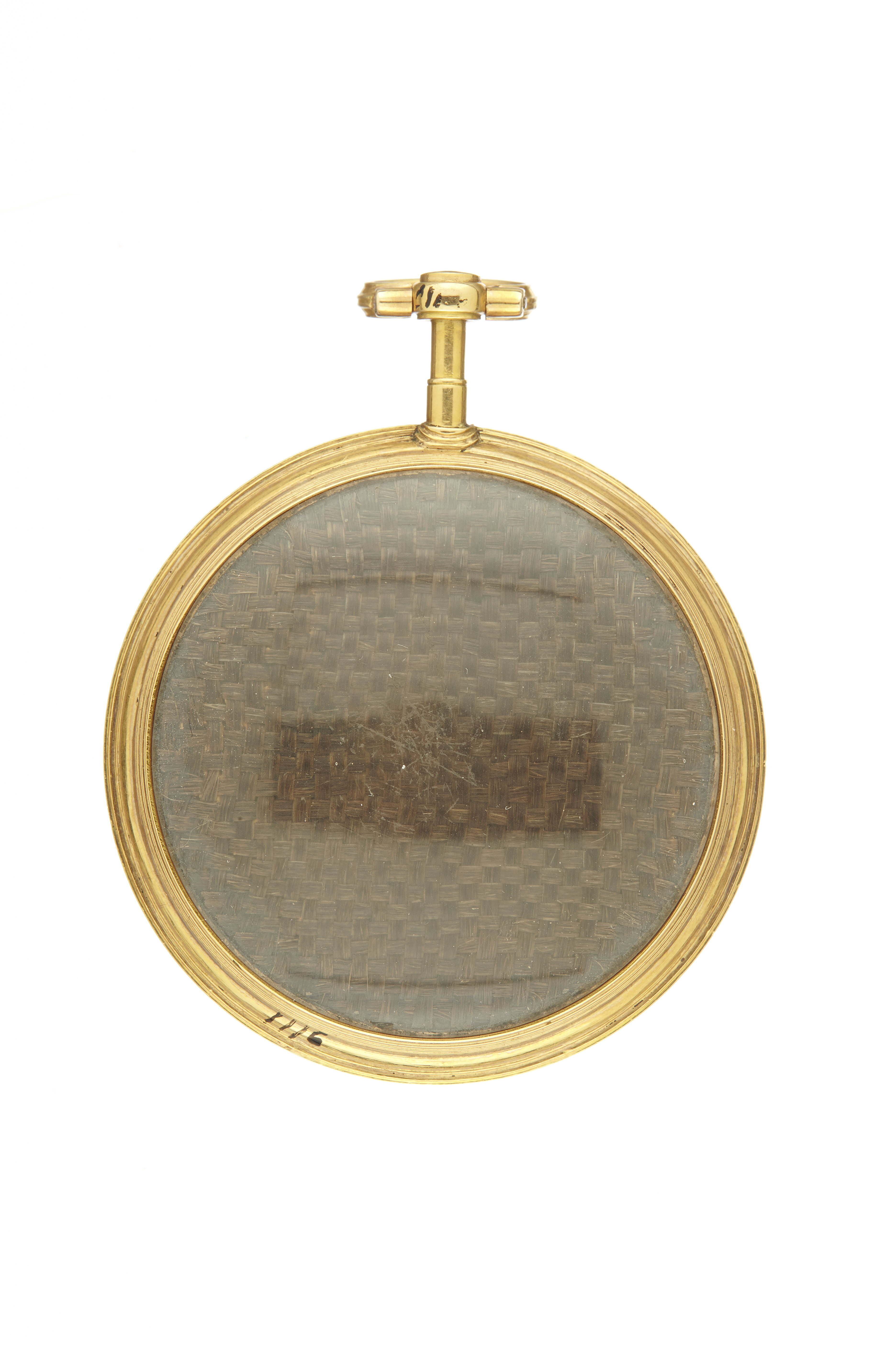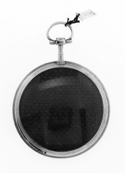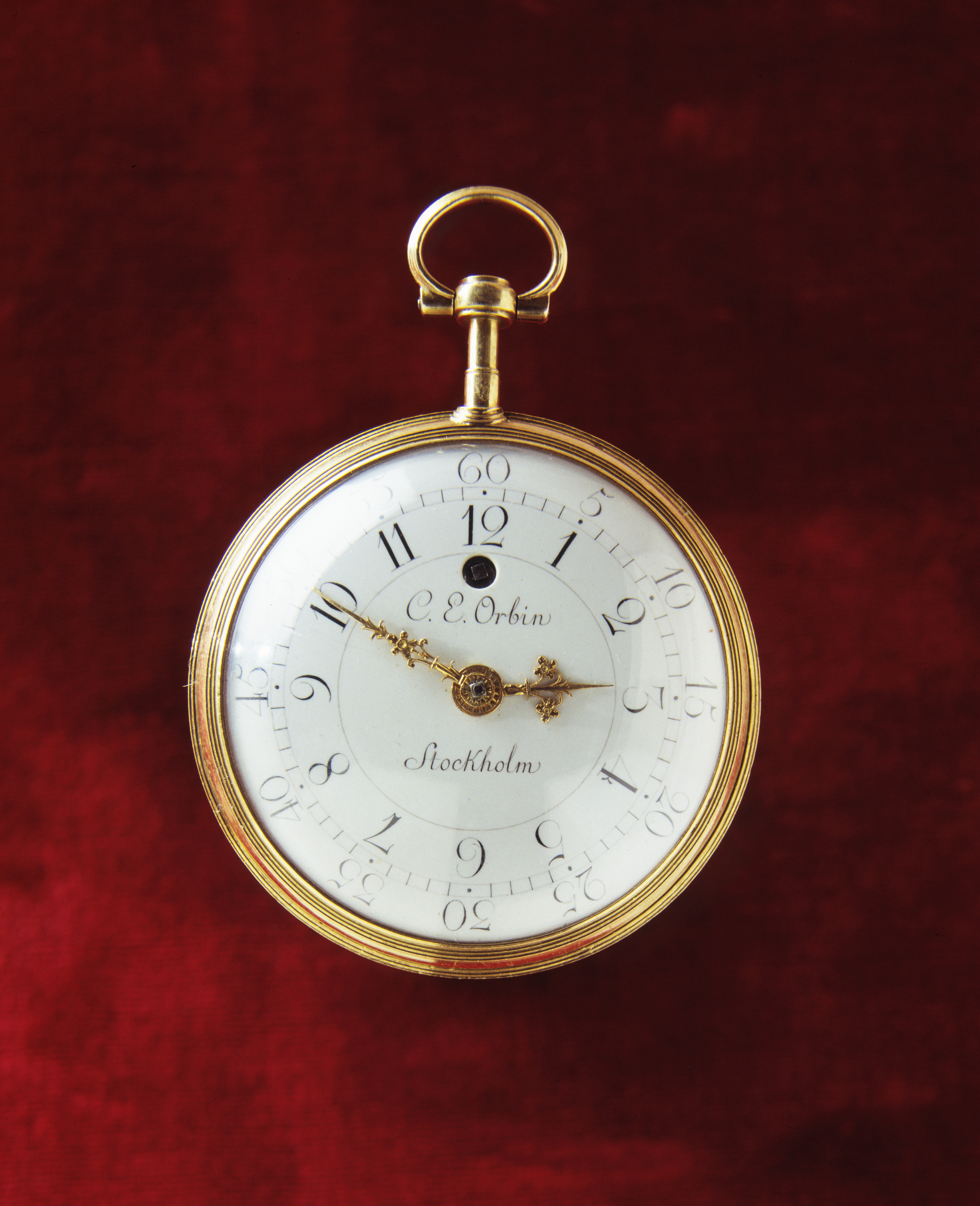 Förgyllt urverk med detaljer av blånerat stål, graverad signatur: "C.E.Orbin, Stockholm N.230". Vitemaljerad urtavla, gradering 1-12 och 5-60 i 5-stegsintervaller, arabiska siffror. Signering:"C.E.Orbin Stockholm". En uppdragningsaxel, två rikt konturerade, genombrutna visare av guld. Boett av guld, stämplad på den bakre halvans insida: tre kronor, S:t Erik, P S, Z, 18k (Peter Strömqvist, Stockholm 1782). Urtavlan täckt med kupigt glas, ram av guld, fäst med gångjärn vid v.kanten samt fjäderlås med knapp på stolpe i överkanten och regel vid h.kanten, vid stolpen dessutom fäst en oval ring. Urverket fäst med gångjärn vid överkanten, fjäderlås av stål vid nederkanten. Baksidan likaså täckt av kupigt glas, därbakom flätad matta av drottning Hedvig Elisabeth Charlottas hår (brunt).